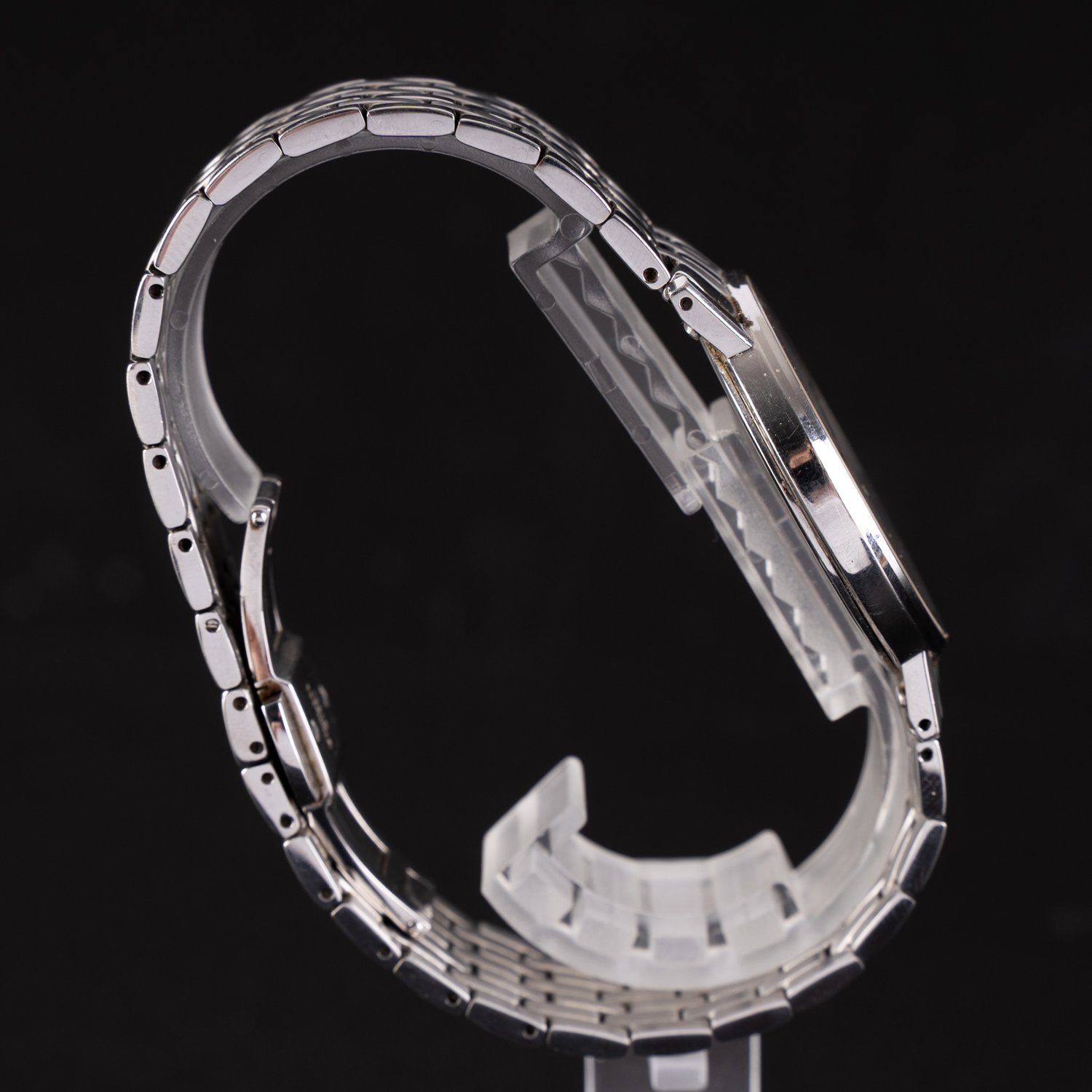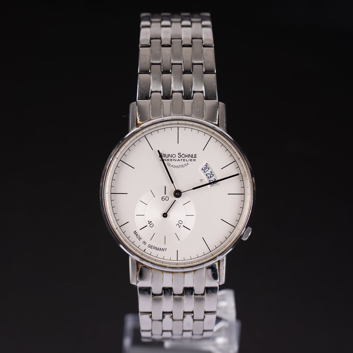 Bruno Söhnle Uhrenatelier, Glashütte in Sachsen, zeitlos elegante, runde Herrenarmbanduhr an Gliederarmband, Edelstahl, Saphirglas, Anzeige von Uhrzeit und Datum. Zeitloses Design. Modell: Rondo Big. Gehäuse Durchmesser ca. 38mm. Quartzwerk mit neuer Batterie bestückt, intakt. Sehr schöner getragener Erhalt.