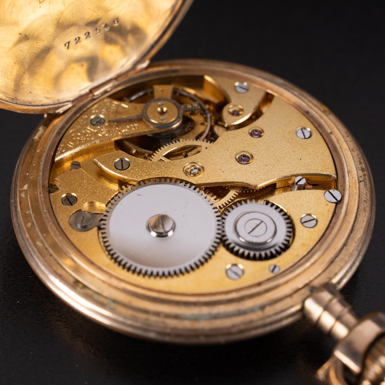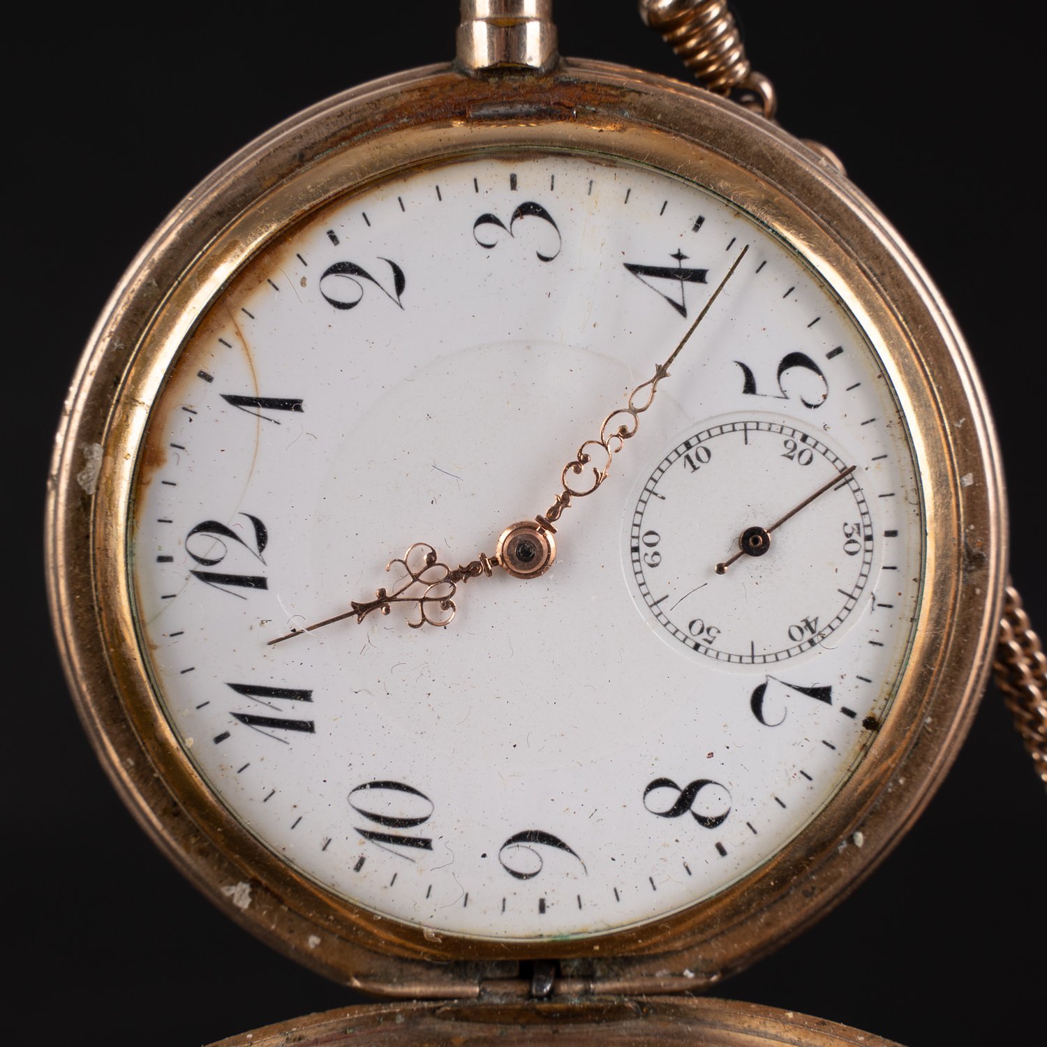 Savonette Taschenuhr, vergoldetes Gehäuse, mechanisches Uhrwerk mit Handaufzug, läuft an. Durchmesser ca. 5,1 cm. Erhaltungsmängel. Lange Uhrenkette (ca. 152 cm) beigegeben.