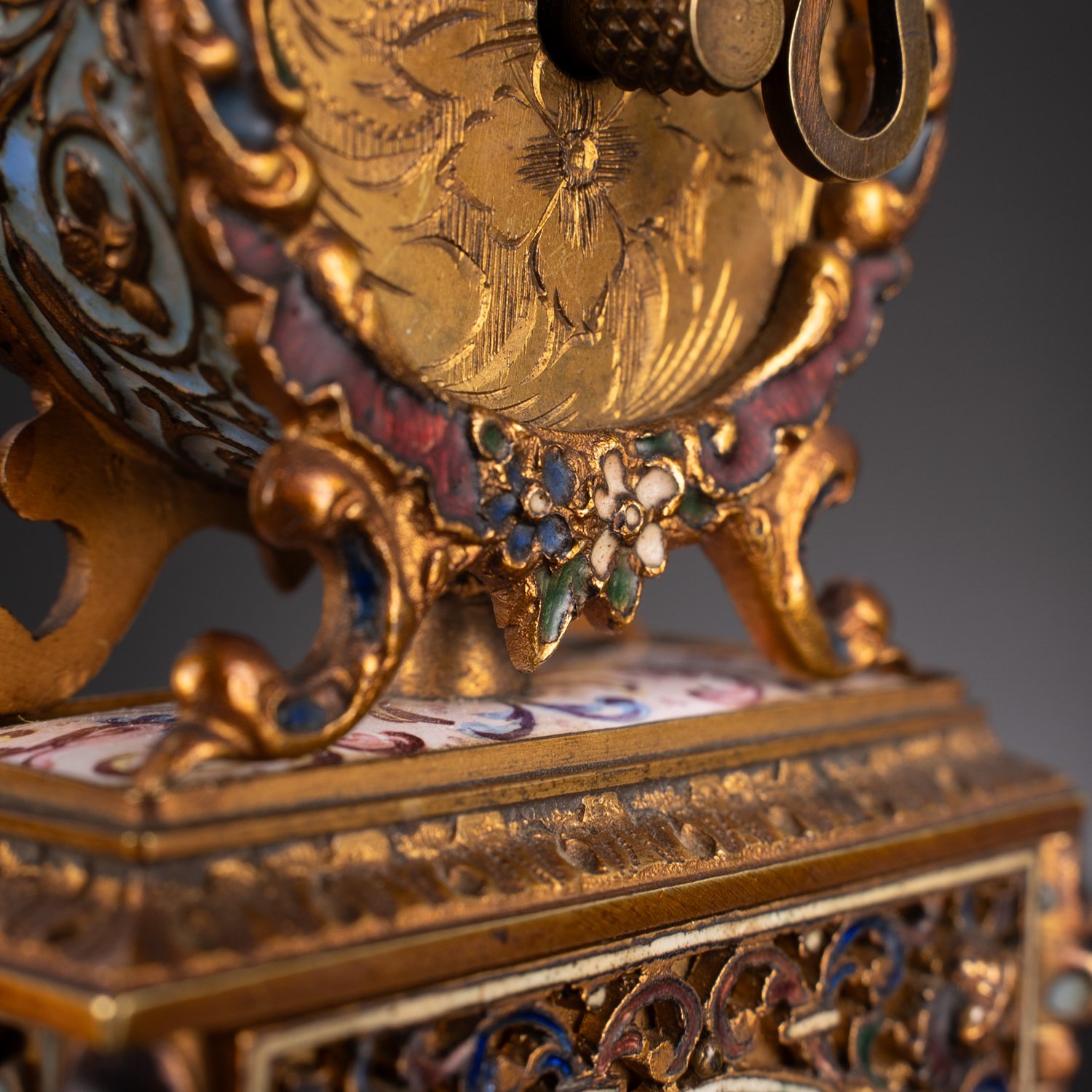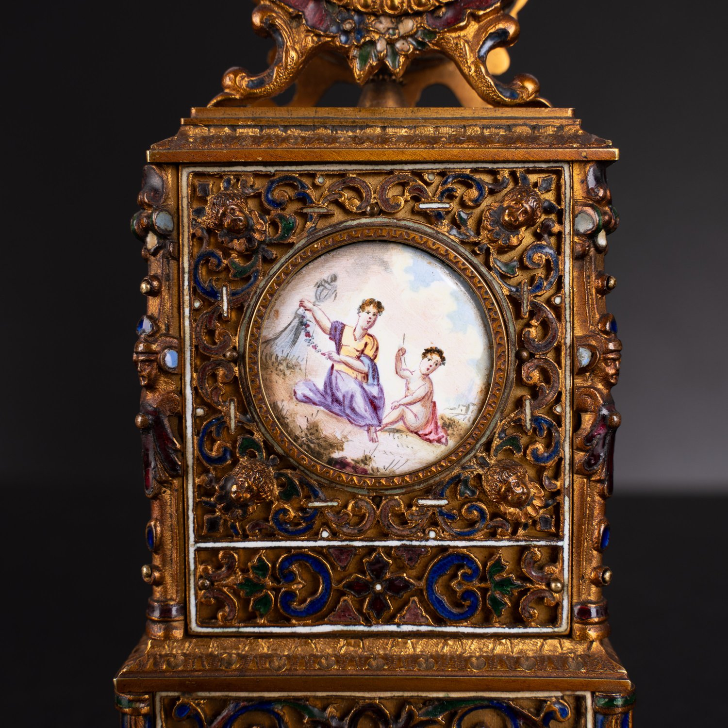 "Sehr seltene Wiener Miniatur - Standuhr der ""Belle-Epoque"", Gehäuse aus vergoldetem Messing, reiche Emaille-Dekore, teils plastisch erhabener Dekor, vorder- und rückseitig handbemalte ovale Medaillons, unterhalb des auf Rocaillenfüßen ruhenden, runden Uhrenkopfes, ebenfalls mit handbemalter, rechteckiger Fläche, die Uhr auf fein ausgearbeiteten, über Eck leicht vorspringenden Löwentatzen stehend. Ungeprüftes mechanisches Uhrwerk mit rückseitigem Handaufzug, das weiße Zifferblatt mit arabischen Zahlen, feiner Goldzier und teils durchbrochen gearbeiteten Zeigern. Wien der 1890er Jahre, sehr schöner Erhalt, äußerst detailreich staffiertes Kleinod, Höhe ca. 14 cm. Uhrwerk läuft an, wurde jedoch nicht auf Ganggenauigkeit geprüft."