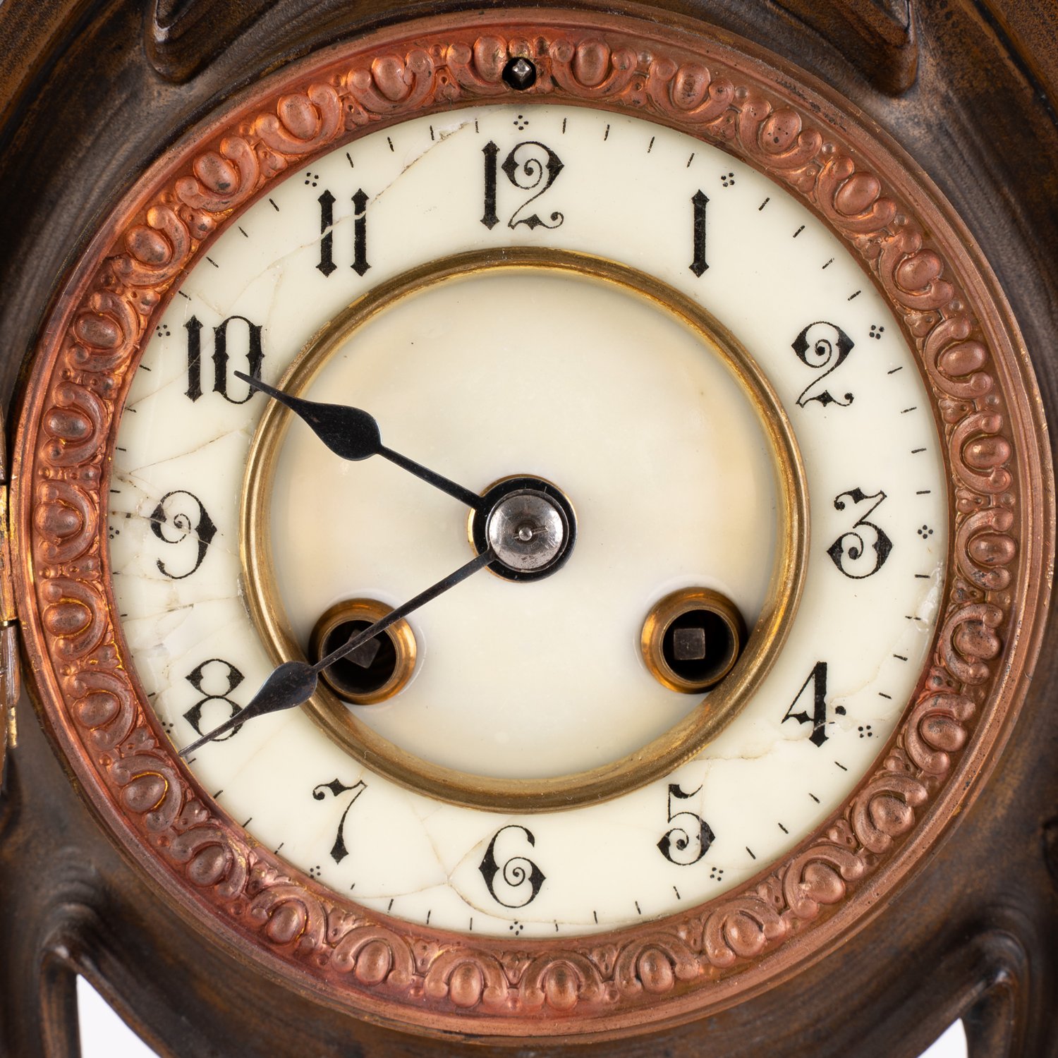 Prachtvolle Jugendstil - Kaminuhr, grünlicher Onyx, bräunlich patinierter, bronzierter Metallguss, florale Formgebung, um 1900 / 1920 ; ungeprüftes mechanisches Uhrwerk mit Schlag auf Glocke. Höhe ca. 49 cm ; Erhaltungsmängel ; Patina-Fundzustand.