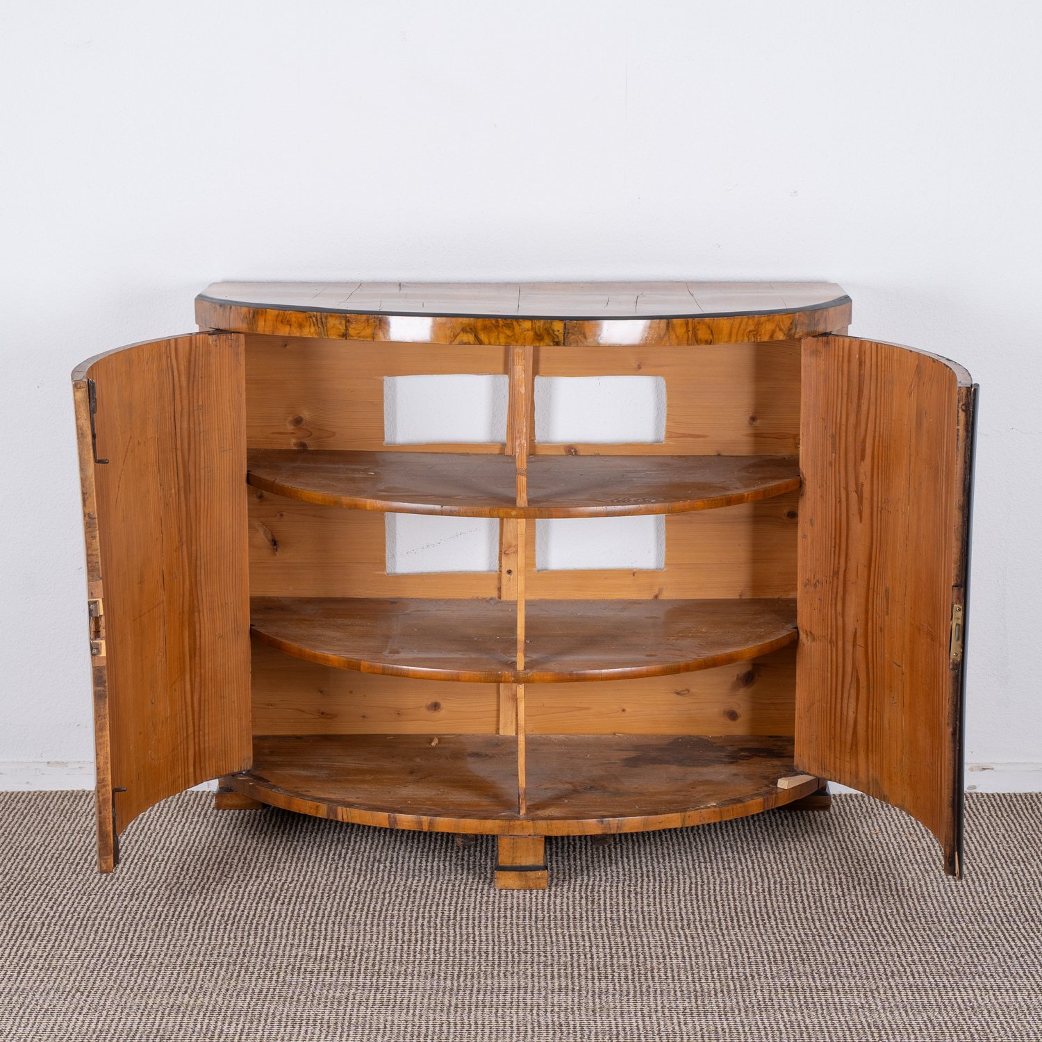 Zweitürige Demi-Lune Anrichte, sogenannte Trumeau, süddeutsch Biedermeier, um 1820 / 30, massiver Nadelholzkorpus mit ausgesuchtem Nussbaumholz furniert, partiell ebonisiert. Rückwand ergänzt, hier ausgesägte Öffnungen. Ältere Restauration, schöner Erhalt. ca. 96 x 112 x 55 cm.