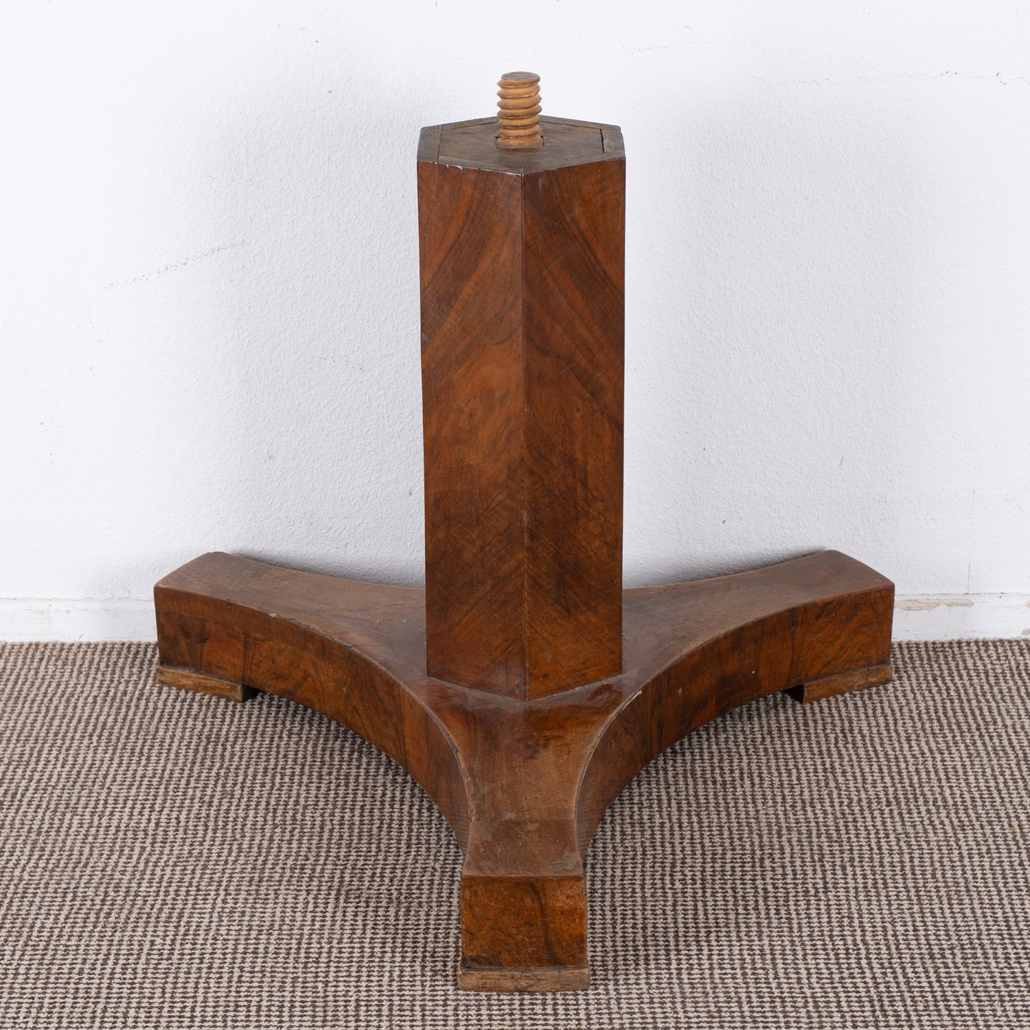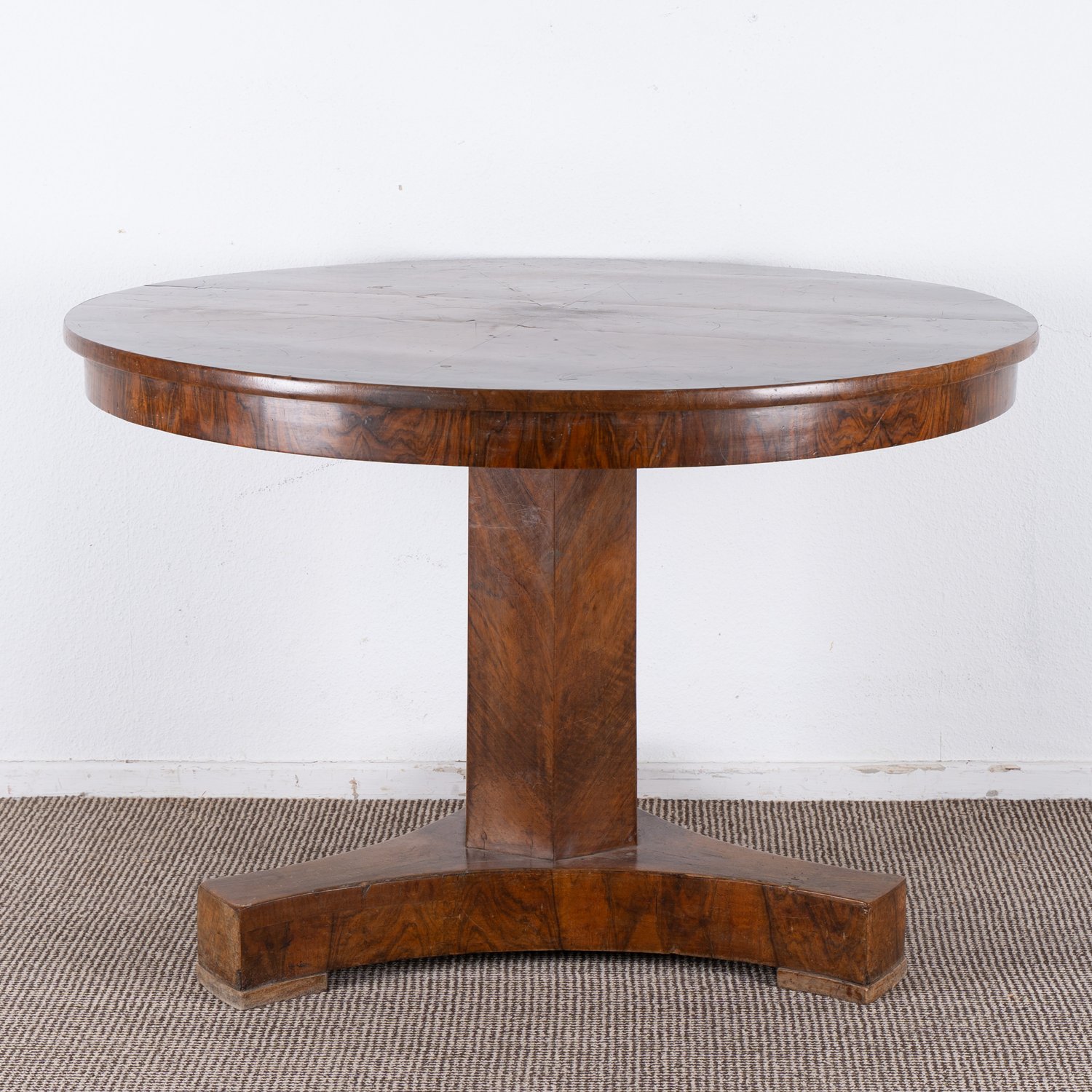 "Runder Esstisch, Biedermeier, wohl Hessen um 1820 / 30, Nussbaum und Nussbaumwurzelholz furniert, sehr schöner originaler Fundzustand, Platte mittels Holzgewinde ""abdrehbar"". Höhe ca. 77 Durchmesser ca. 115 cm."