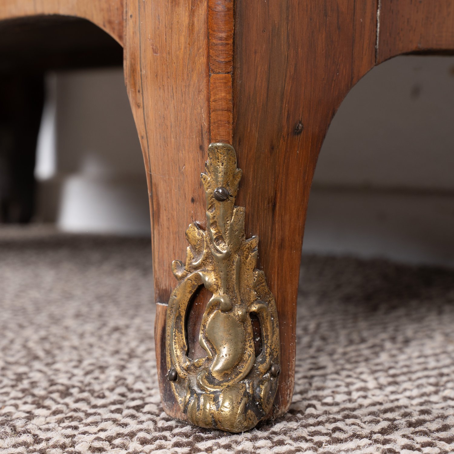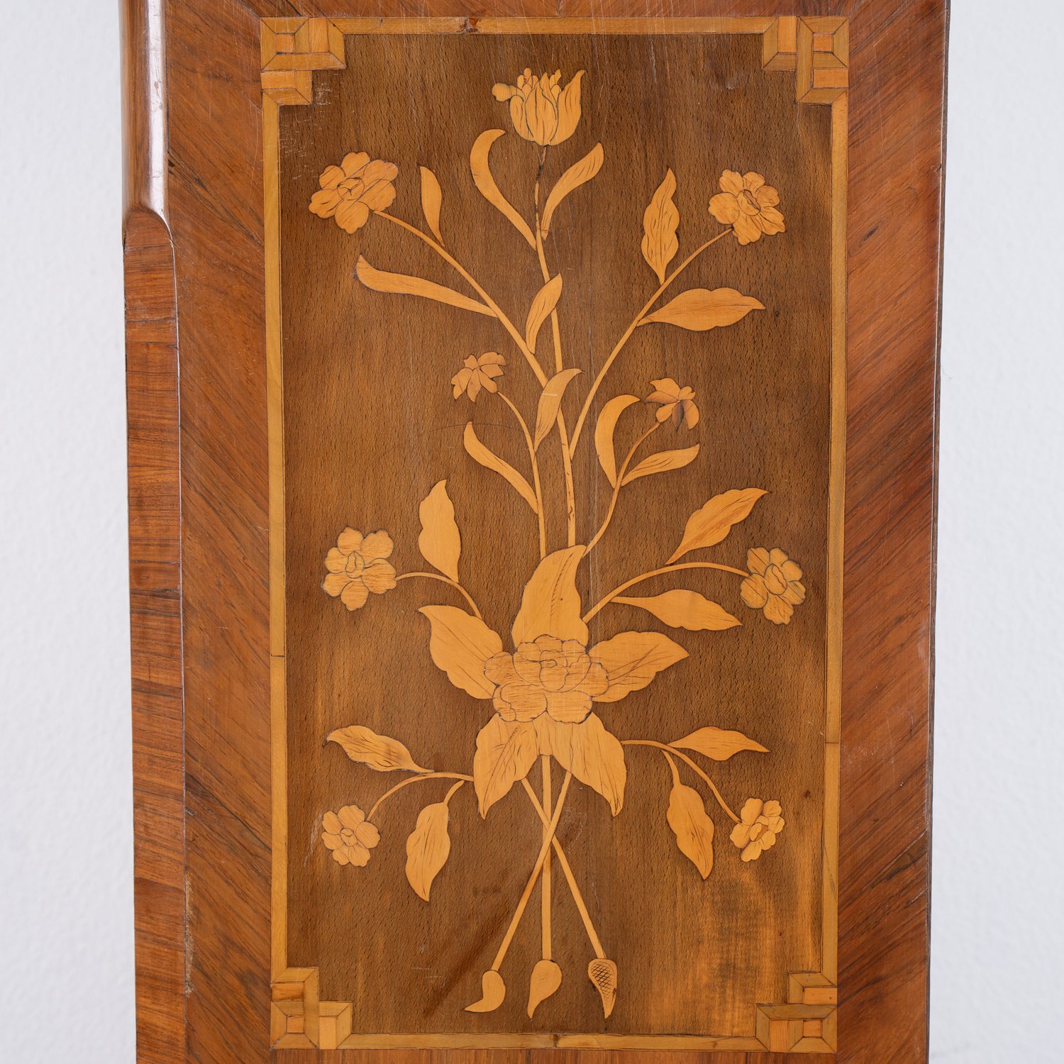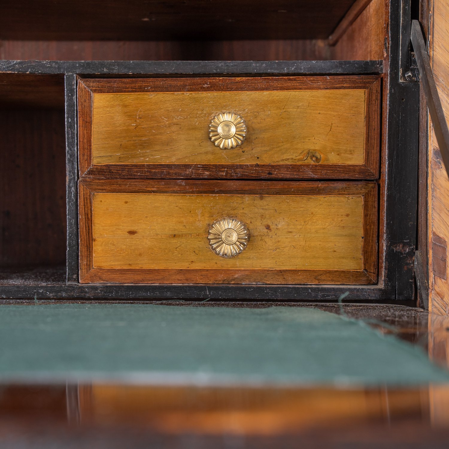 Eleganter Sekretär, Louis XVI, 19. / 20. Jhd., Nussbaum, reich intarsiertes, marketiertes, wohl französisches Schreibmöbel. Lose aufliegende profilierte Marmorplatte, dezentes Messingbeschlagwerk, guter, älter überarbeiteter Erhalt. Höhe ca. 141 Schreibhöhe ca. 75 Breite ca. 82 Tiefe ca. 38 bzw. 89 cm.