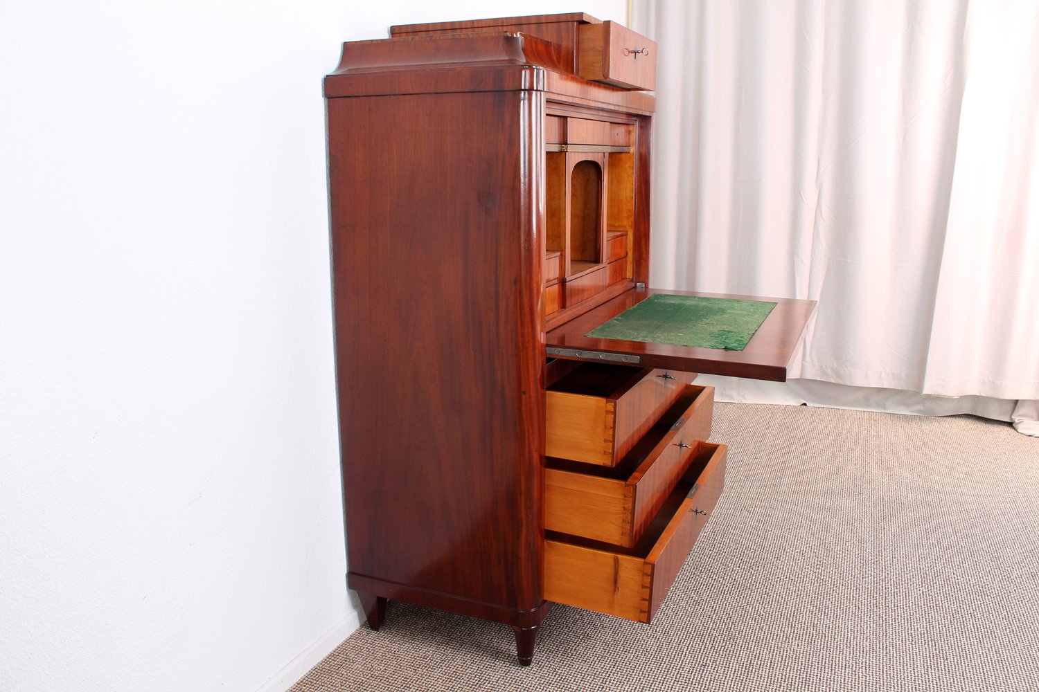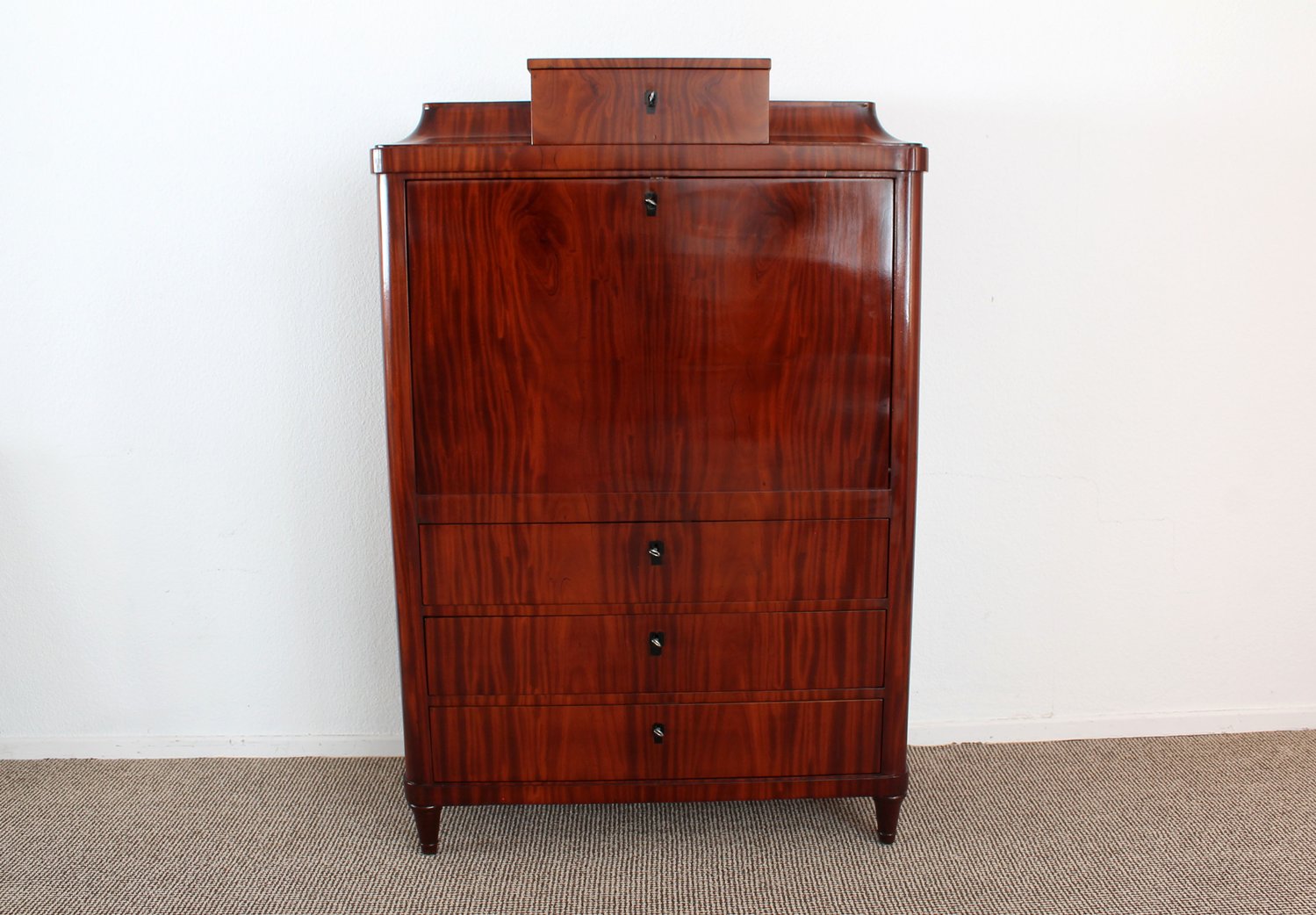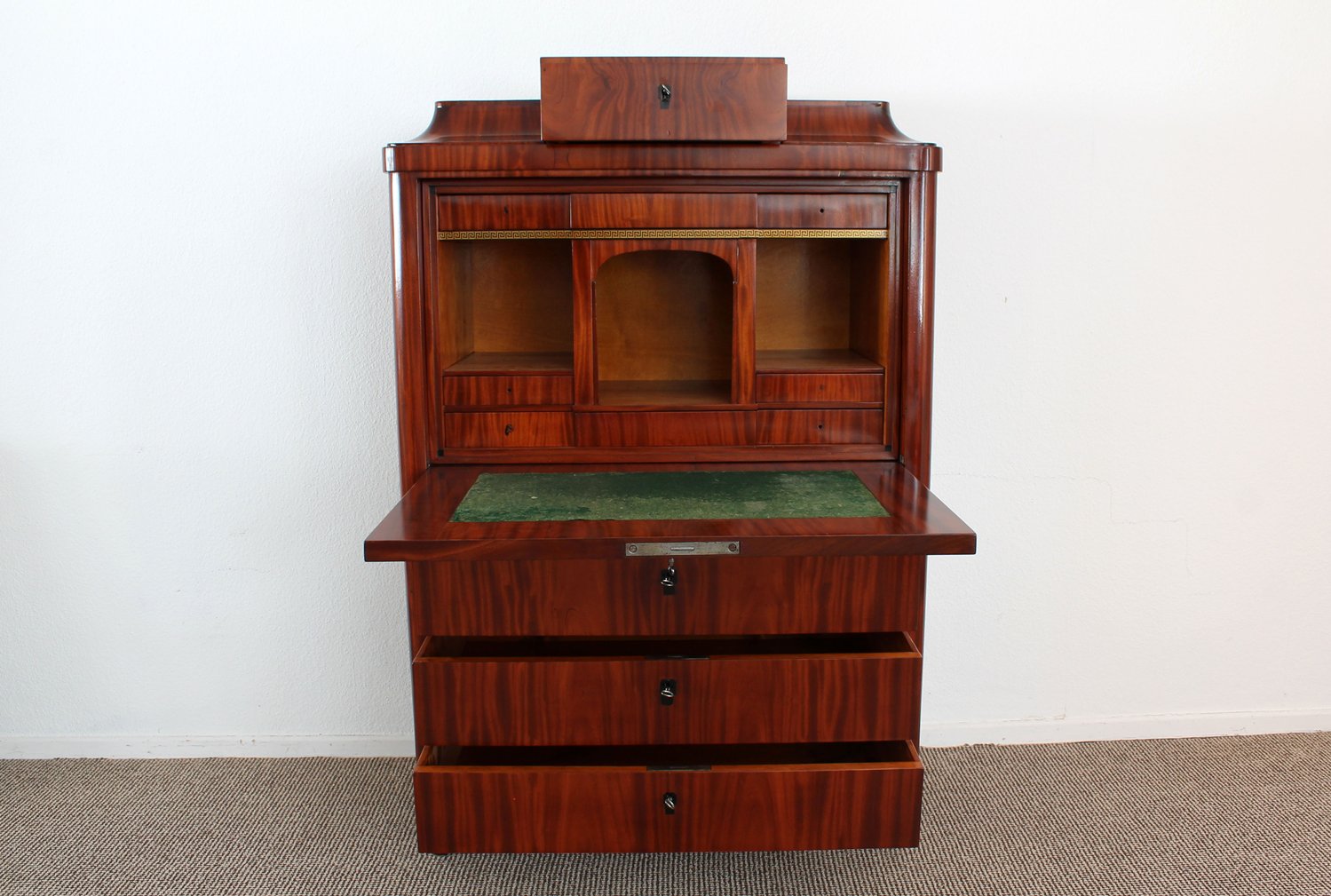 Antiker Sekretär, sogenannter Schreibschrank, Mahagoni massiv und auf Nadelholzkorpus furniert, Biedermeier deutsch um 1830 / 40. Frisch restauriertes und Schellack poliertes Schreibmöbel. Front mit aufrecht gespiegelten Furnierverlauf, eingesetzte ebonisierte Schlüsselschilder, abklappbare gerade Schreibplatte über 3-schübigem Unterbau, das Eingericht mit großer Kopfschublade über 3 getreppten offenen Fächern und insgesamt 5 kleineren Schüben, dezente Mäanderband-Bordüre in Messing auf ebonisiertem Grund, der ebenfalls getreppte obere Abschluss mit geräumigem Schubkasten, abgerundete Ecken, auf konisch zulaufenden Rundfüßen stehend. Neu angefertigte Schlüssel, Schlösser gereinigt und geölt, die Schreibfläche in Originalzustand, Höhe ca. 155 Schreibhöhe ca. 80 Breite ca. 103 Tiefe ca. 52,5 cm.