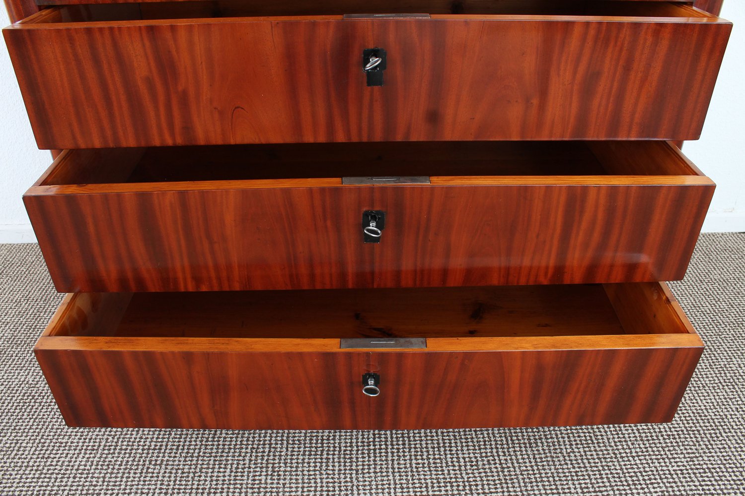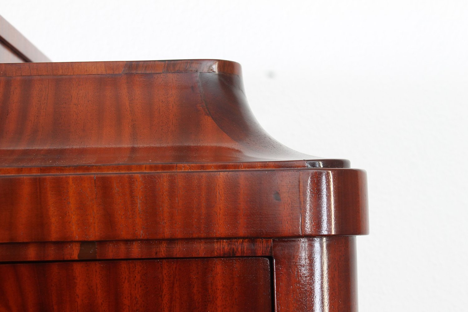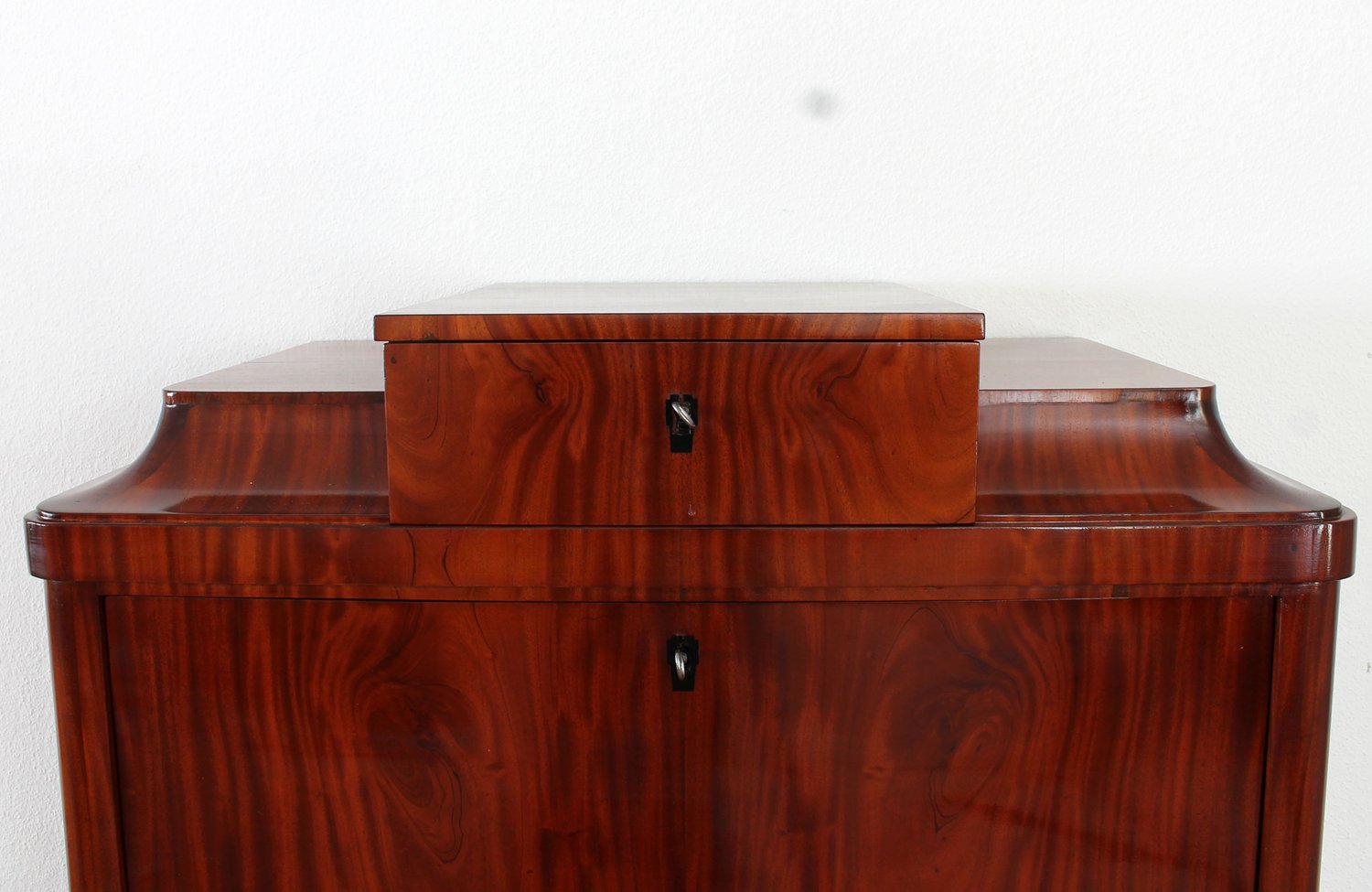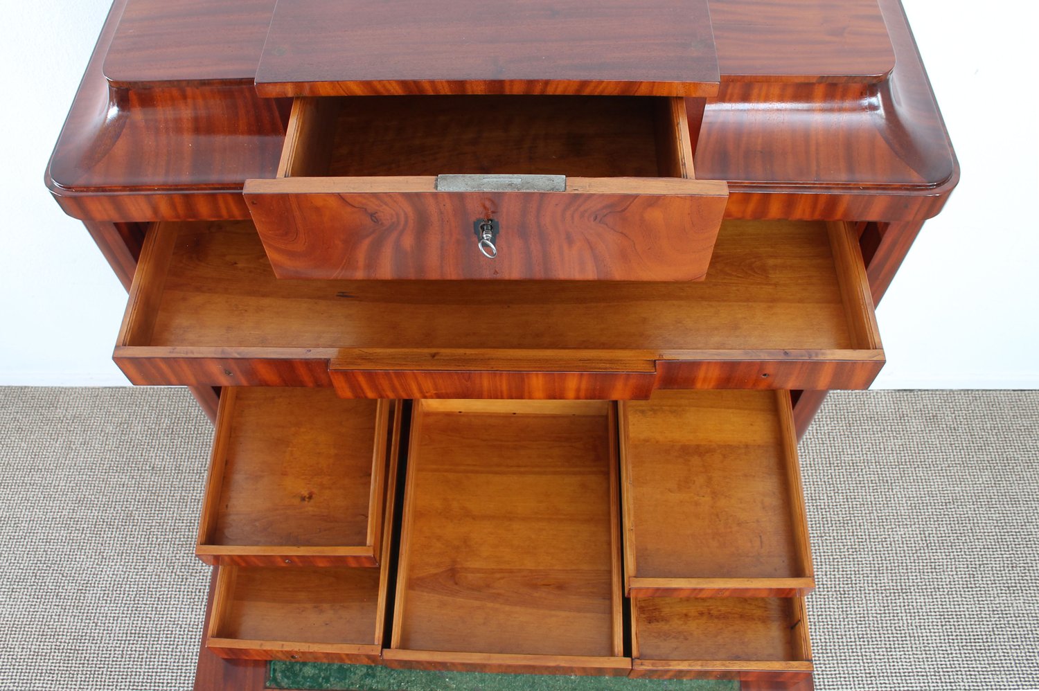 Antiker Sekretär, sogenannter Schreibschrank, Mahagoni massiv und auf Nadelholzkorpus furniert, Biedermeier deutsch um 1830 / 40. Frisch restauriertes und Schellack poliertes Schreibmöbel. Front mit aufrecht gespiegelten Furnierverlauf, eingesetzte ebonisierte Schlüsselschilder, abklappbare gerade Schreibplatte über 3-schübigem Unterbau, das Eingericht mit großer Kopfschublade über 3 getreppten offenen Fächern und insgesamt 5 kleineren Schüben, dezente Mäanderband-Bordüre in Messing auf ebonisiertem Grund, der ebenfalls getreppte obere Abschluss mit geräumigem Schubkasten, abgerundete Ecken, auf konisch zulaufenden Rundfüßen stehend. Neu angefertigte Schlüssel, Schlösser gereinigt und geölt, die Schreibfläche in Originalzustand, Höhe ca. 155 Schreibhöhe ca. 80 Breite ca. 103 Tiefe ca. 52,5 cm.