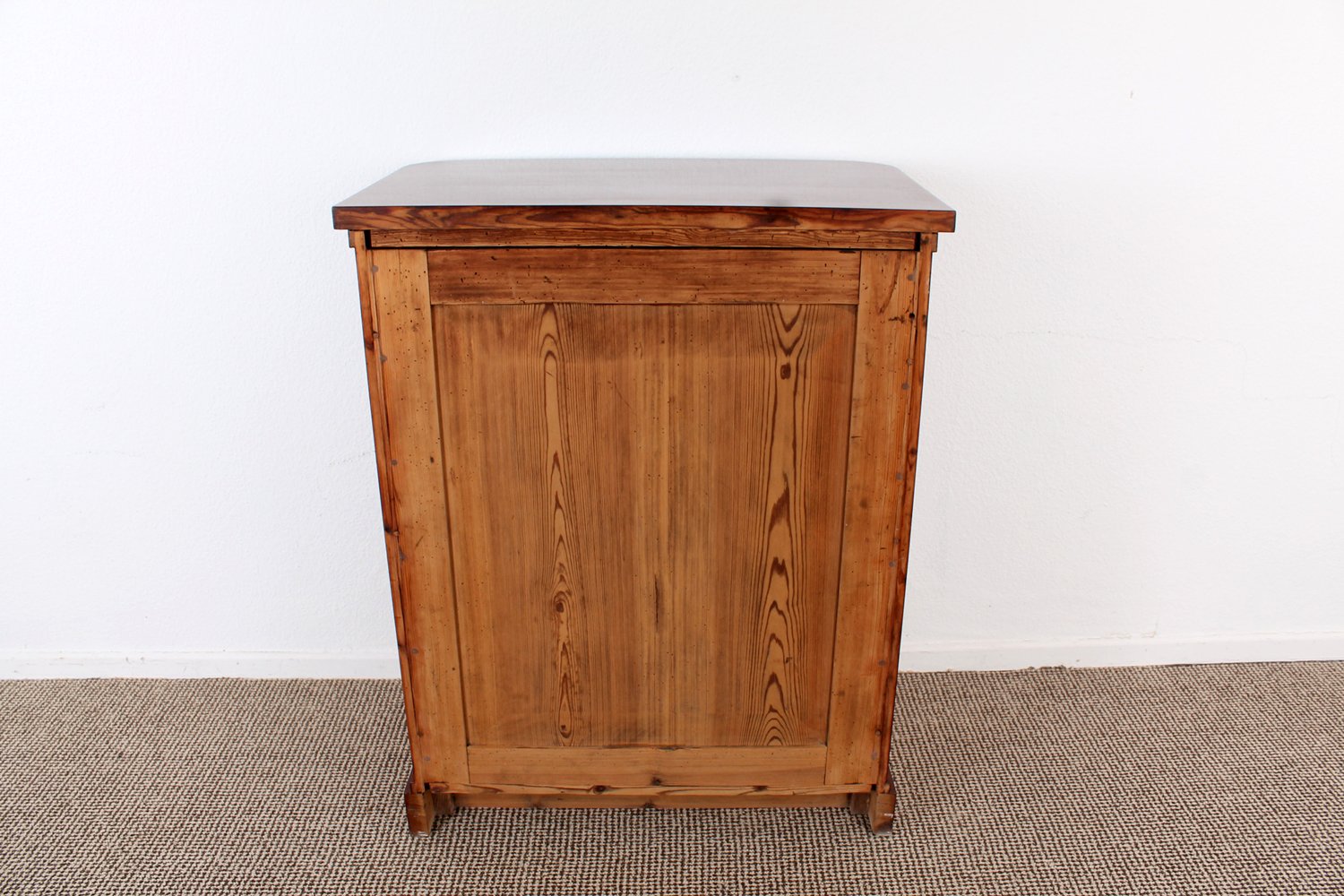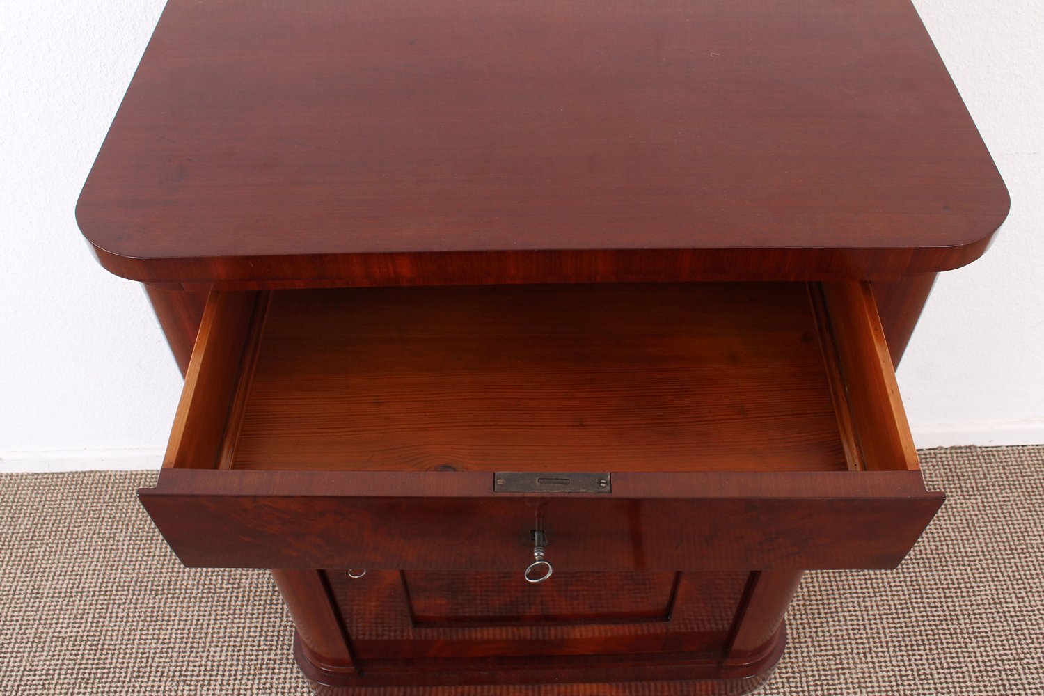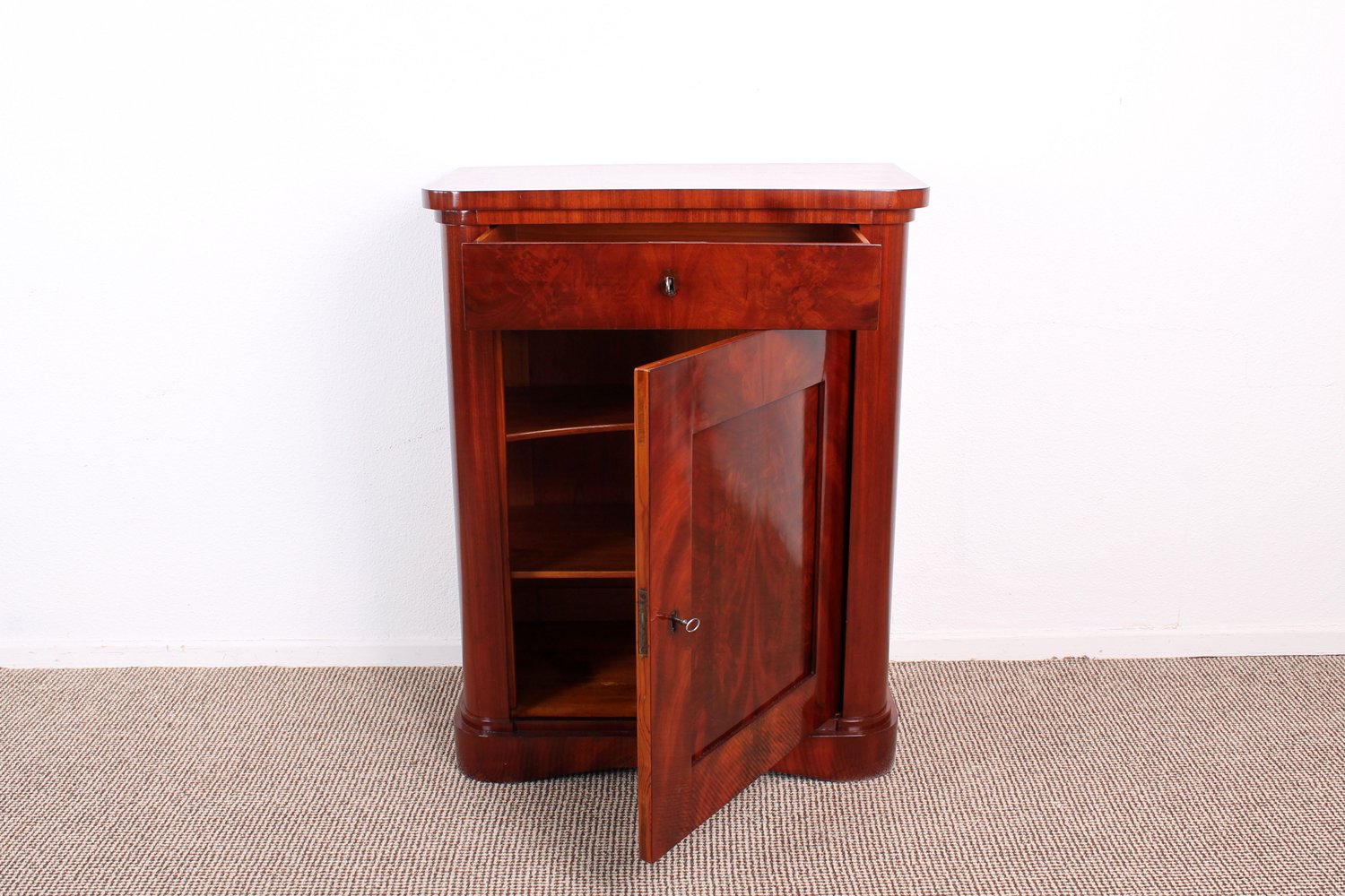 Großer Pfeilerschrank, Biedermeier Berlin / Brandenburg um 1830/ 40. Mahagoni massiv und auf Nadelholzkorpus furniert. Eintüriger Korpus mit geräumiger Schublade über dezent überstehender Deckplatte, kassettierte Türfüllung, abgerundete Ecken. Vor wenigen Monaten frisch restaurierter originaler Erhaltungszustand, Innenraum mit 2 Einlegeböden, ergänzte Eisenschlüssel, Schlösser gereinigt und geölt, ca. 97 x 77 x 45 cm.