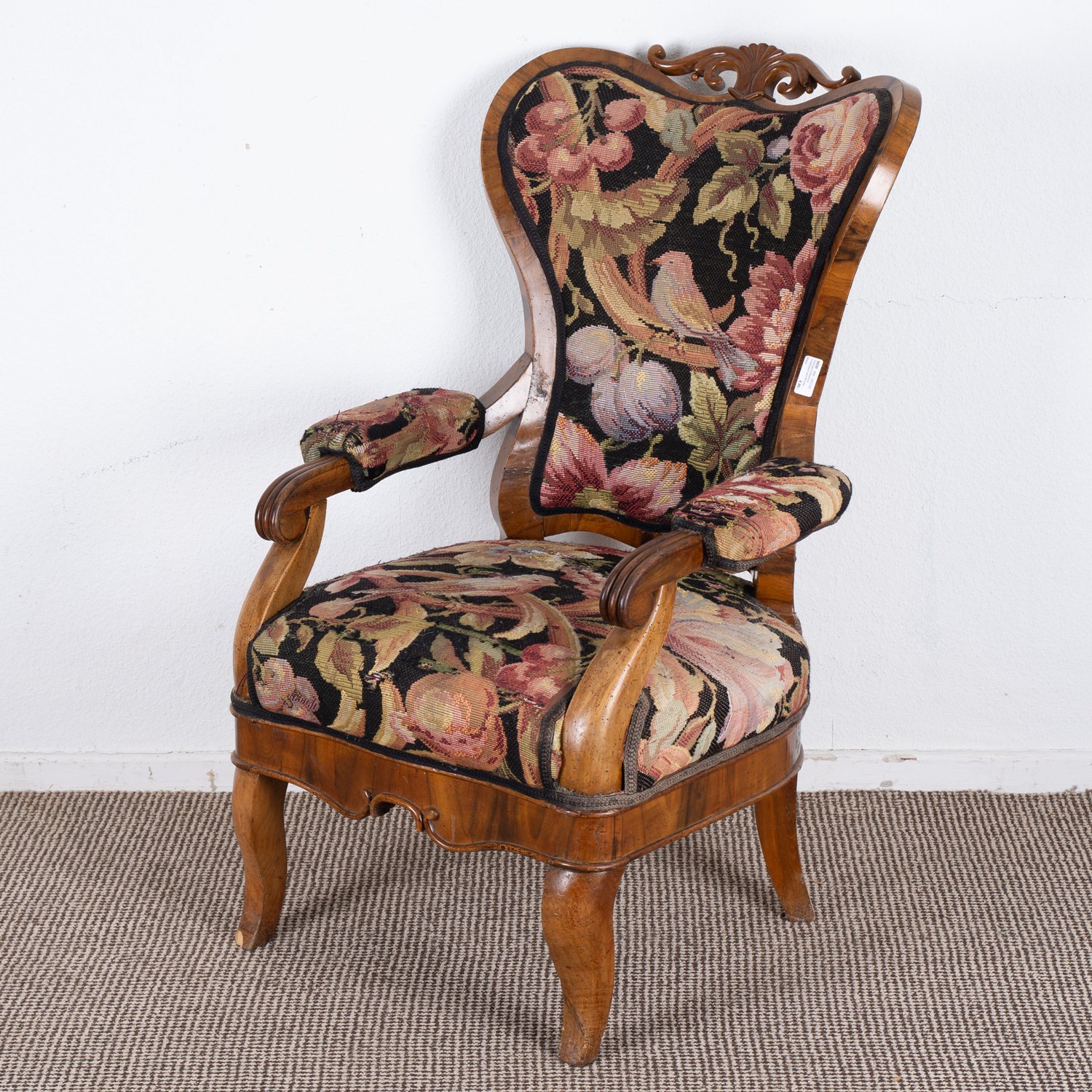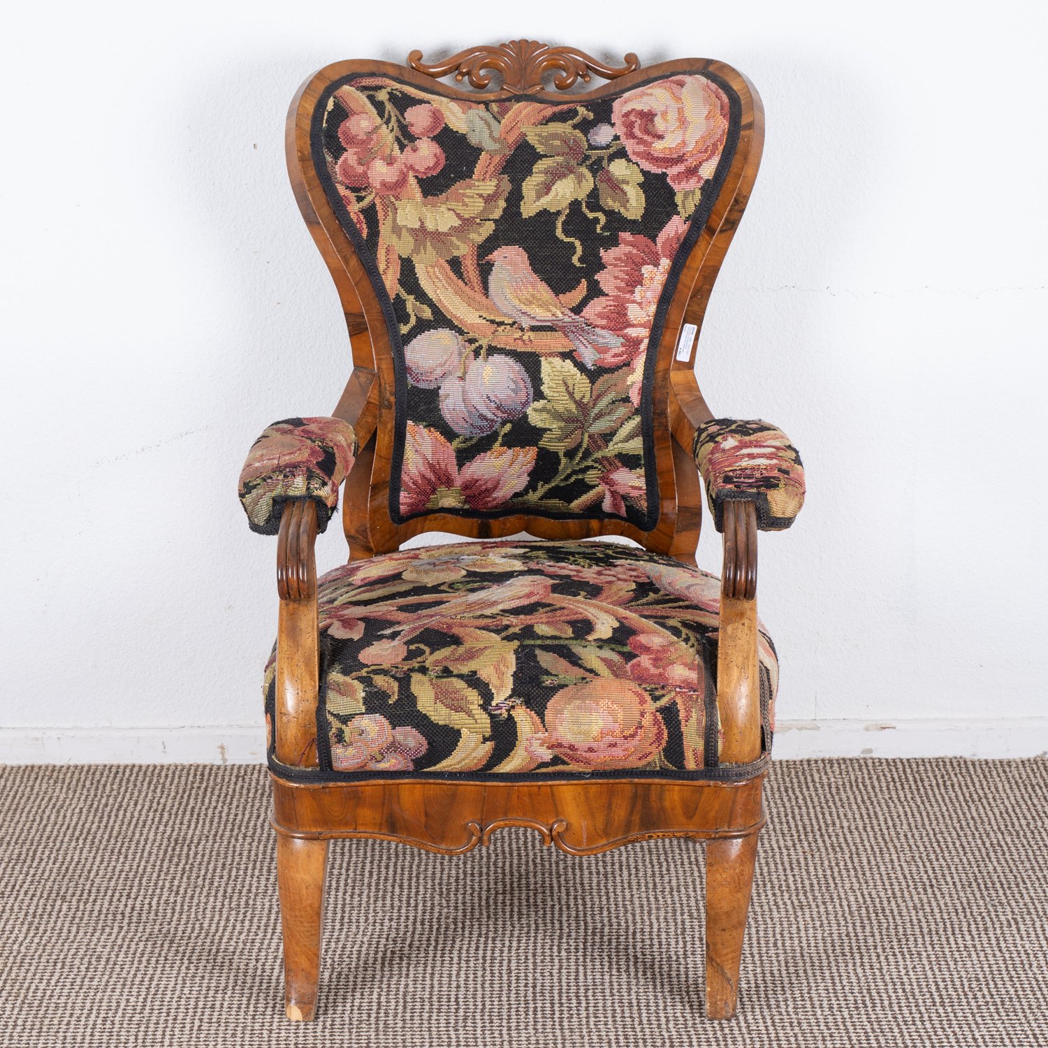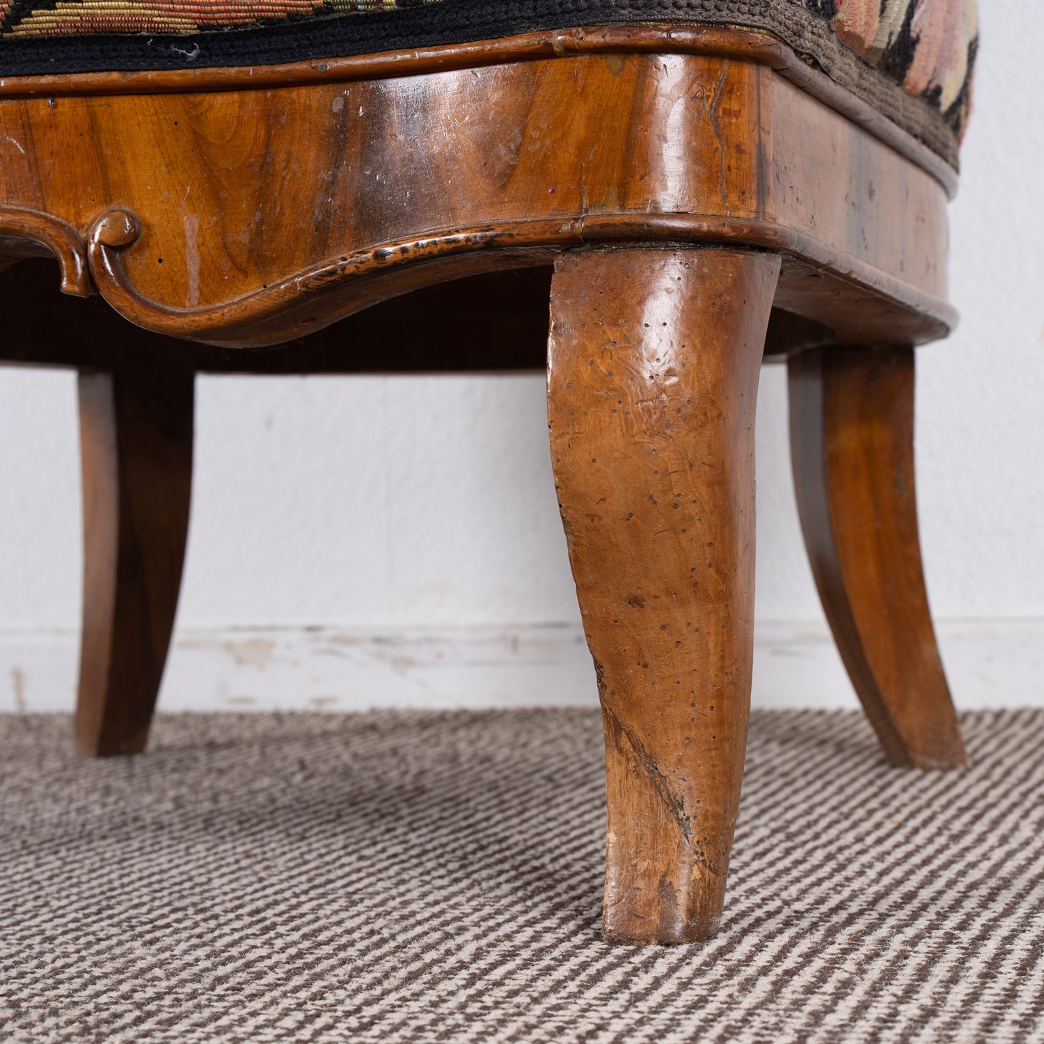 Prächtiger süddeutscher Polstersessel, wohl München um 1840 / 50, Nussbaum massiv und furniert, ergonomisch geformter, gebogener Rücken, abgerundete Sitzfläche, schöner unrestaurierter Fundzustand, originale Bezugstoffe. Lehnenhöhe ca. 102 Sitzhöhe ca. 44 cm.