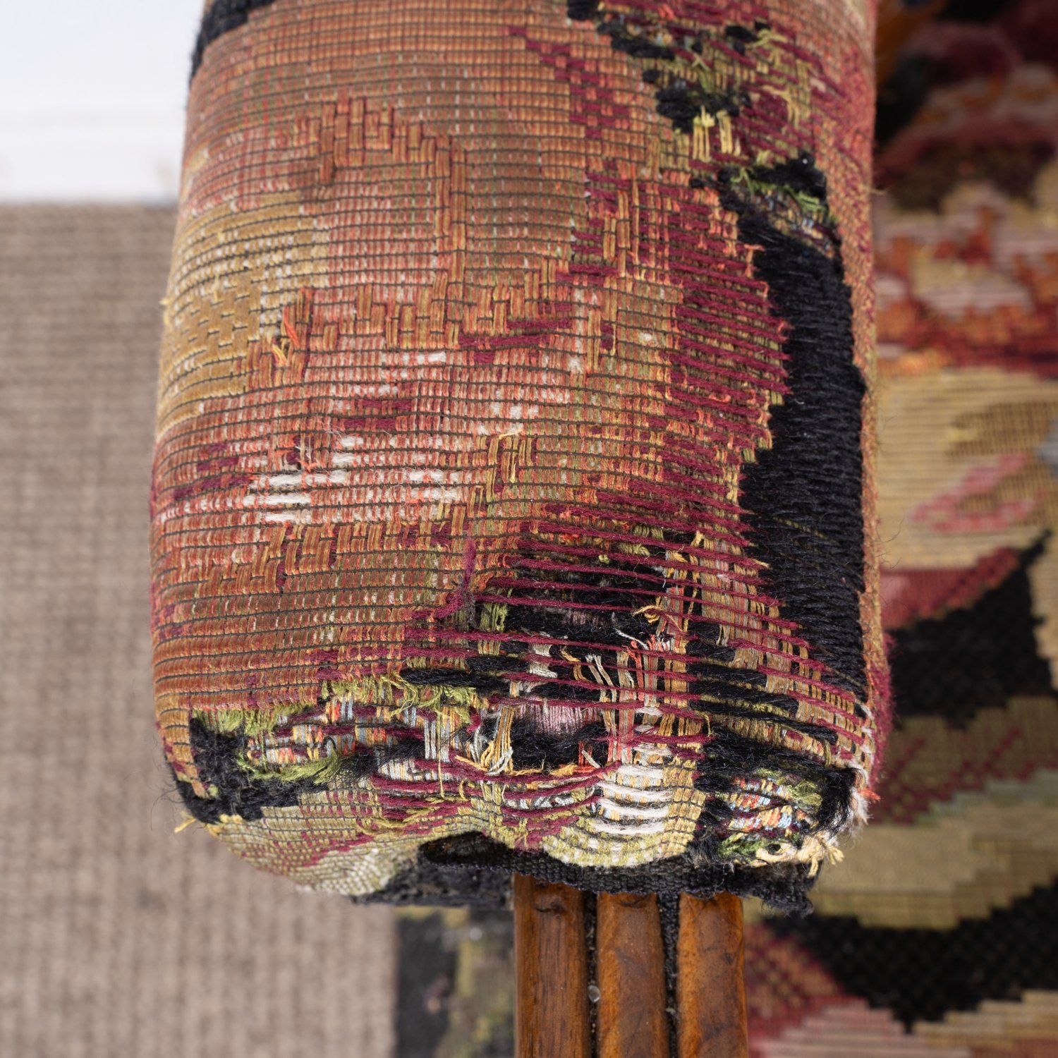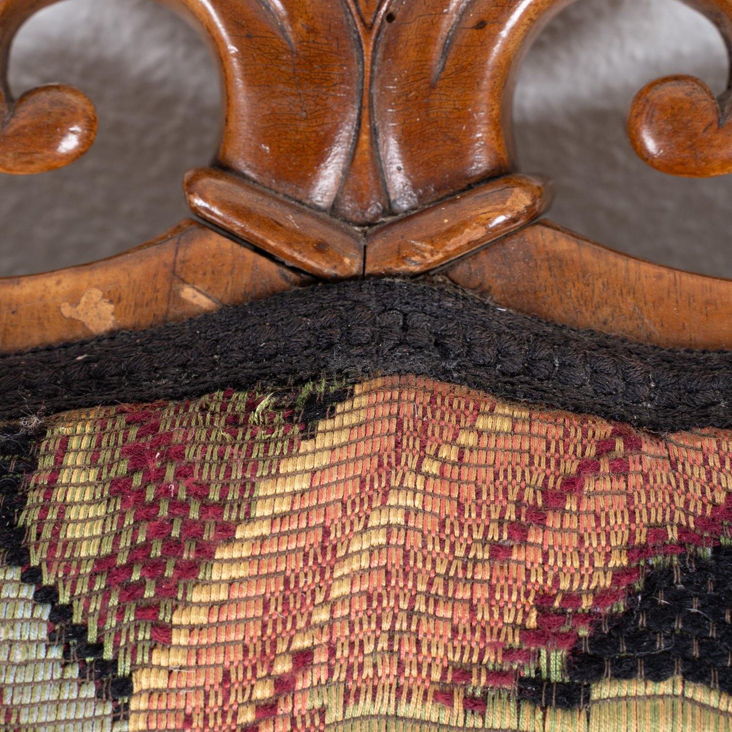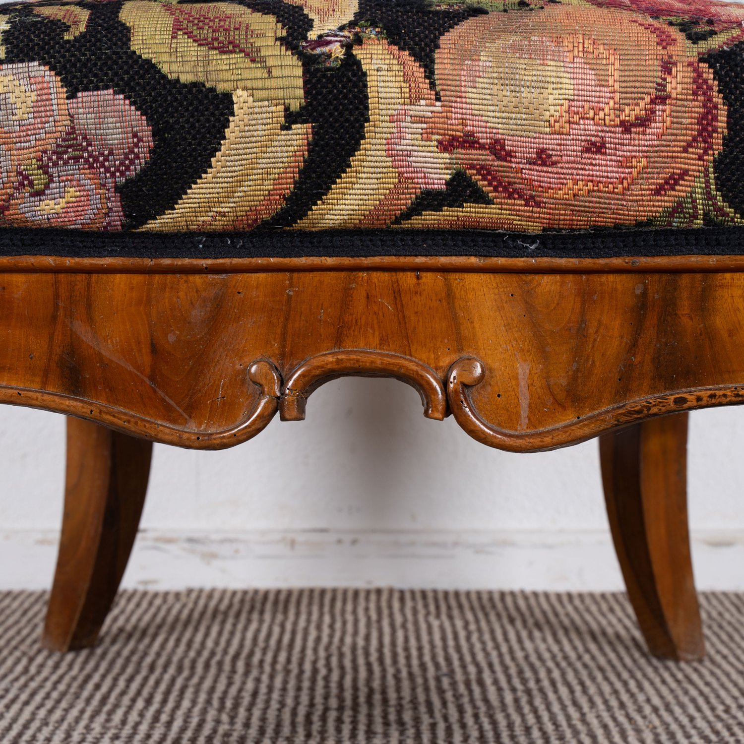 Prächtiger süddeutscher Polstersessel, wohl München um 1840 / 50, Nussbaum massiv und furniert, ergonomisch geformter, gebogener Rücken, abgerundete Sitzfläche, schöner unrestaurierter Fundzustand, originale Bezugstoffe. Lehnenhöhe ca. 102 Sitzhöhe ca. 44 cm.
