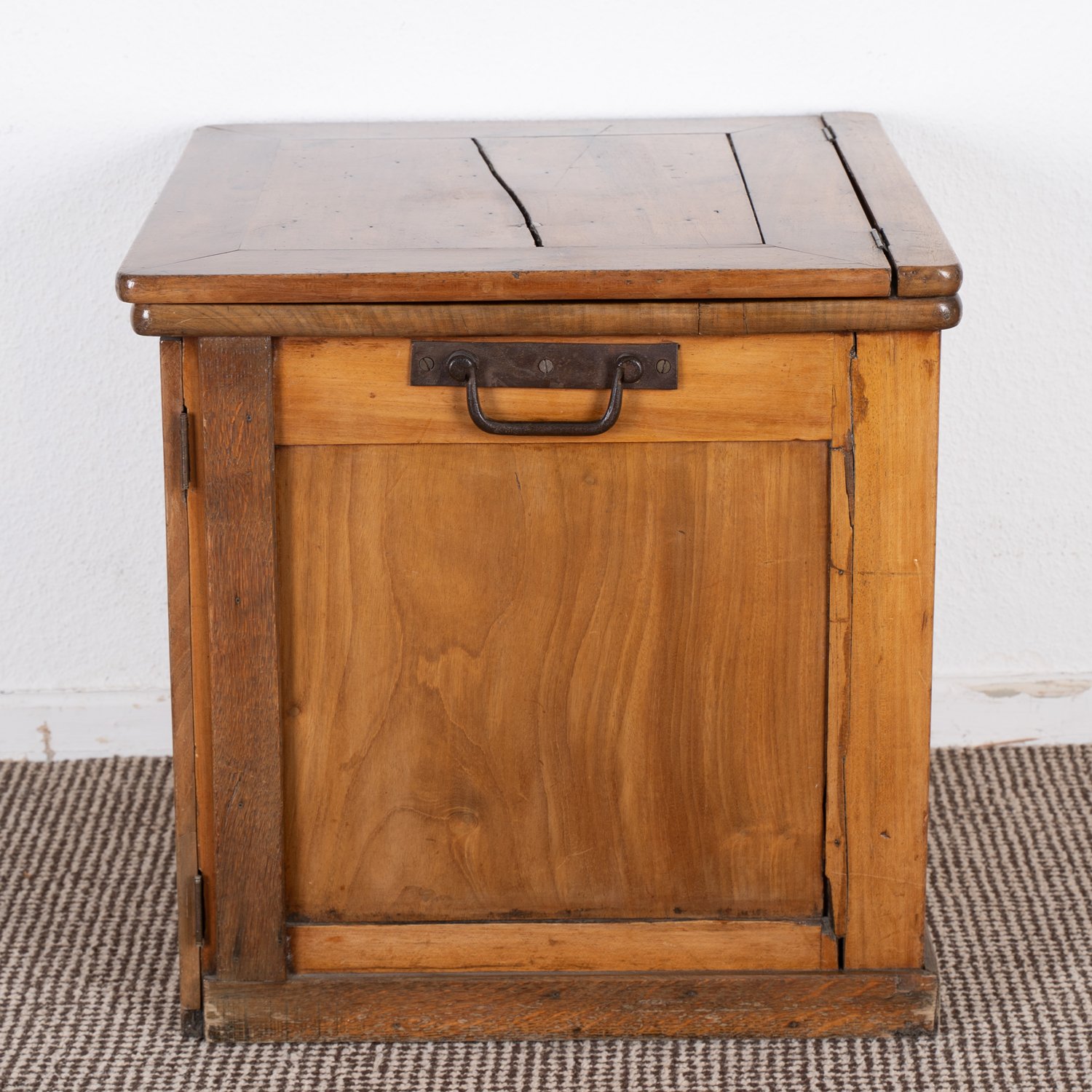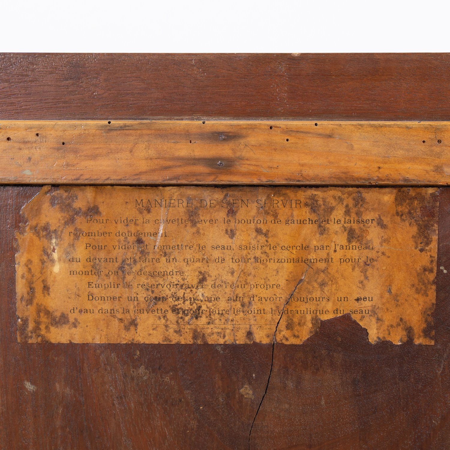 "Sitz-Klosett, Frankreich 19. Jhd. / 20. Jhd., mobile Toilette für den reiselustigen Camping-Urlauber, Nussbaumkorpus mit seitlichen Tragegriffen, Türinnenseite mit ""Bedienungsanleitung"" und offensichtlich vollständiger Inneneinrichtung. Selten! ca. 50 x 50 x 50 cm. Schäden, Fehlstellen, weder auf Funktion noch auf Vollständigkeit geprüft."