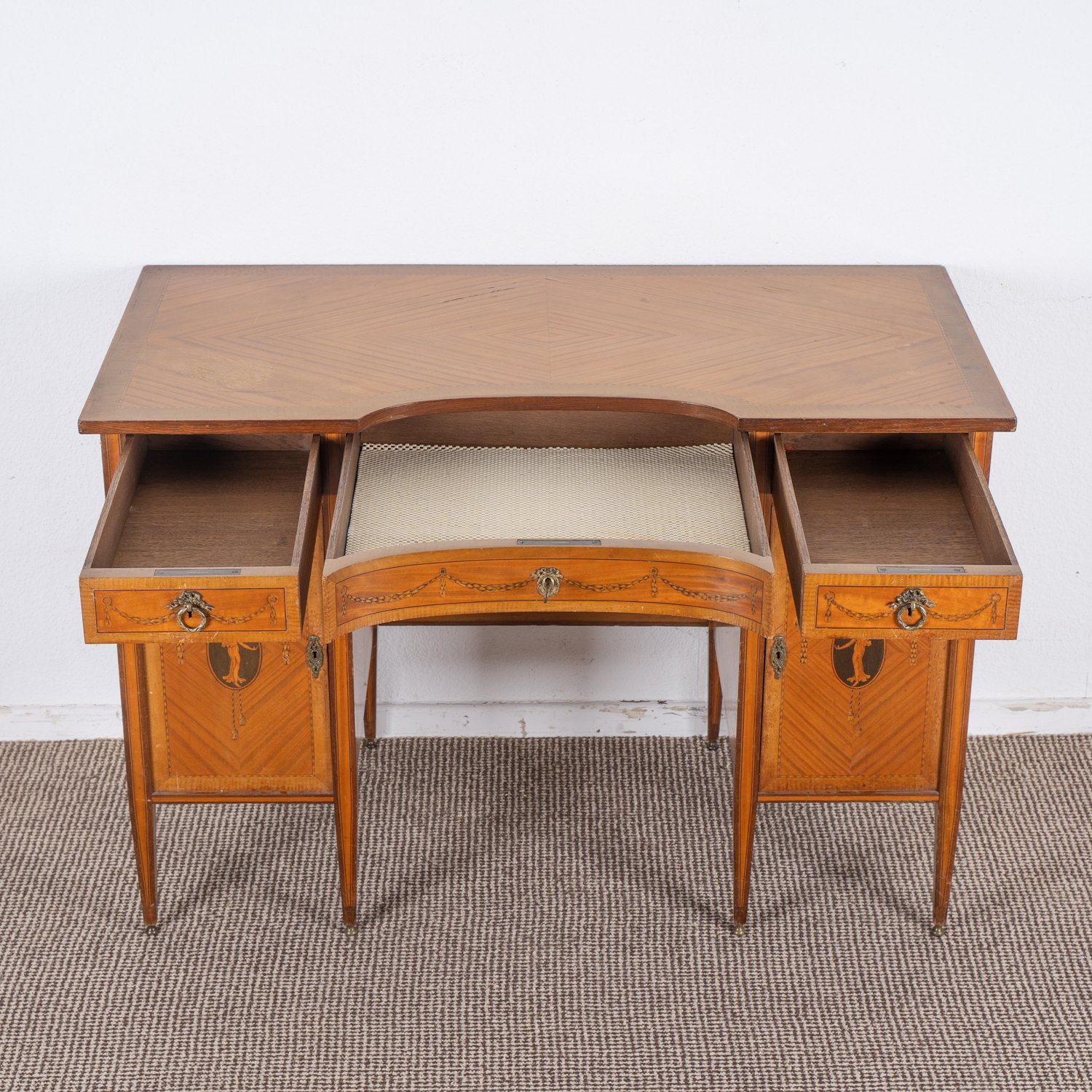 Eleganter Schreibtisch, Sheraton-Stil, um 1900 / 1920, feine Intarsienarbeiten, geringe Schäden / Fehlstellen, freistellbares Möbelstück. Hinterer rechter Messingschuh fehlt. ca. 75 x 111 x 57 cm.