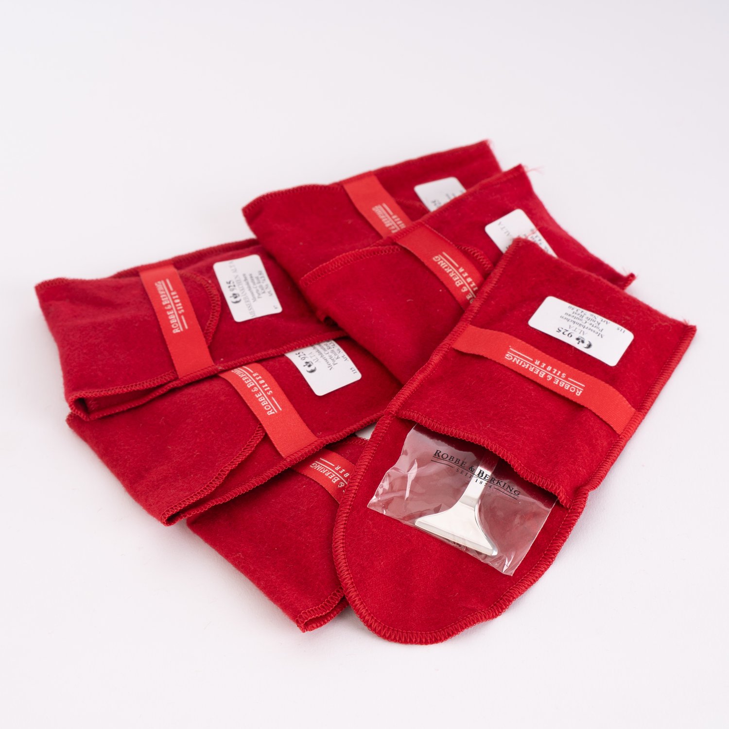 Folge von 6 zeitlose eleganten ROBBE und BERKING Messerbänkchen, Ausführung in 925er Sterlingsilber, Länge je ca. 7 cm, zusammen ca. 96 gr. sehr schöner Erhalt. 6 original Stofftäschchen beigegeben. Alle original verpackt!