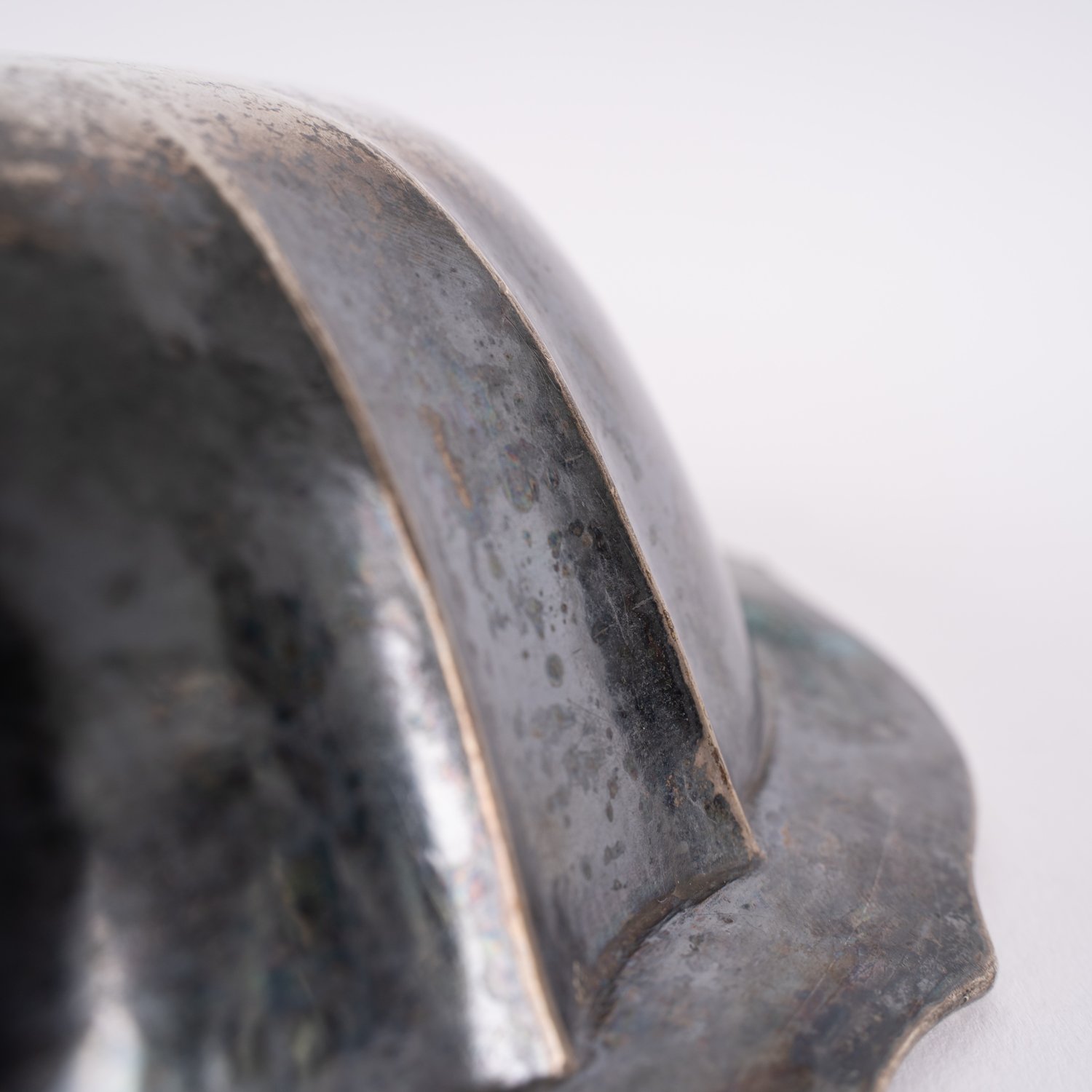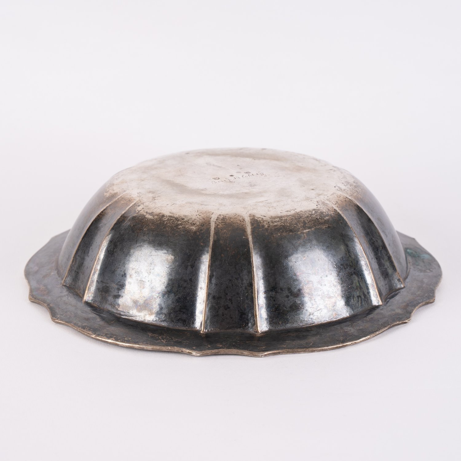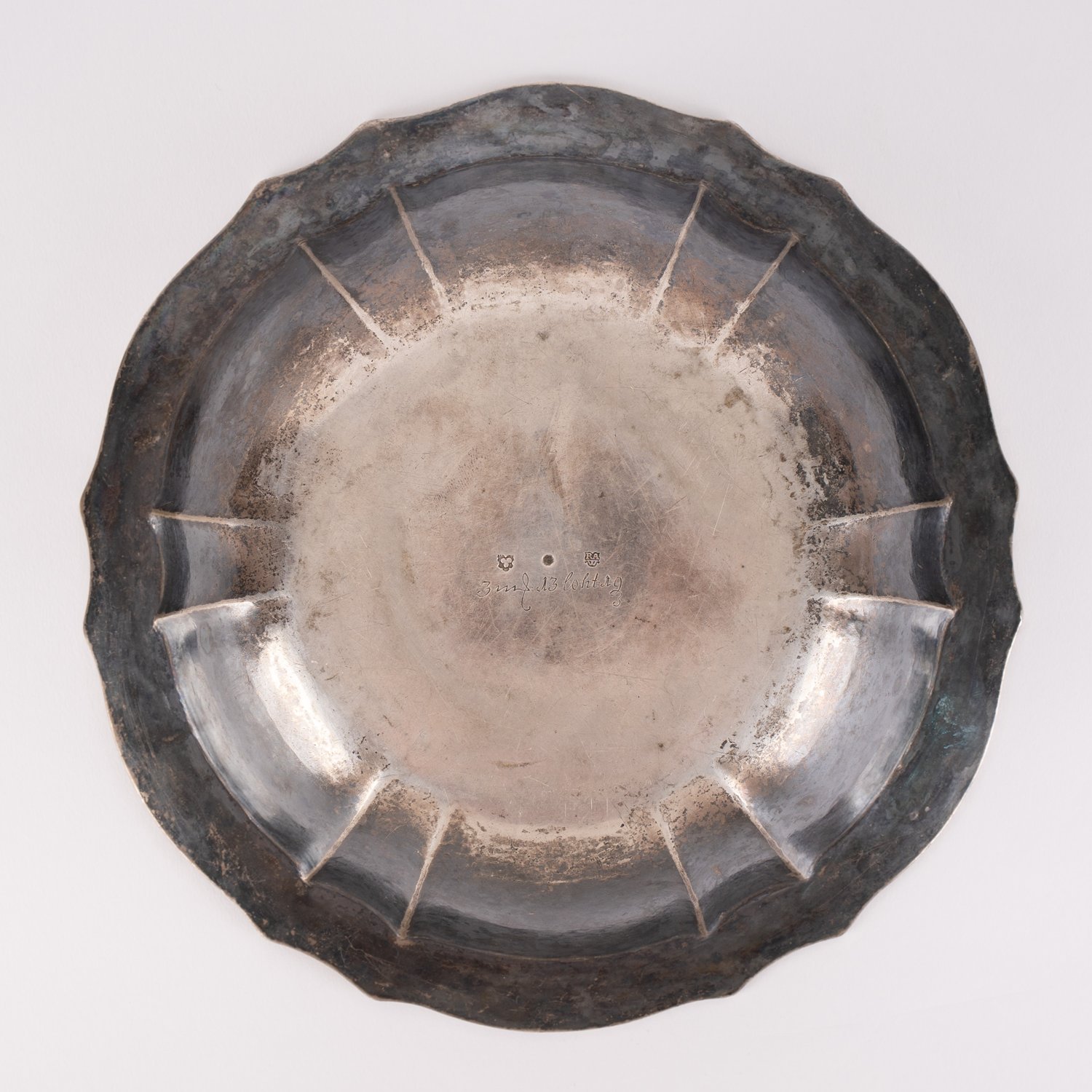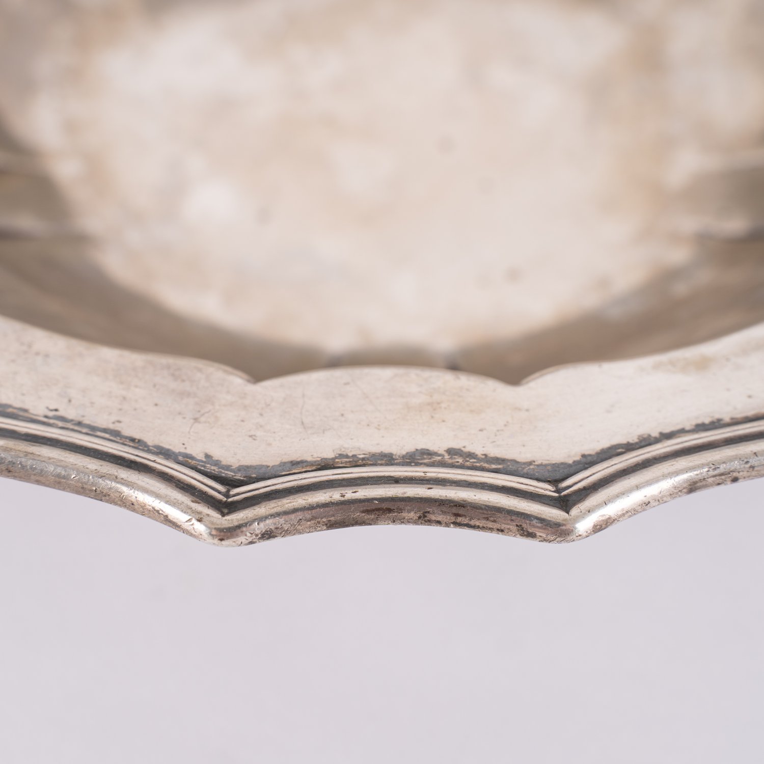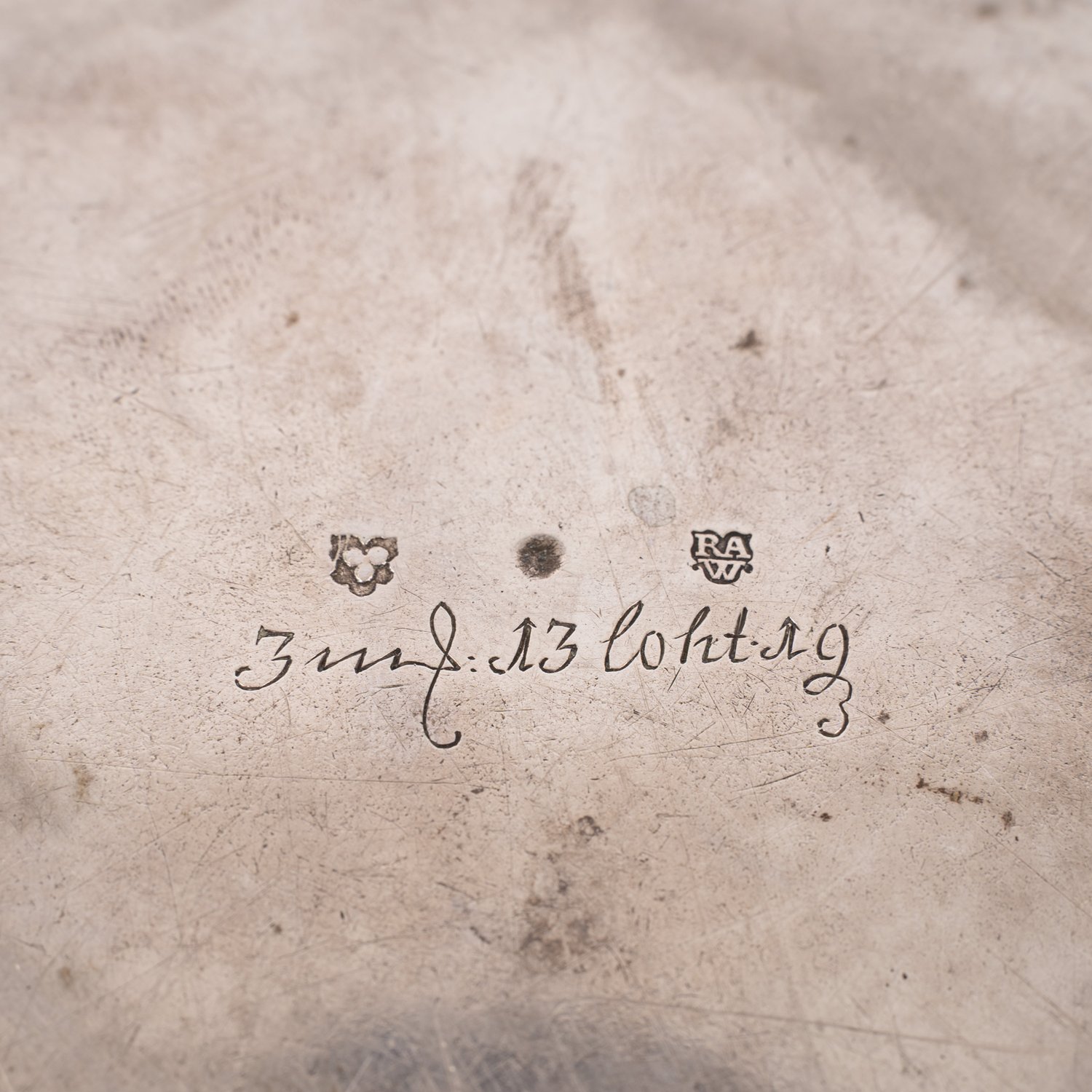 Schwere Gemüseschale. Barock, Hannover um 1750 / 1760. Seltene Arbeit des aus Braunschweig stammenden Gold- und Silberschmiedes Rudolph August Wackerling, leistete am 27.09.1730 den Bürgereid. Von ihm sind bisher keine weiteren Arbeiten bekannt. Bodenseitige Punzen & Ritzmarken: Pfeilkraut - Prüfmarke - Meisterzeichen RAW - ? -13löthig. Höhe ca. 6 cm, Durchmesser ca. 25 cm, ca. 880gr. Sehr schöner sammelwürdiger Erhalt mit teilweiser Patina.