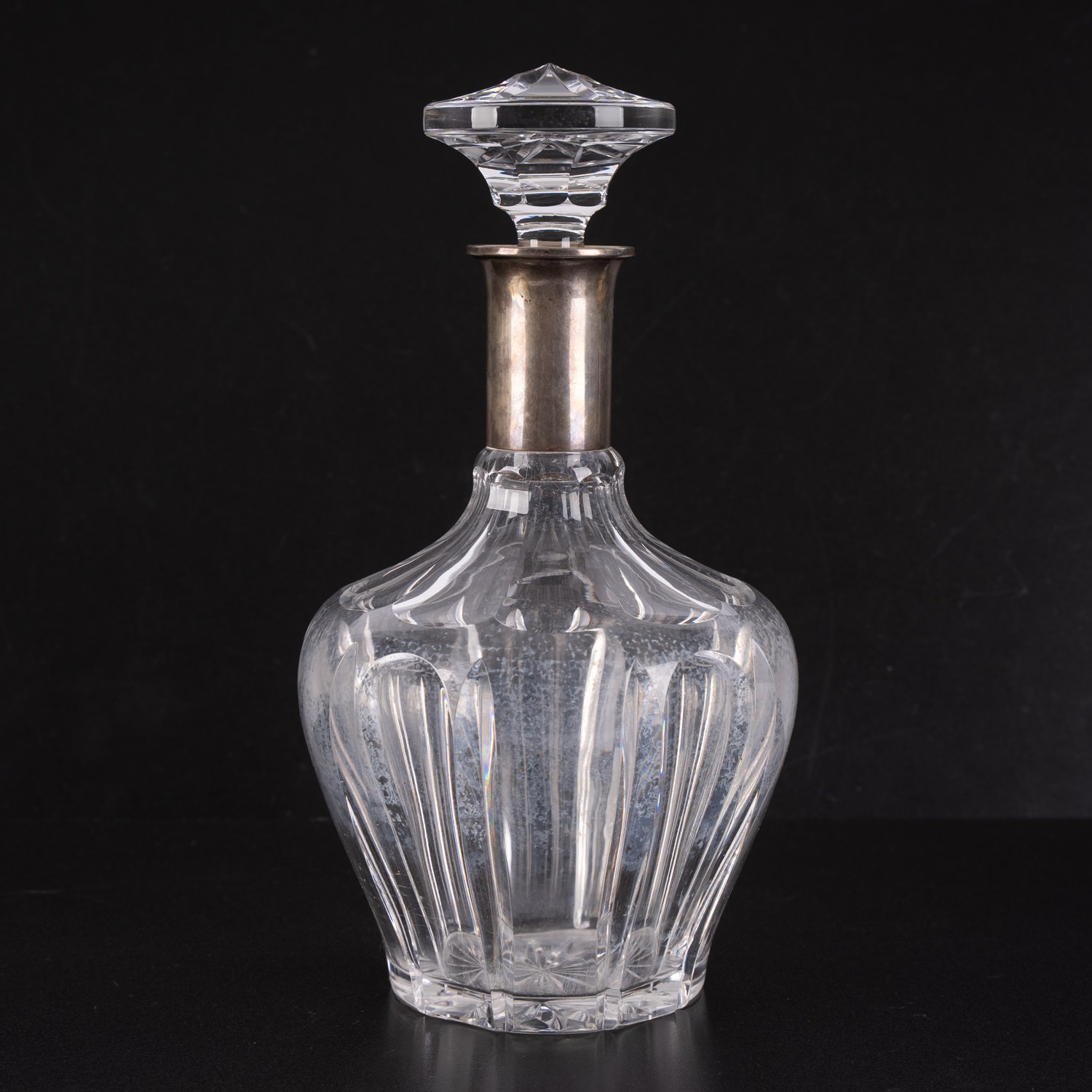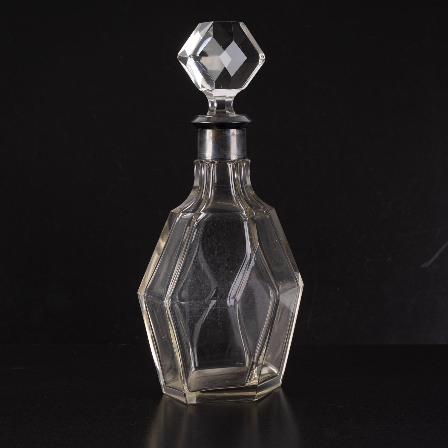 4-teiliges Konvolut verschiedener Glaskaraffen mit Silbermonturen. Verschiedene Alter, Größen, Formen und Erhalt. Höhen von ca. 16,5 bis ca. 30,5 cm.