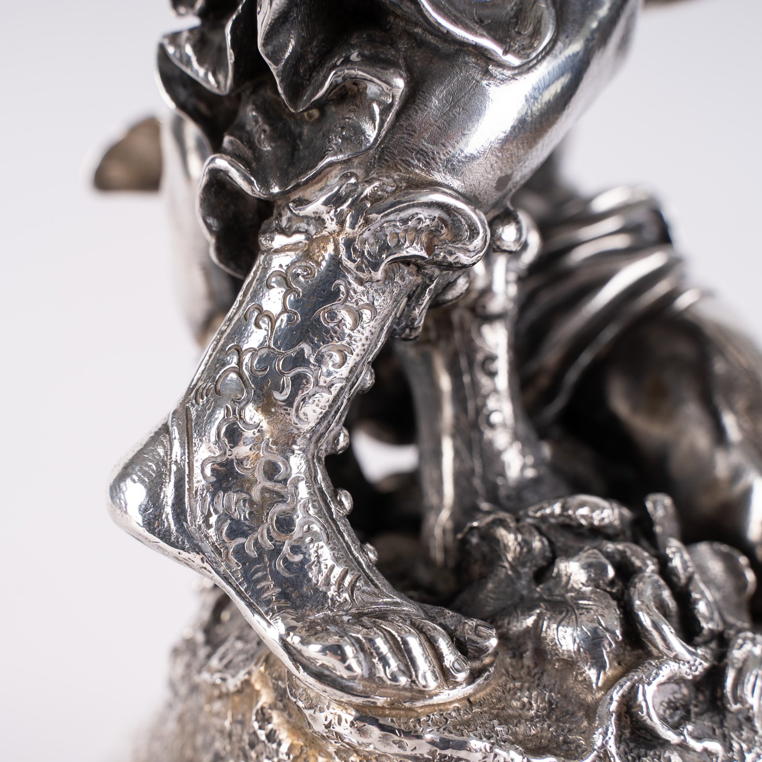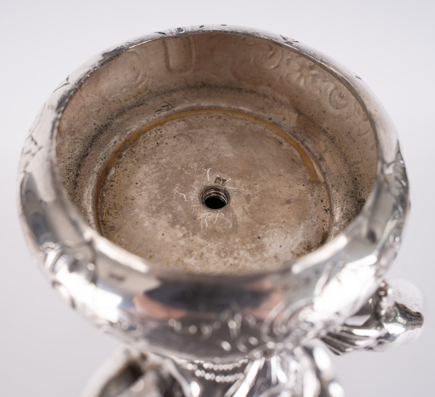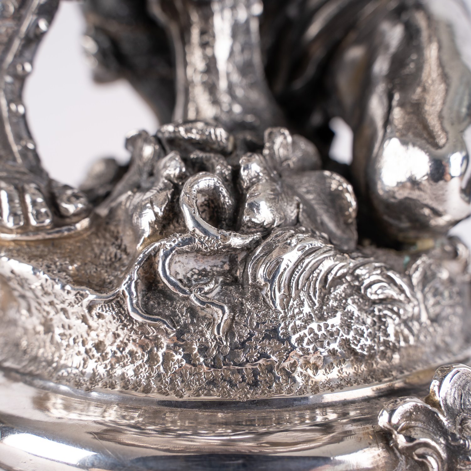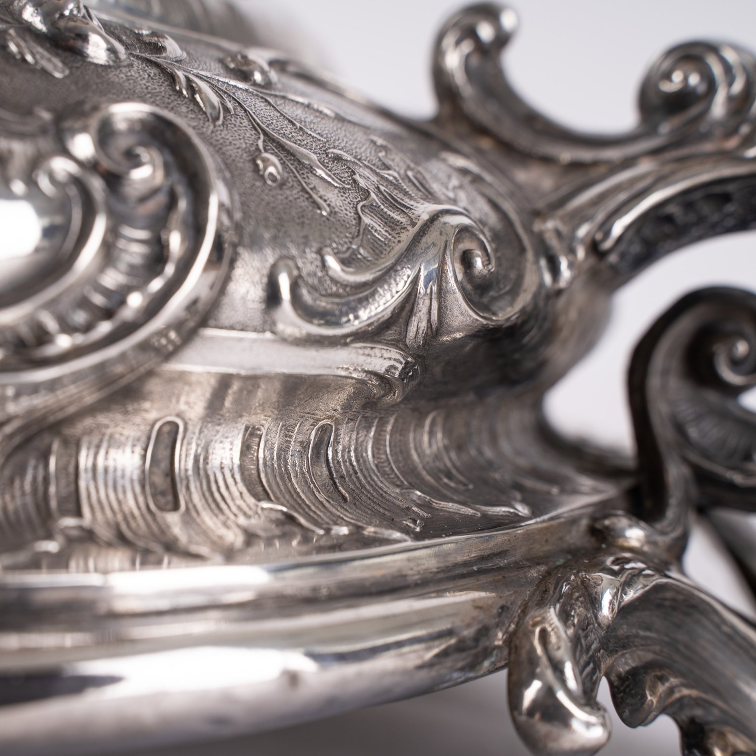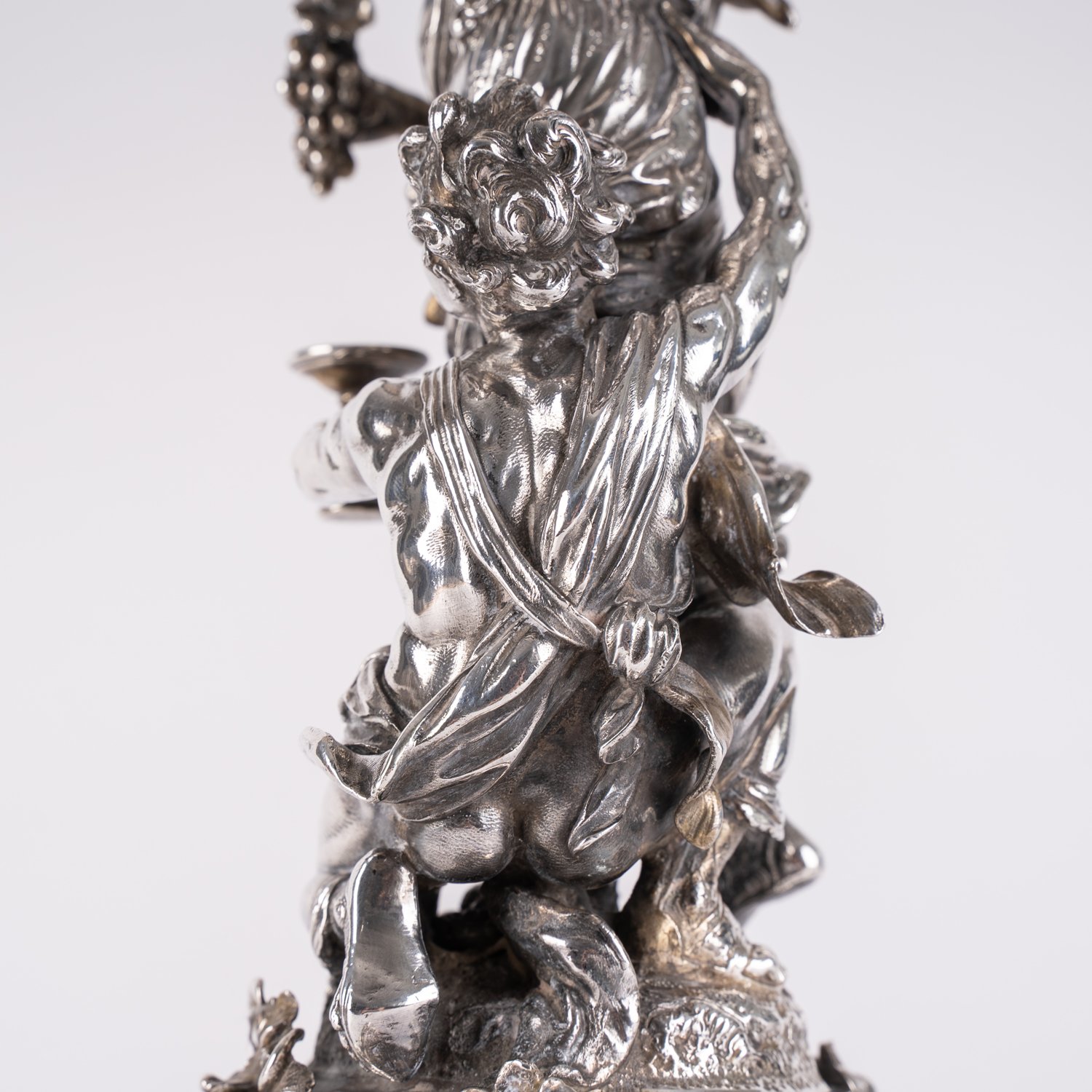 "Prächtiger, seltener Tafelaufsatz der ""Belle - Epoque"", um 1890 / 1900, Historismus, Höhe ca. 48,5 Durchmesser ca. 37,5 cm, ca. 3047 gr., 800er Silber massiv, Herstellermarke Bruckmann und Söhne, Heilbronn; Händlerstempel H. Nevir und Sohn, Berlin. Der mehrfach getreppte runde Fuß auf 3 ausgestellten Rocaillenfüßen, reich an Blüten, Blättern und Rocaillen, partiell godroniert. Der imposante figürliche Schaft mit vollplastischer Darstellung eines Jünglings mit Weinglas, zu Füßen einer stehenden jungen Frau mit Traubendolde, sie um ein Glas Wein anbettelnd, auf ihrem Kopf eine abgehängte runde Schale tragend. Selten. Passend zu den beide folgenden Lotnummern. Aus altem Celler Privatbesitz stammendes Ensemble. Schale minimal schief, sonst sehr schöner Erhalt."
