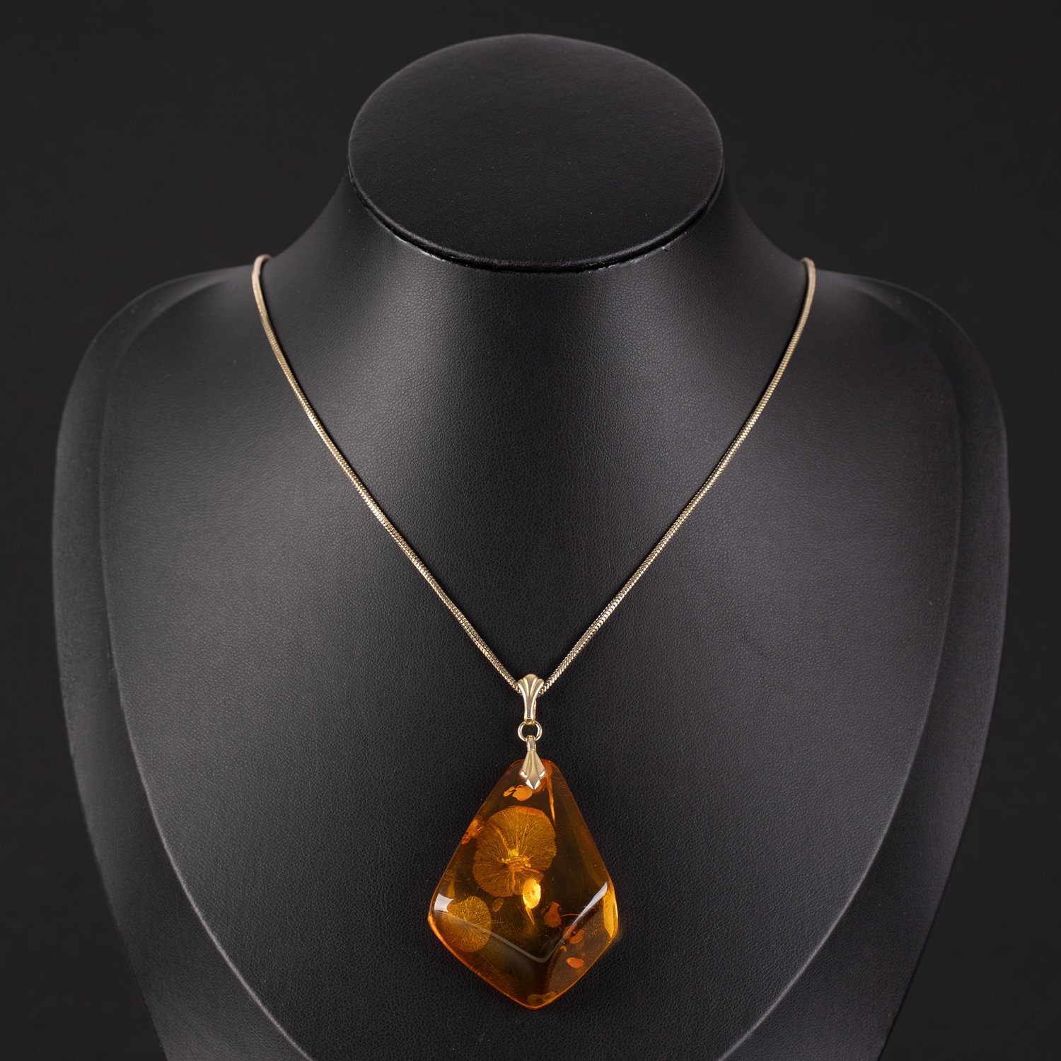 """Schlangenkette"" in 585er Gelbgold (Länge ca. 60cm), daran honigfarbener durchsichtiger Bernsteinanhänger mit Einschlüssen. Ca. 4,5 x 3,2cm, mit 585er Goldfassung und Öse. Gesamtlänge ca. 6cm. Gewicht der Kette ca. 7,5gr. Sehr guter Erhalt"
