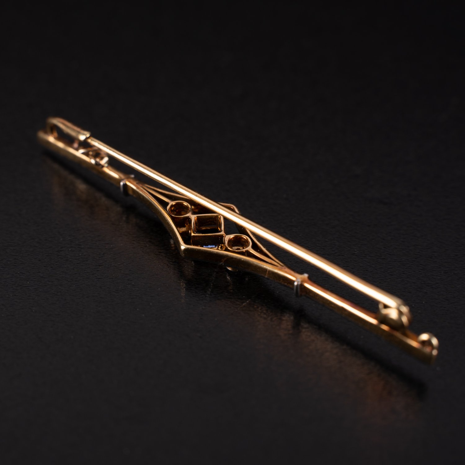 Prächtig elegante Stabbrosche, 14k Gelbgold ; mittig ausgestaltet mit einem viereckigen Aquamarin, von 2 Brillanten flankiert (je ca. 0,08 ct). Länge der Nadel ca. 6 cm, ca. 3,5 gr. brutto. Sehr schöner Erhalt.
