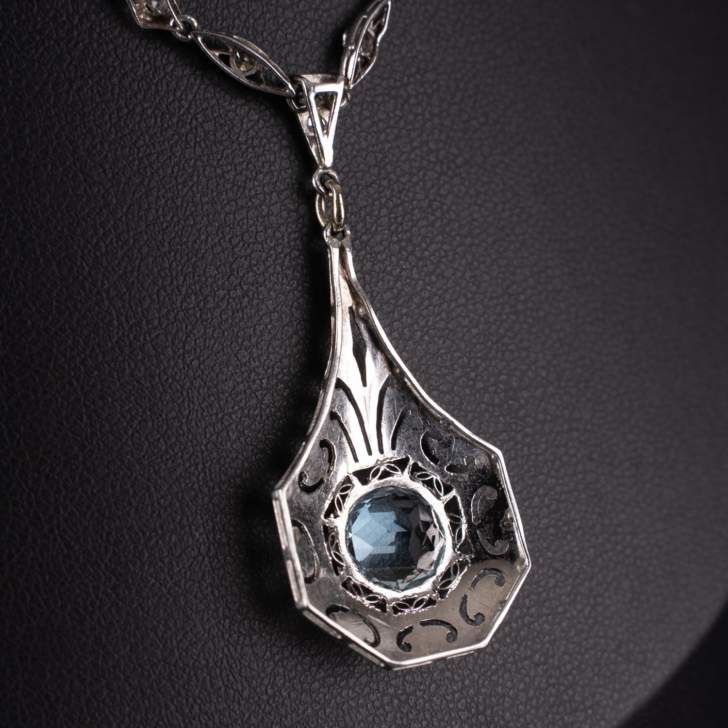Elegante Art-Deco Kette der 1920iger Jahre, 800er Platin, die Kettenglieder im Verlauf fein ziseliert und mit Diamantsplittern besetzt. Der Anhänger aus 640er Platin wie ein großer Tropfen gearbeitet, mit ebenfalls feiner Sägearbeit. Mittig besetzt mit einem geschliffenem, sehr schönem Aquamarin in leicht achteckiger Formgebung. Länge des Anhängers ca. 3 cm (ohne Öse), Gesamtlänge ca. 46 cm ; Gesamtgewicht brutto ca. 9,5 gr. Sehr guter Erhalt!