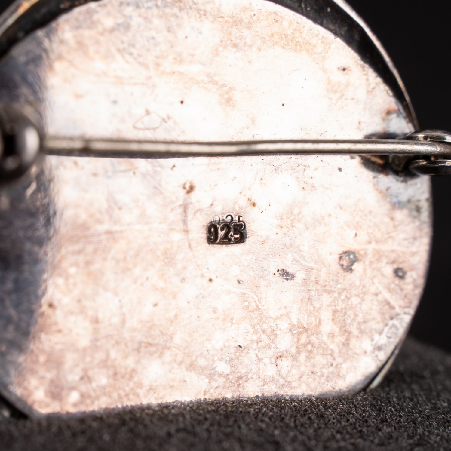 925er Silberbrosche, leicht oval, besetzt mit rundem dunkelbraunem Bernstein, dieser mit zahlreichen Einschlüssen. Durchmesser des Steins ca. 2,4 cm ; Durchmesser der Brosche ca. 3,5 x 3 cm. Rückwärtiges Nadelsystem, Guter Erhalt. ca. 15 gr. brutto.