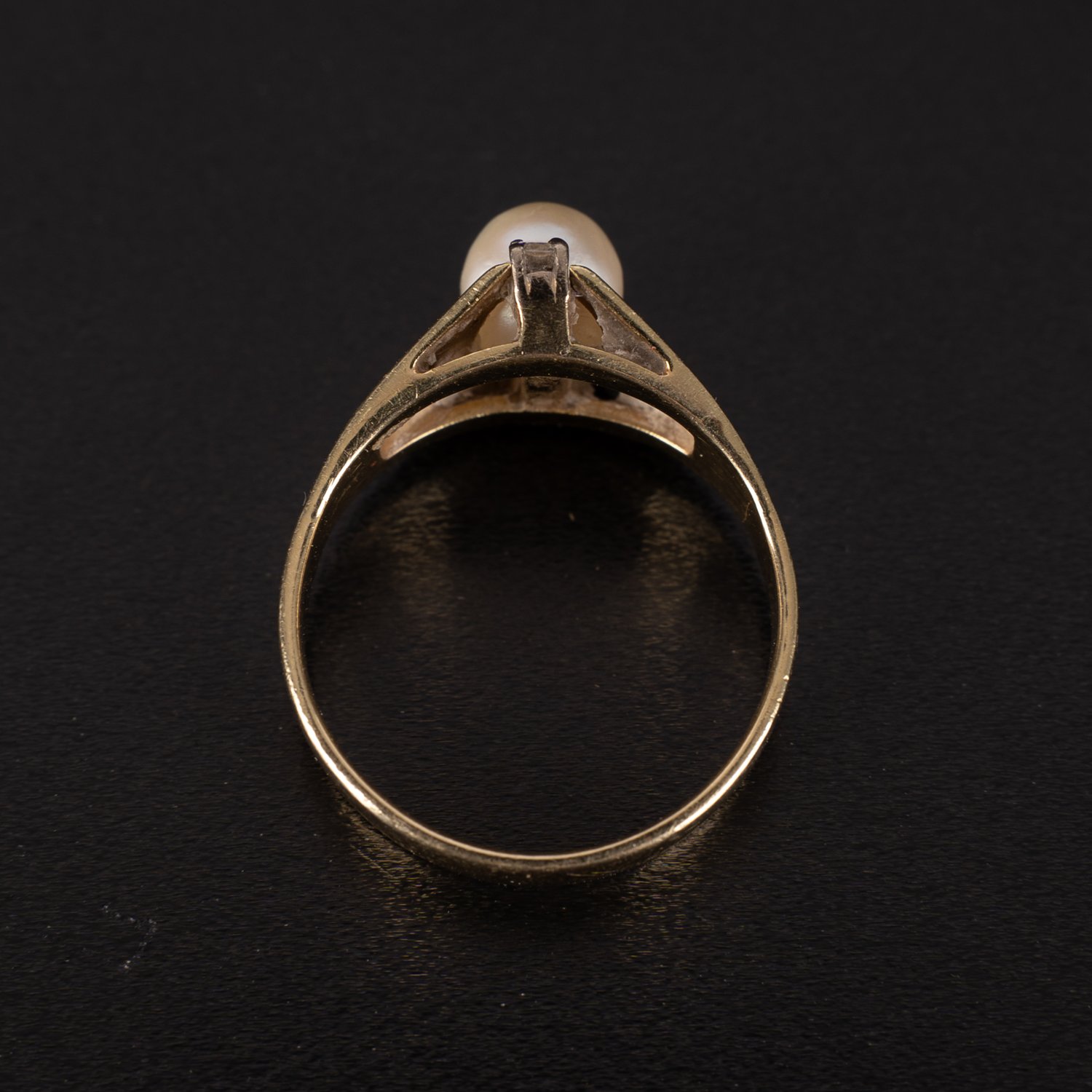 Damenring, 585er Gelbgold mit breiter Schiene. Ringkopf mit Zuchtperle (Durchmesser ca. 0,7 cm) und 2 kleinen Brillanten (je ca. 0,05 ct) ; guter Erhalt. ca. 5,5 gr. brutto, Ringgröße ca. 61.