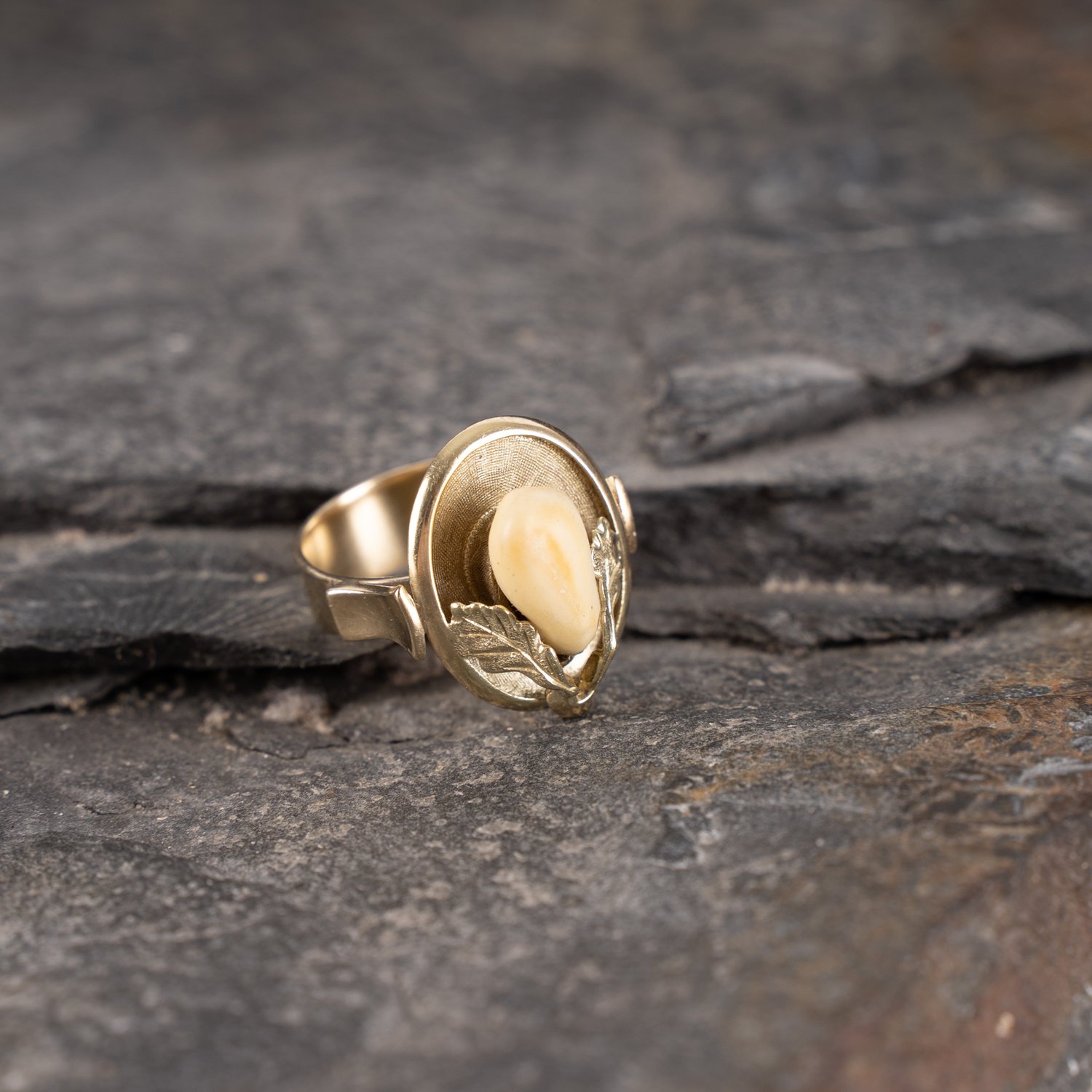 "Damenring in 585er Gelbgold, sehr breite Schiene (max. ca. 0,7 cm) ; Die schlichten Ringschultern enden in einem ovalen ""Teller"", auf dem eine Hirschgrandel, verziert mit 2 Eichenblättern, besetzt ist. ca. 2x2 cm ; ca. 8 gr. brutto ; guter Erhalt ; Ringgröße ca. 55,5."