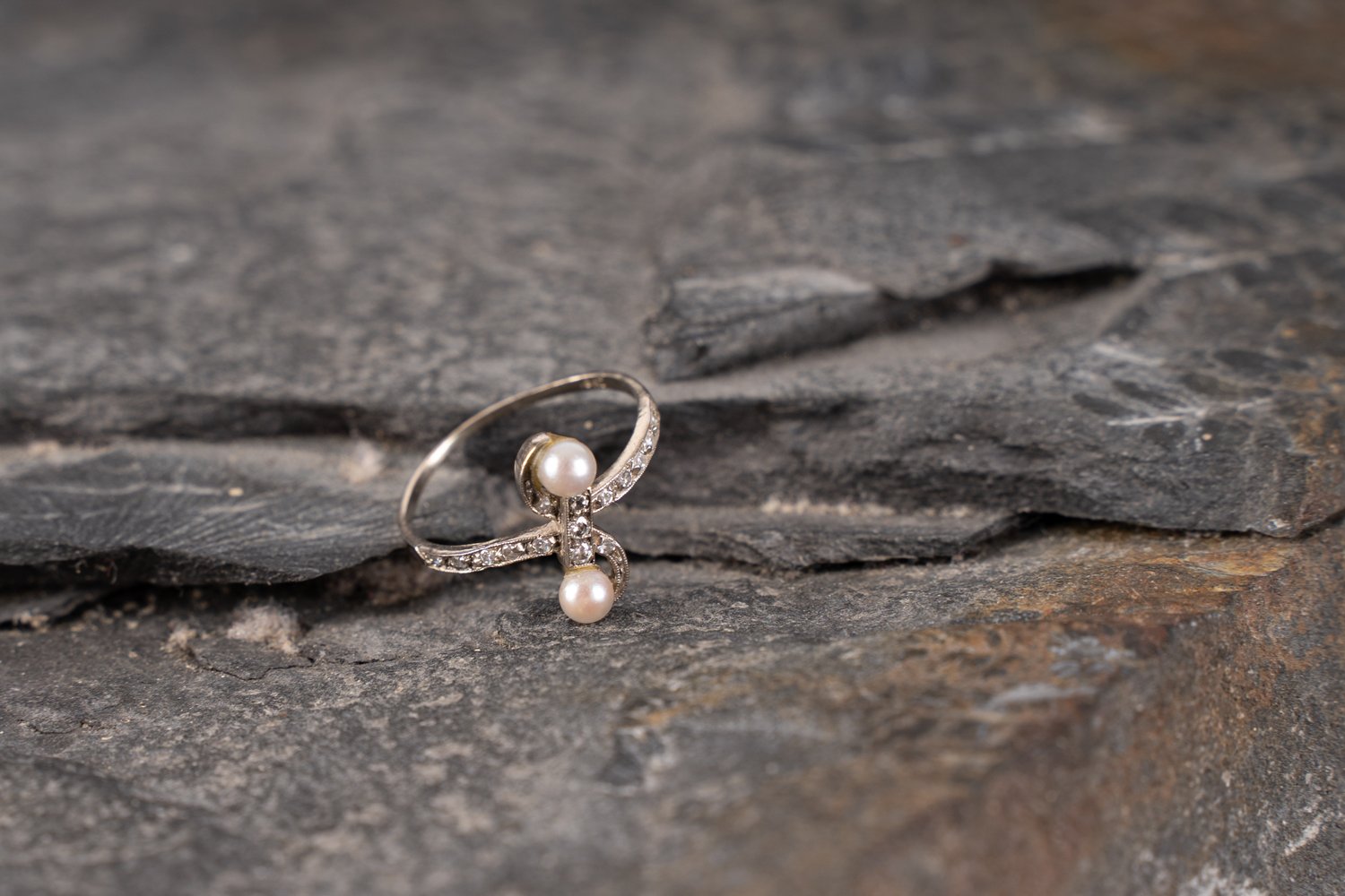 Antiker, kleiner Damenring, Weißgold, 18 kt. Ringschiene sehr schmal und etwas verbogen. Ringoberteil ganz fein mit kleinen Diamantsplittern besetzt und als Schleife obenauf 2 echte Perlen aus dem Ende des 19. Jhd., Ringgröße ca. 54 ; ca. 1,5 gr. brutto.