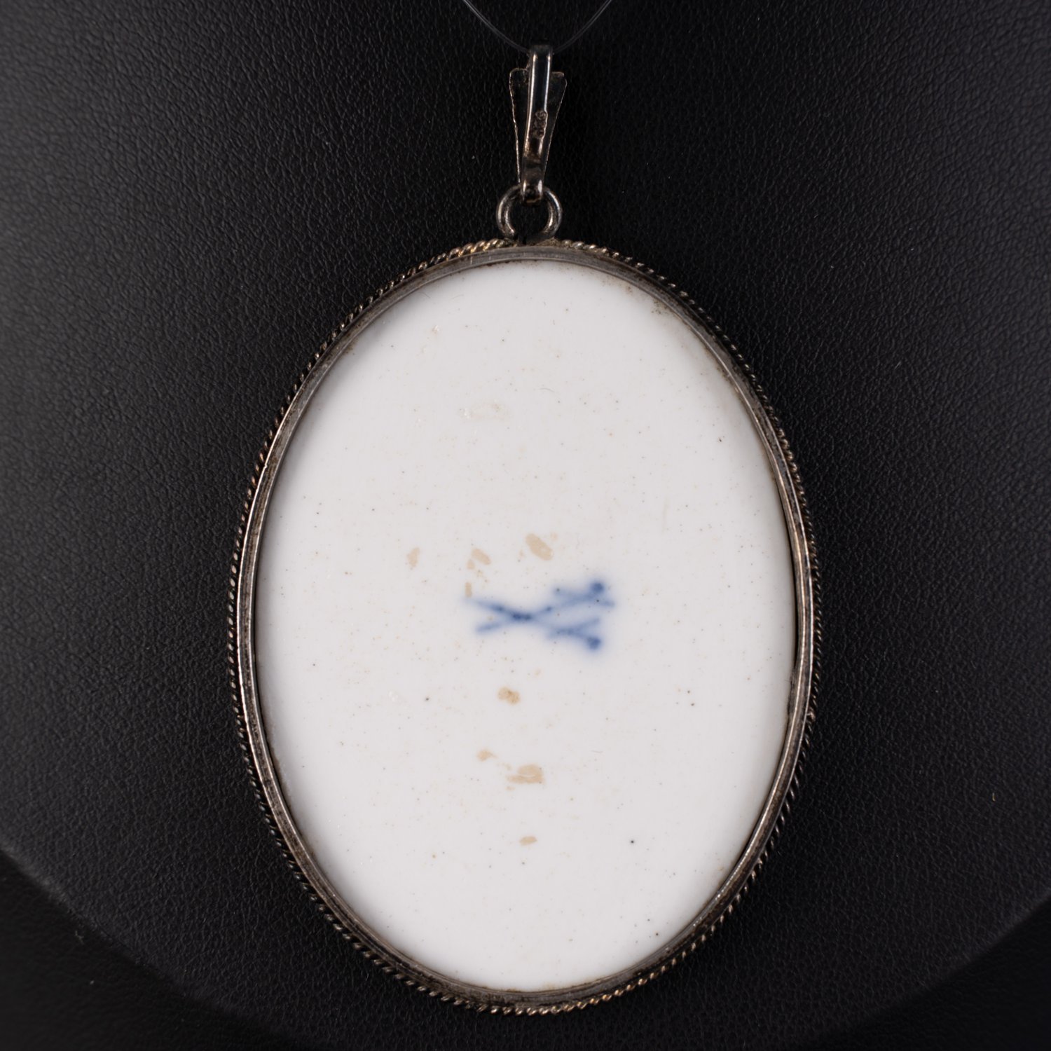 Florales Medaillon auf Meissner Porzellan und mit Silberrand eingefasst. Anhängeröse. Feine Blumenmalerei, unbeschädigter Erhalt, ca. 4 x 5 cm (ohne Öse).