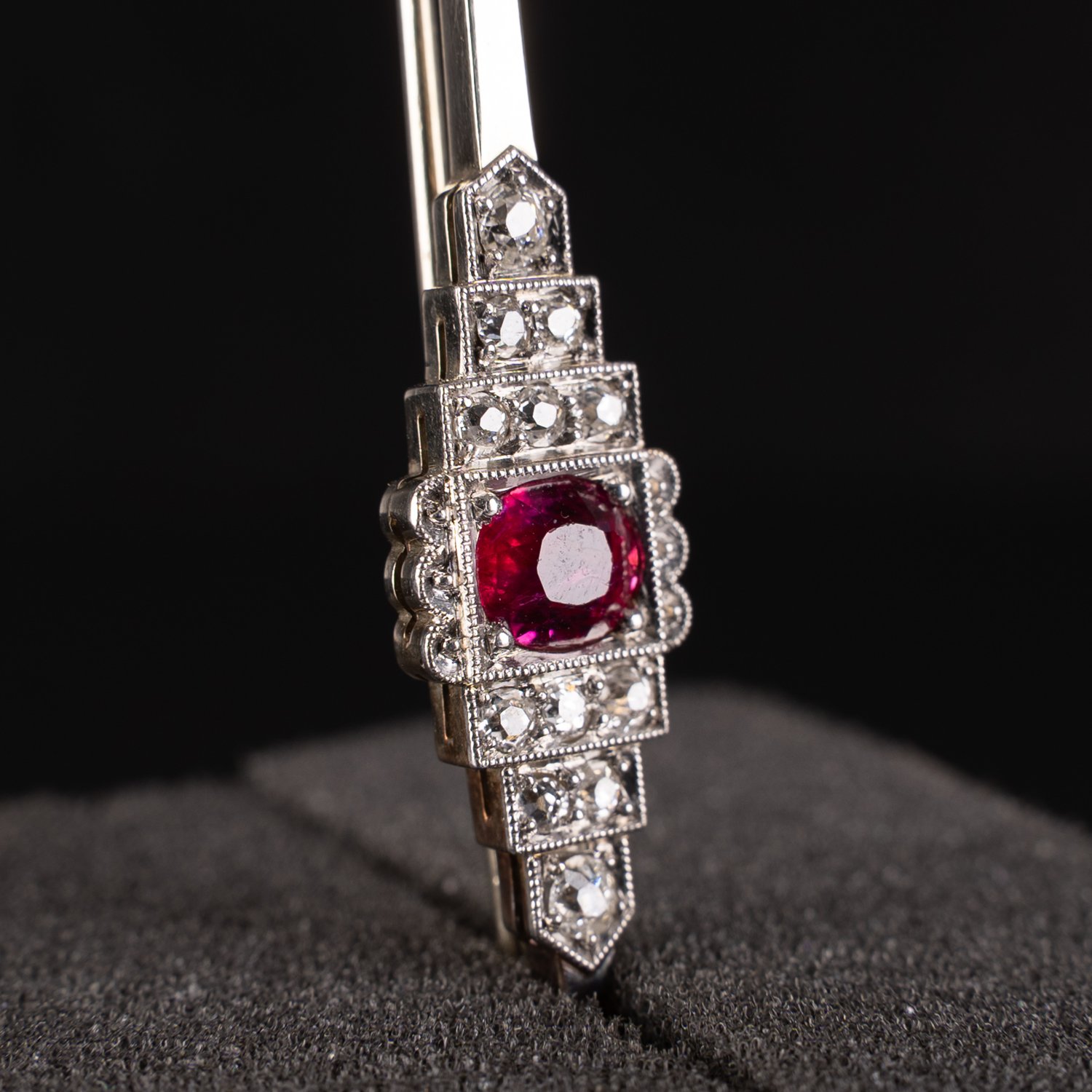 Prachtvolle Art-Deco Stabbrosche aus 750er Weißgold (ca. 4,5 gr.). Mittig besetzt mit einem geschliffenen Rubin in hervorragender Qualität und Farbe. Flankiert wird dieser Rubin an jeder Seite mit 6 Diamanten im Altschliff (zusammen ca. 0,6ct). Länge ca. 5,8 cm ; wunderschöner Erhalt.