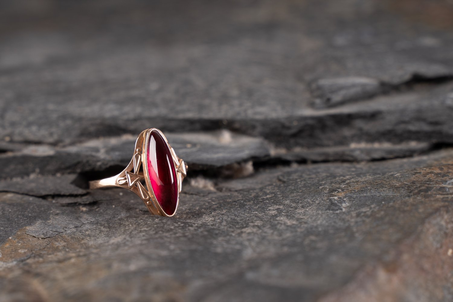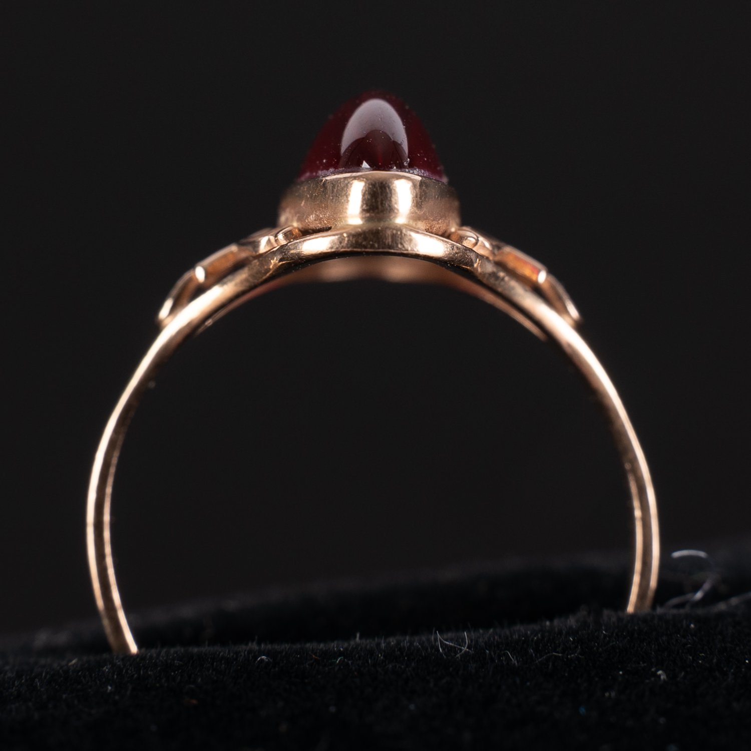 Antiker, vermutlich russischer Damenring, 58 Zolotnik (583), Rosé-Gold mit längsovalem, rotem Stein besetzt. Ringgröße ca. 62, ca. 4 gr. brutto. Schöner Erhalt.