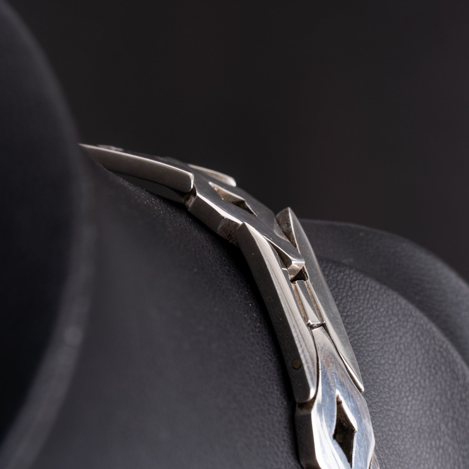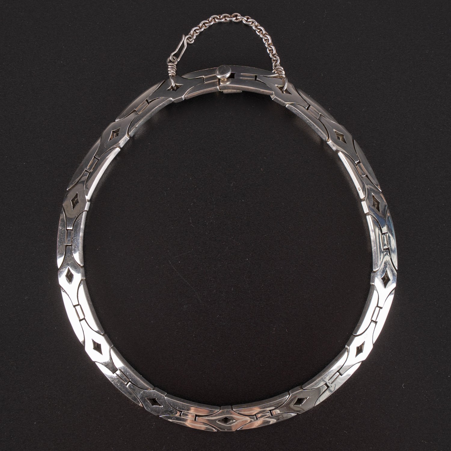 Schwere 925er Sterlingsilber - Halskette aus Mexiko (in original Schatulle von Martin Hardt). 27 bewegliche Glieder in Rauten- oder länglicher Formgebung. Länge ca. 40 cm, Kastenschloss und Sicherheitskettchen. Sehr guter, wohl ungebrauchter Erhalt. ca. 127 gr.