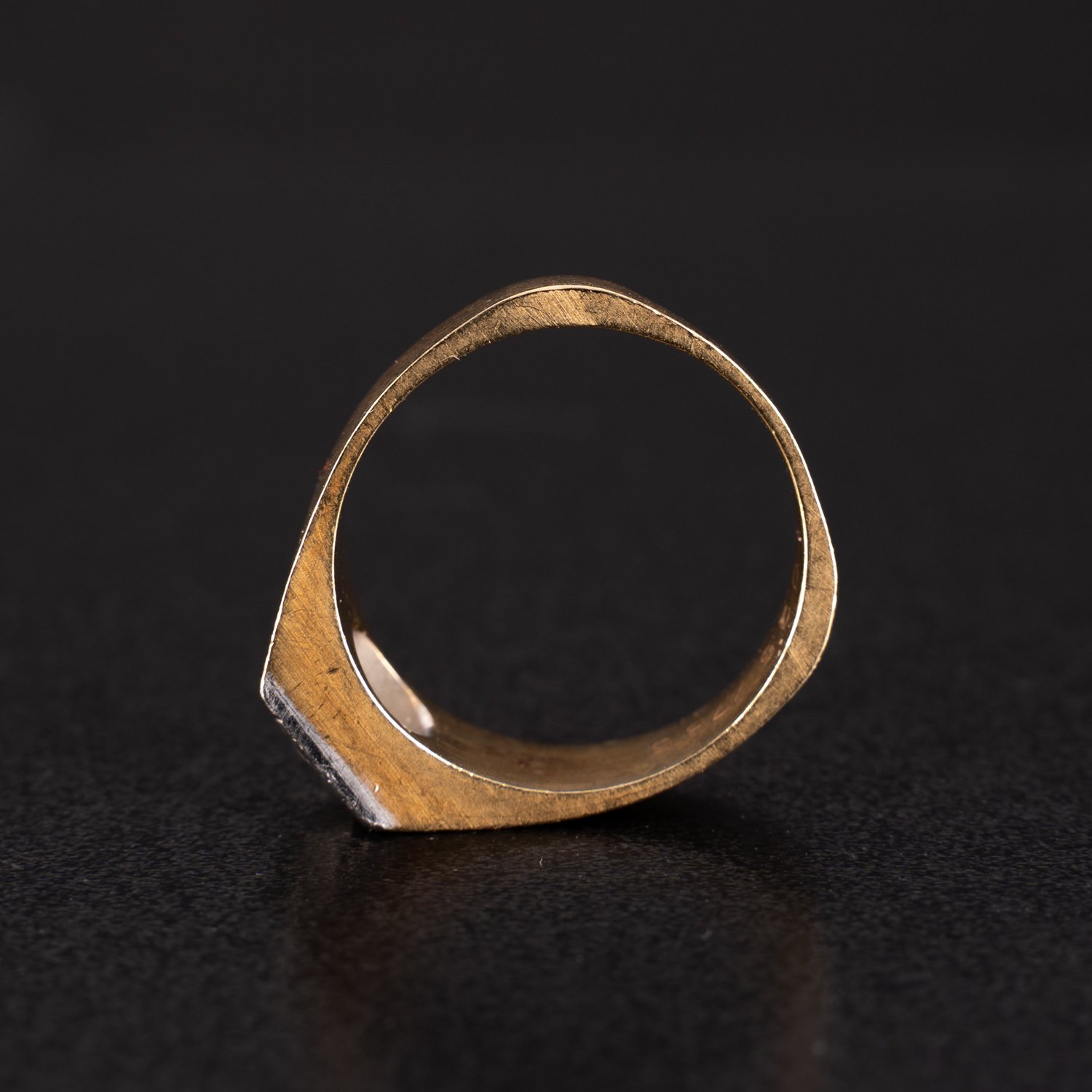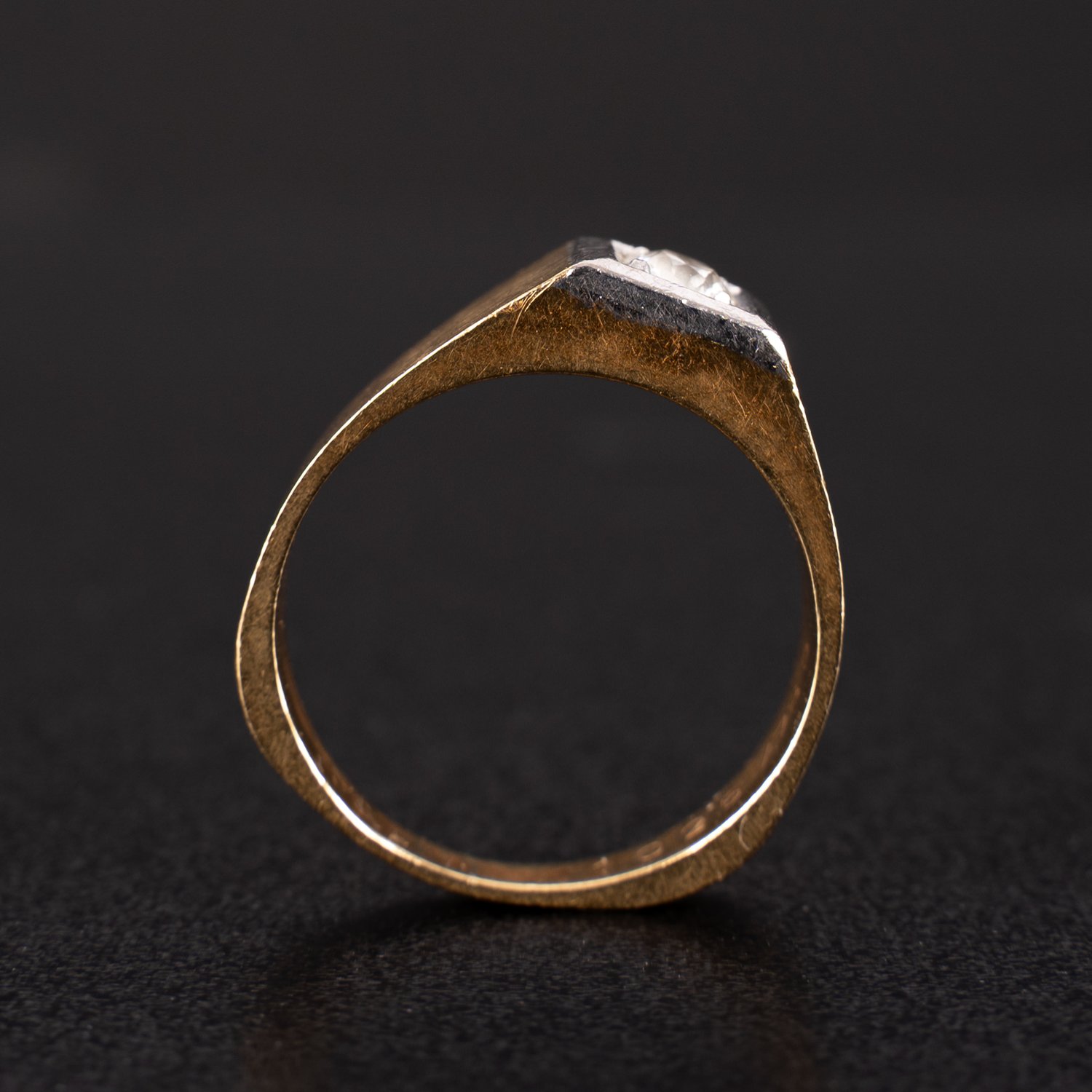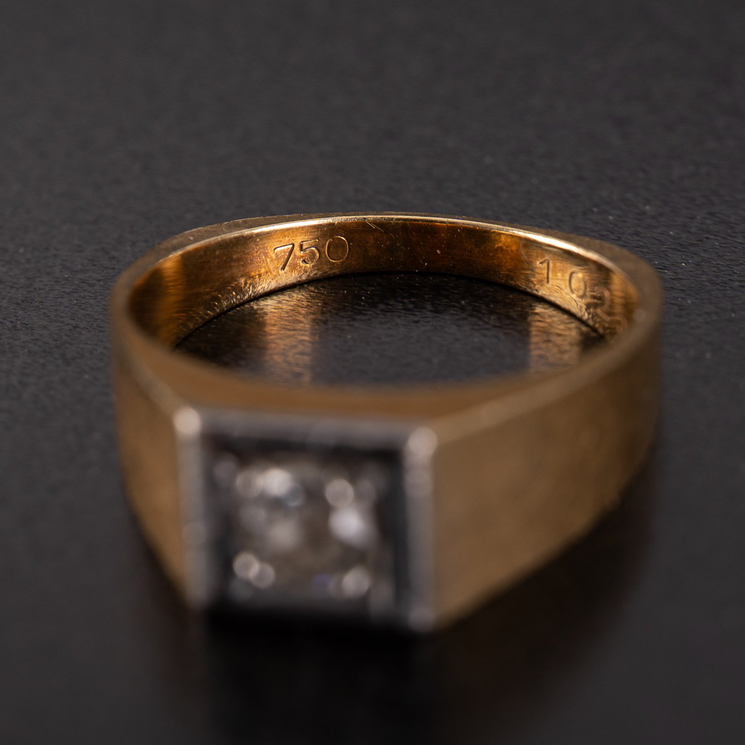 Unisex-Ring aus 750er Gelbgold, mittig mit Brillant besetzt (ca. 0,25ct) ; schlichte moderne Formgebung. Die viereckige Brillantfassung in 750er Weißgold ausgeführt. Ringgröße ca. 64, ca. 10 gr. brutto. Guter, getragener Erhalt.