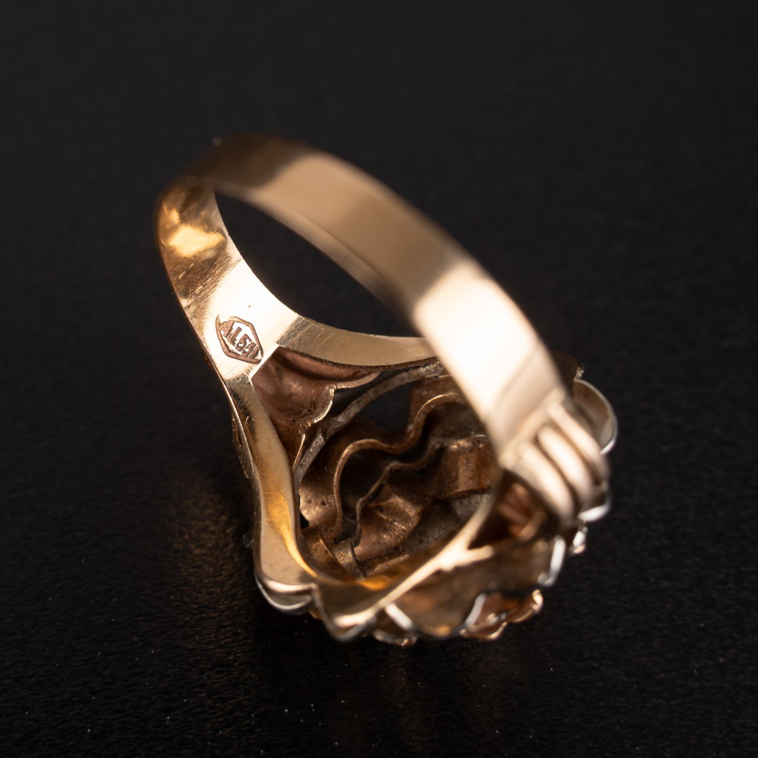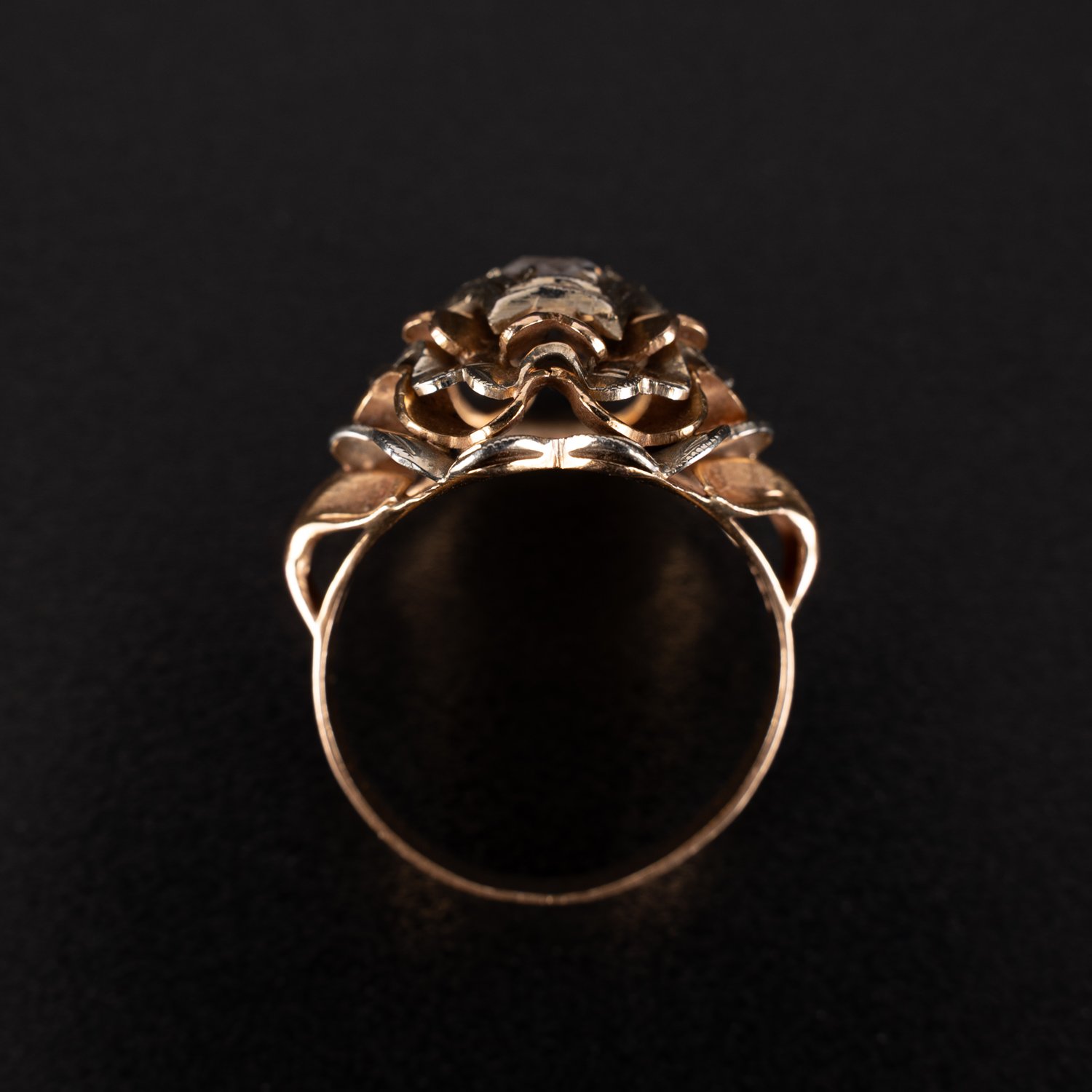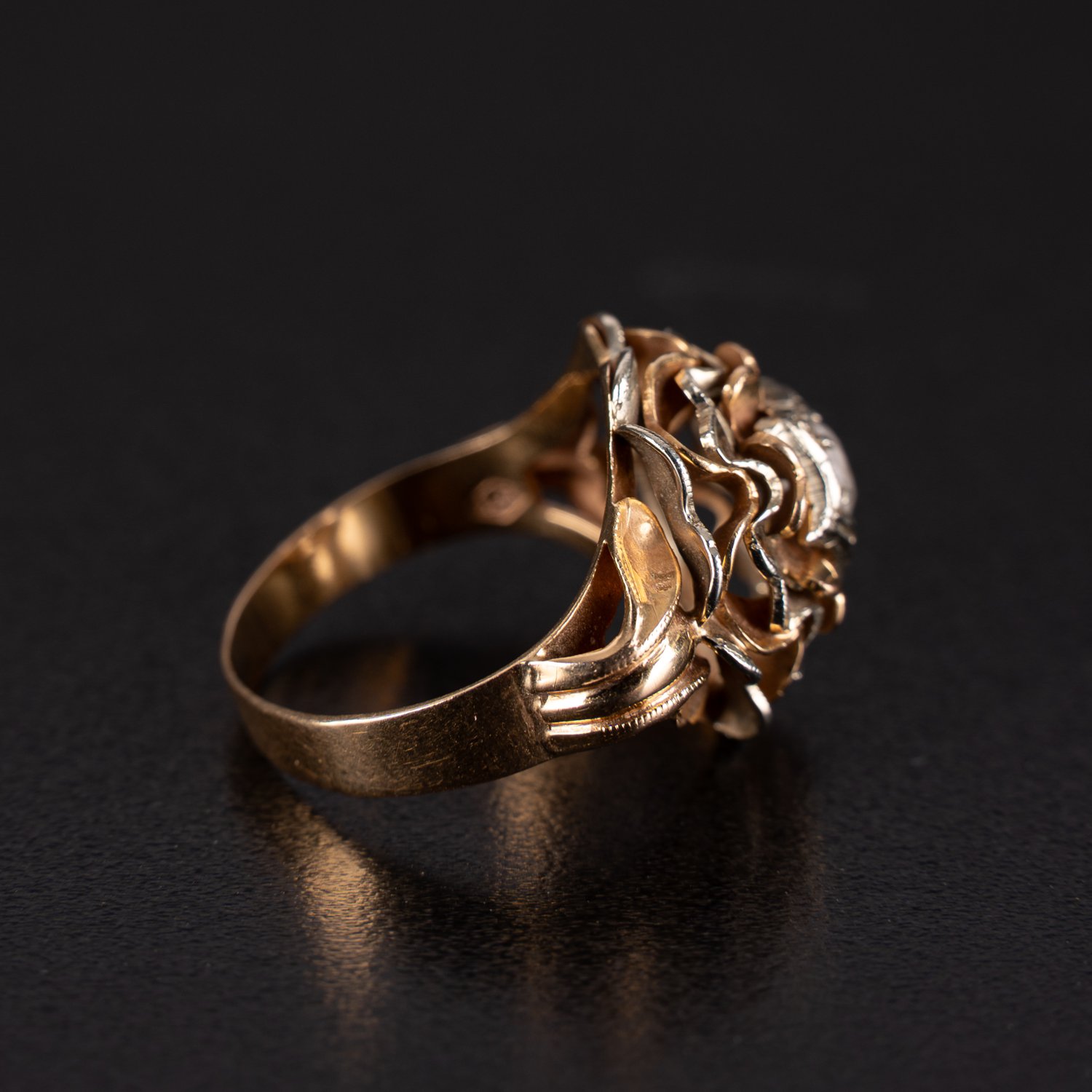 Opulenter Damenring in 585er Gelb- und Rotgold. Ringschultern aufgefächert, Ringkopf in mehreren Schichten blütenartig aufgebaut. Mittig besetzt mit Altschliffdiamant (ca. 0,23ct) in 6-eckiger Fassung. Ringgröße ca. 62, ca. 7,5 gr. brutto ; guter Erhalt.