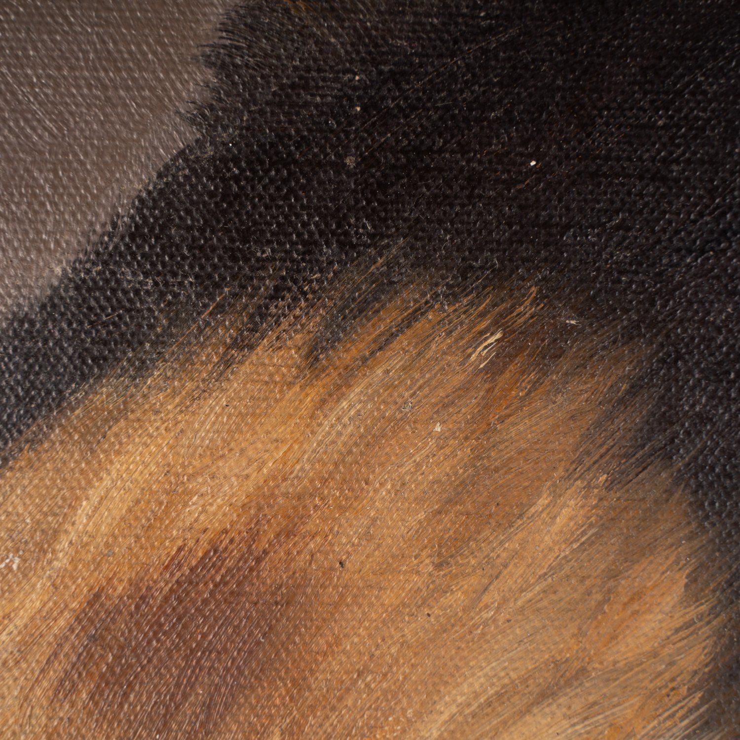 """Junges Elchkalb"" - Gemälde, Öl auf Hartfaserplatte, ca. 74 x 50 cm, unsigniert, dem Braunschweiger Jagd- & Tiermaler, Illustrator & Bildhauer (lt. Klebeetikett) zugeschriebenes Gemälde, Rahmen beigegeben, max. Außenmaß ca. 82 x 58 cm."