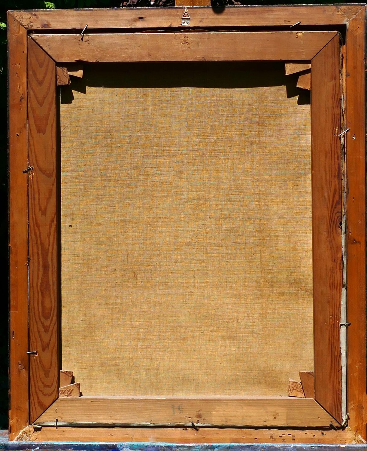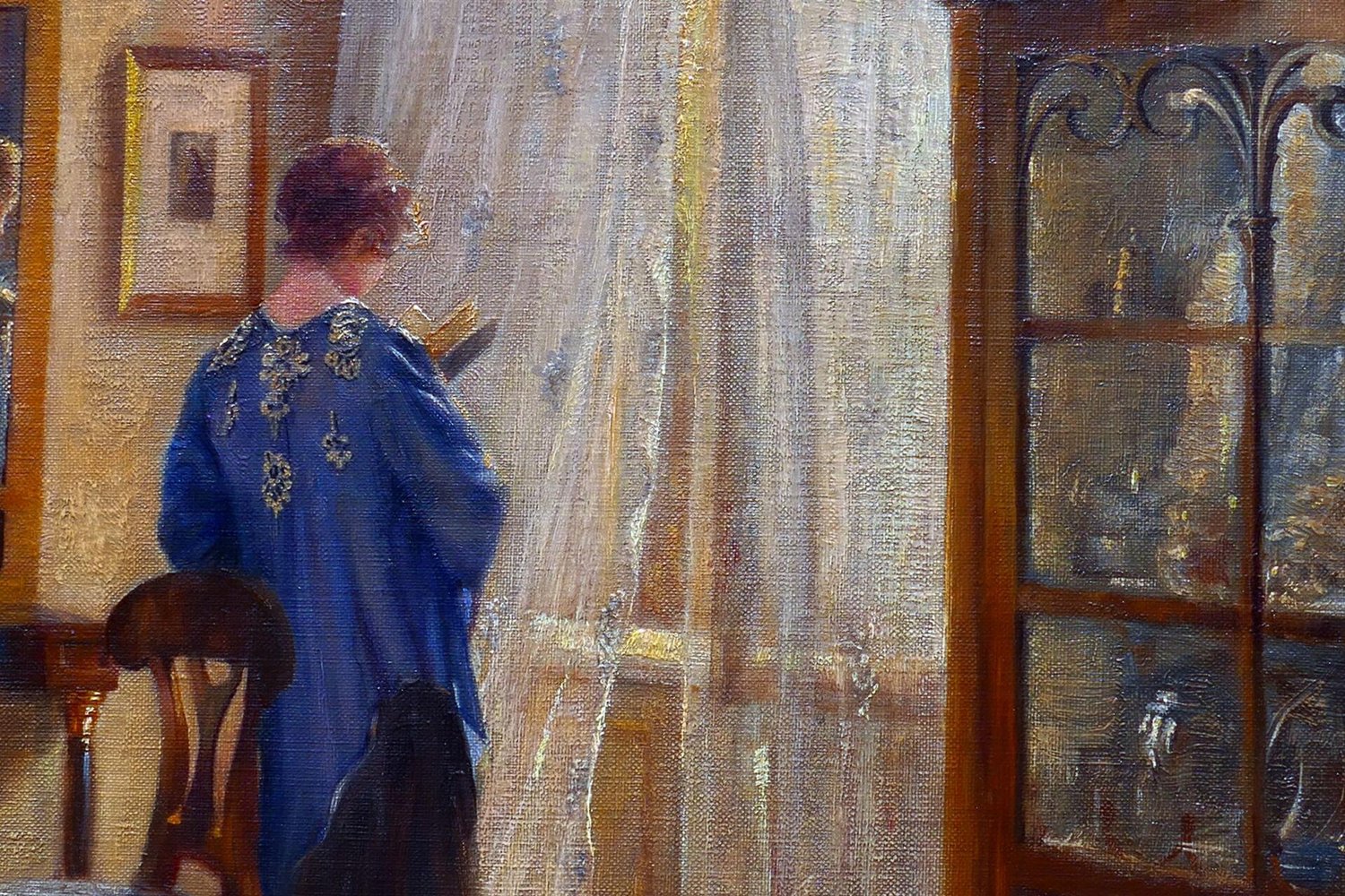 """Lesende junge Frau am Fenster"" in biedermeierlichem Interieur, die wärmenden sommerlichen Sonnenstrahlen geniessend. Gemälde, Öl auf Leinwand, ca. 68 x 55 cm, unten rechts signiert + datiert: ""Leopold Fritz - München 1914"", unbekannter akademischer Münchener Maler des frühen 20, Jhd. Stimmungsvolle detailreiche Malerei mit ausbalanciertem Licht- & Schattenspiel. Unrestaurierter Originalzustand. Goldrahmen beigegeben, max Außenmaß ca. 77 x 63 cm. Aus Münchener Privatsammlung stammend."
