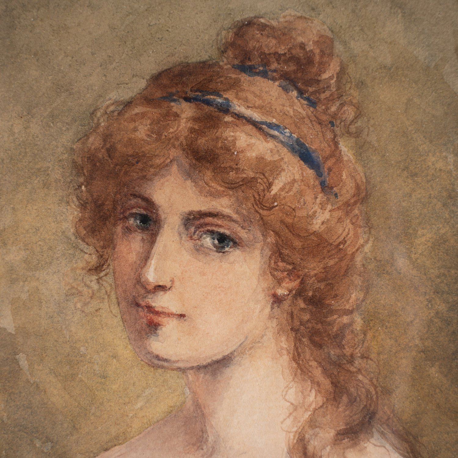 """Junge Schönheit mit grünem Tuch"" - kleinformatiges Gemälde, aquarellierte Bleistiftzeichnung auf Papier / Pappe, lichtes Bildmaß ca. 16 x 10 cm, unten rechts signiert ""Martha van den Bussche"" (war eine belgische Kunstmalerin des 19. Jhd.), Rahmen beigegeben, max. Außenmaß ca. 34 x 28 cm."