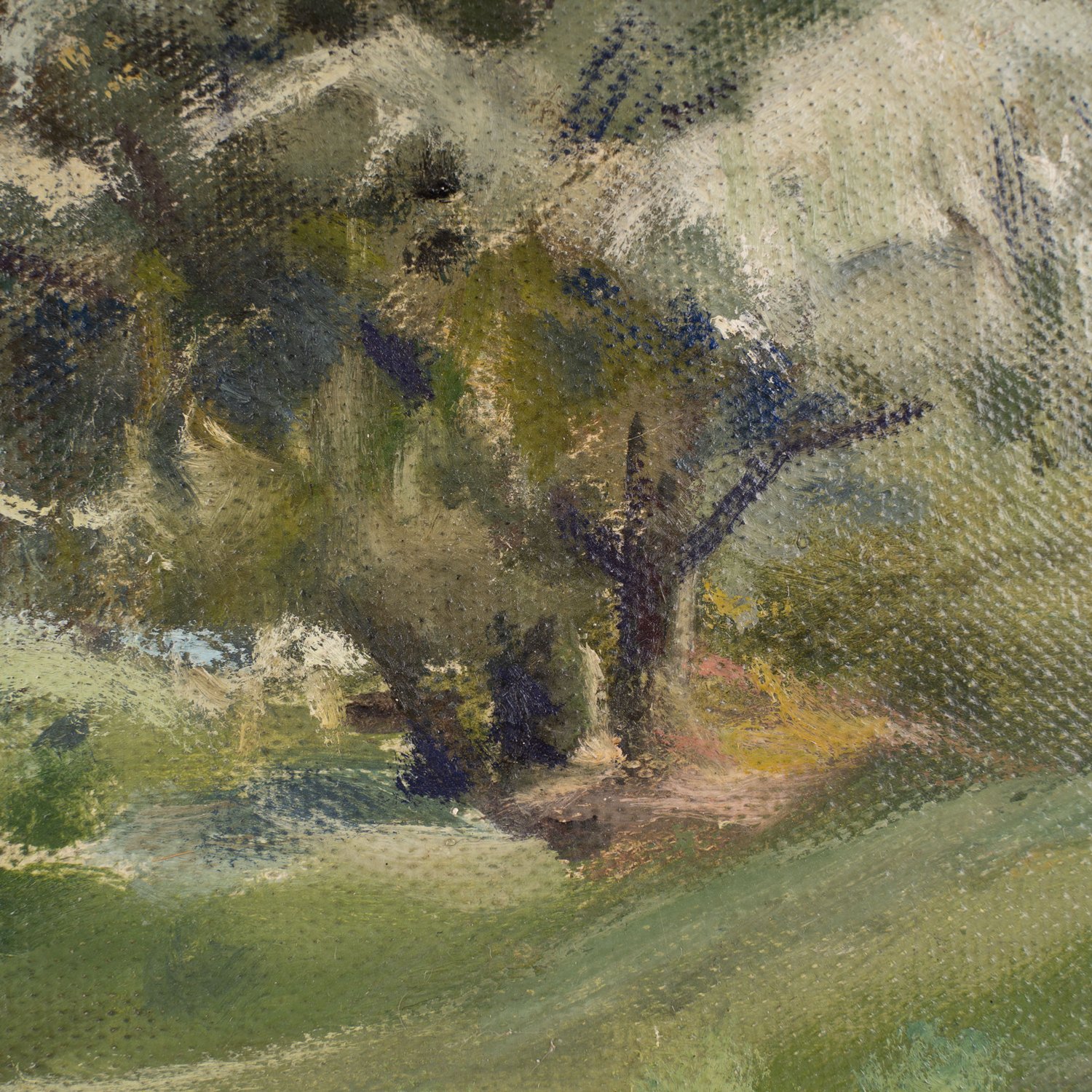 """Sommerliche Landschaft mit Weiher"" - kleinformatiges Landschaftsgemälde des aus Seelze bei Hannover stammendem deutschen Malers Adolf Wissel (1894 - 1973), Öl auf Schichtholzplatte, ca. 35 x 43 cm, unten rechts signiert und datiert ""A. Wissel (19)46"", Rahmen beigegeben, max. Außenmaß ca. 43 x 50 cm."