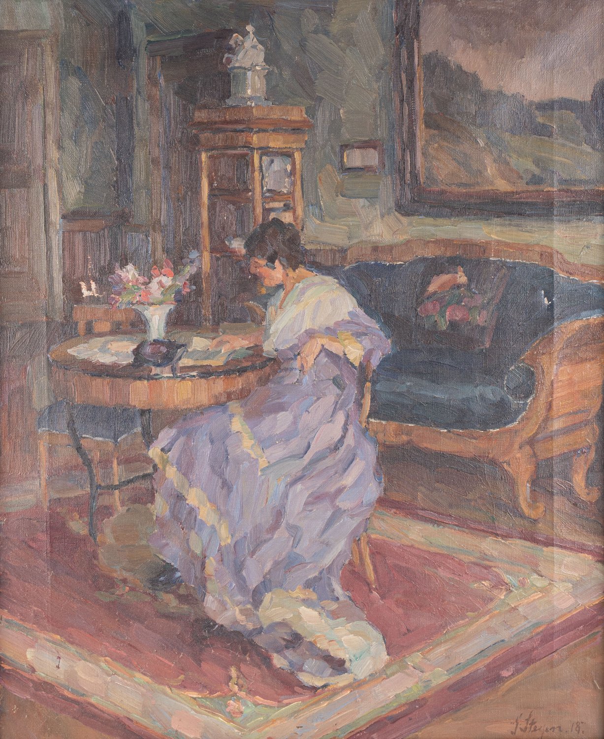 "Biedermeierliches Interieur mit lesender Dame, Gemälde Öl auf Leinwand ; unten rechts signiert und datiert: G. Stegen (19)18 ; wohl Gertrud Koken-Stegen (1888 - 1956), war Mitglied der hannoverschen Malerfamilie Koken. ca. 52 x 43 cm. Auf dem Keilrahmen Reste eines Papieraufklebers: ""Herbstausstellung"" 1924 des K.V.H. (Kunstverein Hannover). Leinwand minimal beschädigt (siehe Detailfotos) ; original Rahmung beigegeben, max. Außenmaß ca. 64 x 54 cm. Aus hannoverschem Privatbesitz."