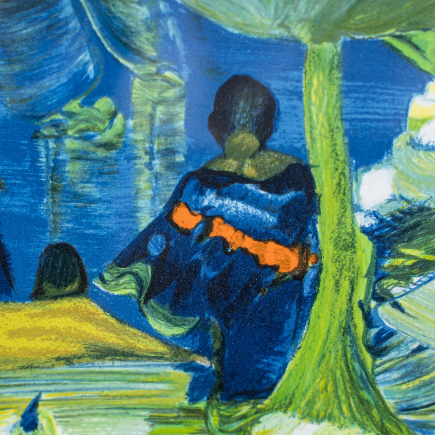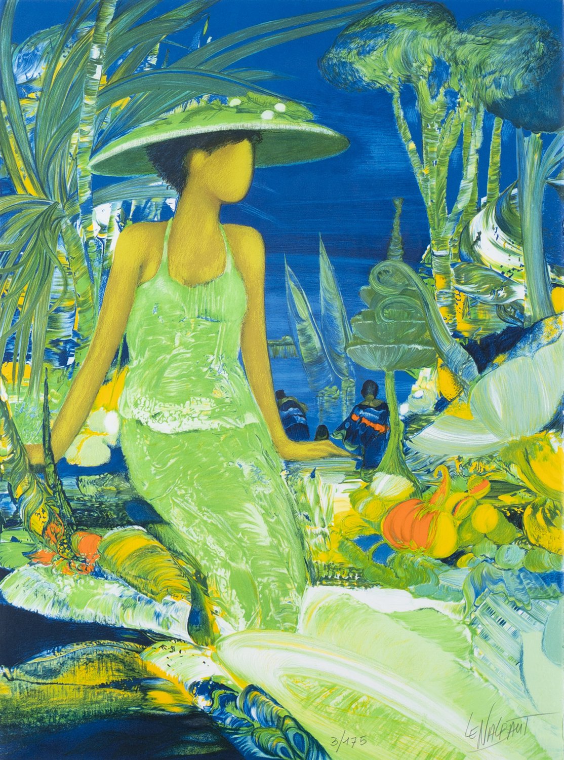"""Dame mit grünem Hut"" in exotischer Landschaft - großformatige, multiple Farblithographie des Gerard le Nalbaut (geb. 1946 Lorient), unten rechts der Mitte nummeriert ""3 / 175"" und handsigniert ""Le Nalbaut"", Platte ca. 76 x 56 cm, Passepartout, Rahmen beigegeben, max. Außenmaß ca. 104 x 82 cm."