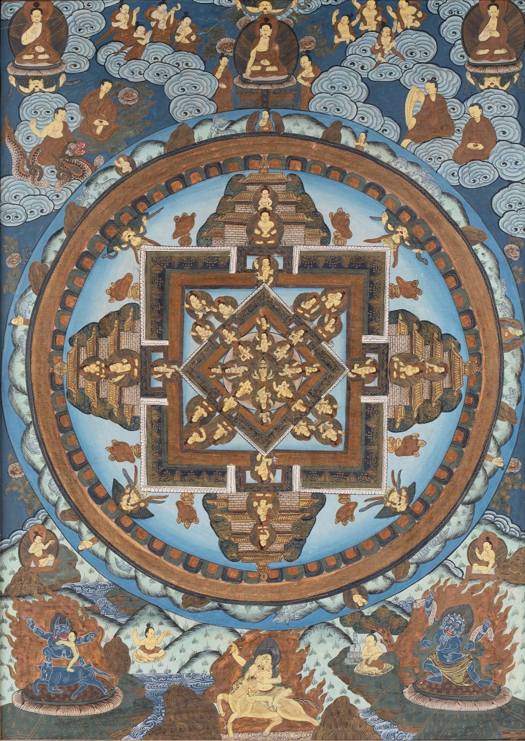 Tibetanische Thangka - detailreich, von Hand gemaltes asiatisches Heiligenbild, lichtes Rahmeninnenmaß ca. 60 x 43 cm, Rahmung beigegeben, max. Außenmaß ca. 68 x 51 cm. 20. Jhd.