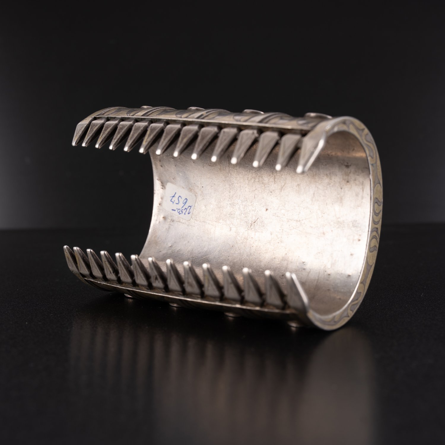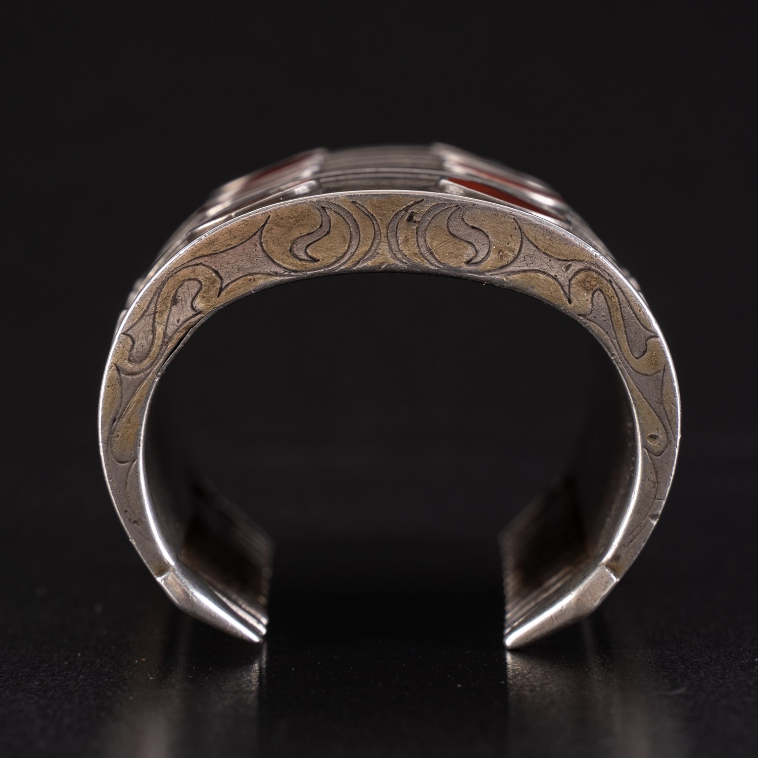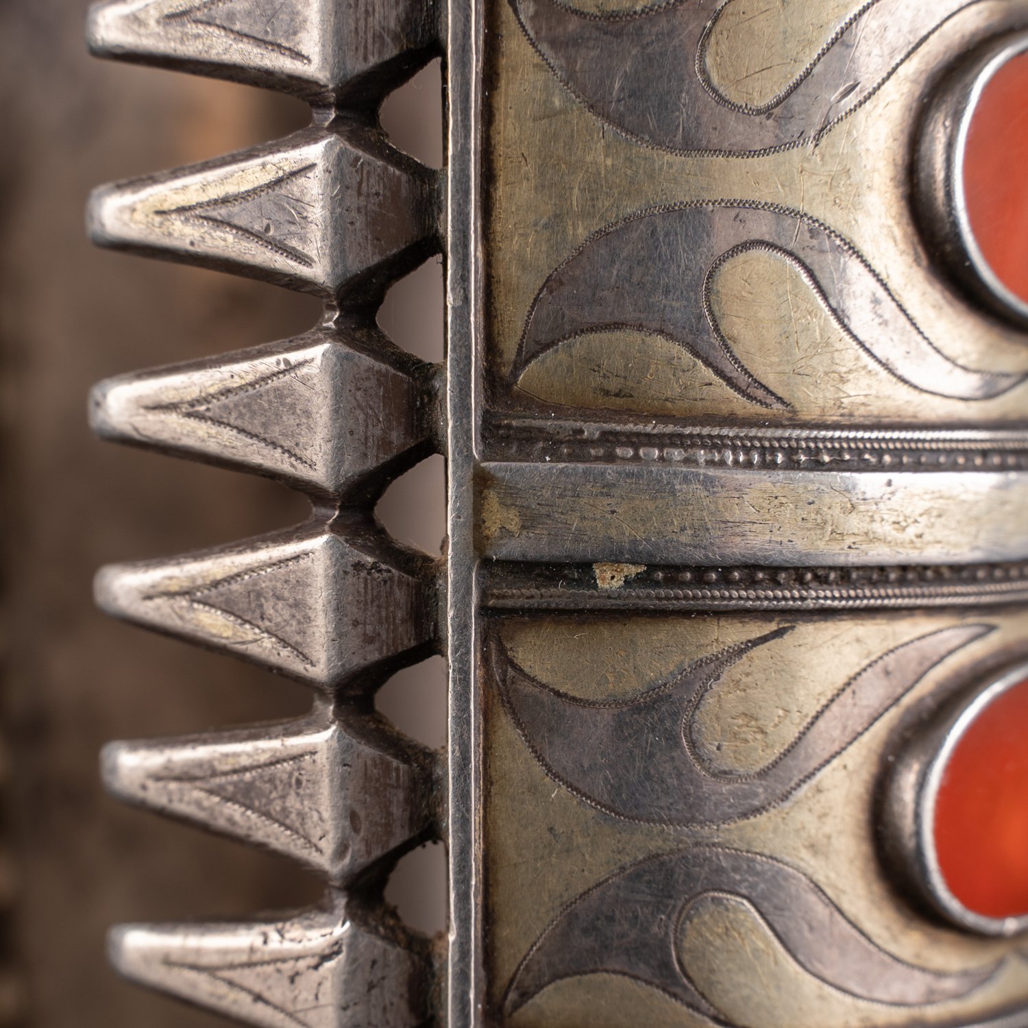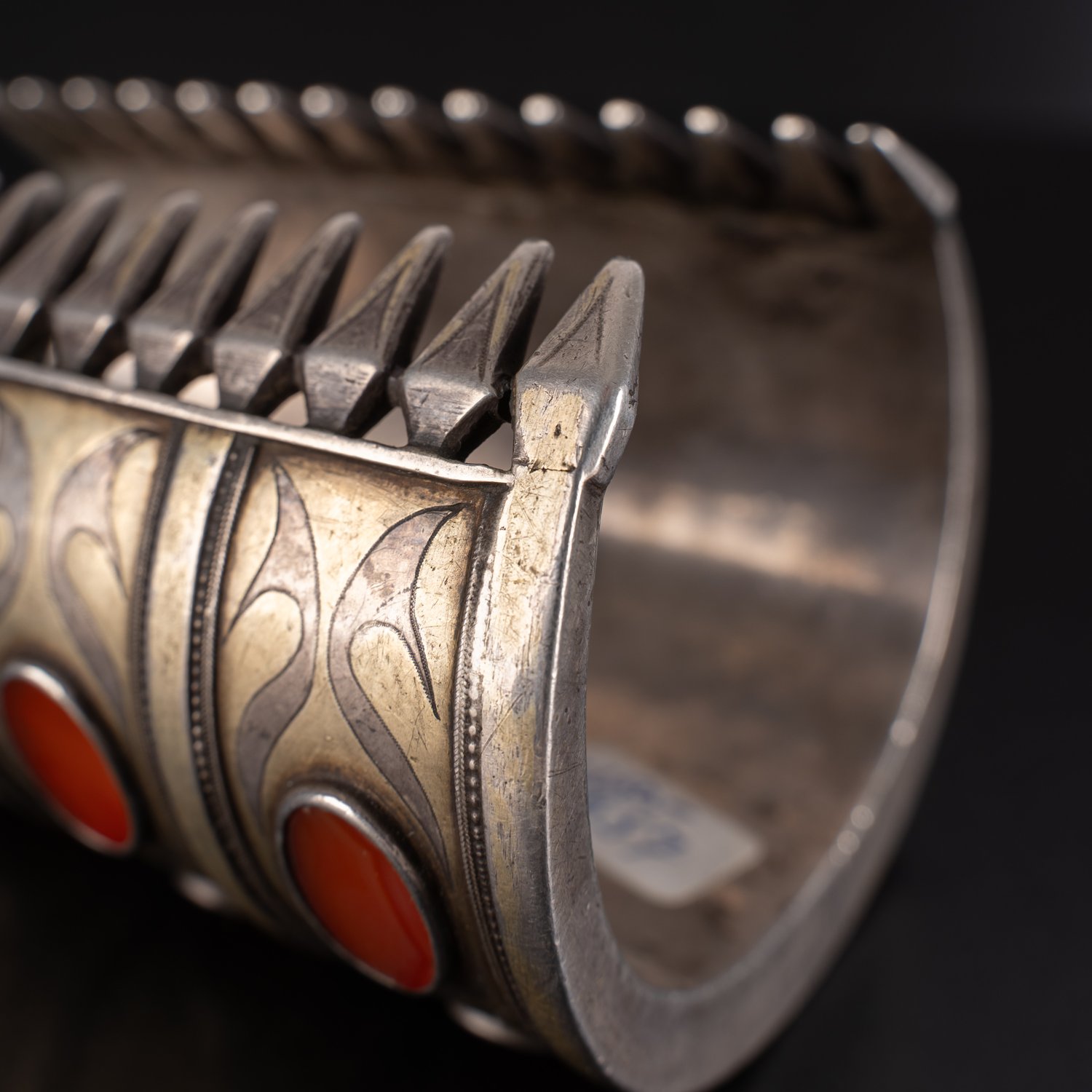 "Paar ""Belarzik - iki Koschma"", Turkmenistan Silber, Paar manschettenartiger, ca. 11 cm lange Armreifen, jeweils 4 Felder mit je 4 eingefassten Karneol-Platten, aufwendige Gravur-Dekore, mit Resten von Vergoldung, aus norddeutscher Privatsammlung, sehr schöner getragener Erhalt, zusammen ca 626 gr. brutto. Handseitig feiner Dekor, Ellenseitig mit arabischer Schriftmarke. Geringe altersbedingte Gebrauchsspuren."