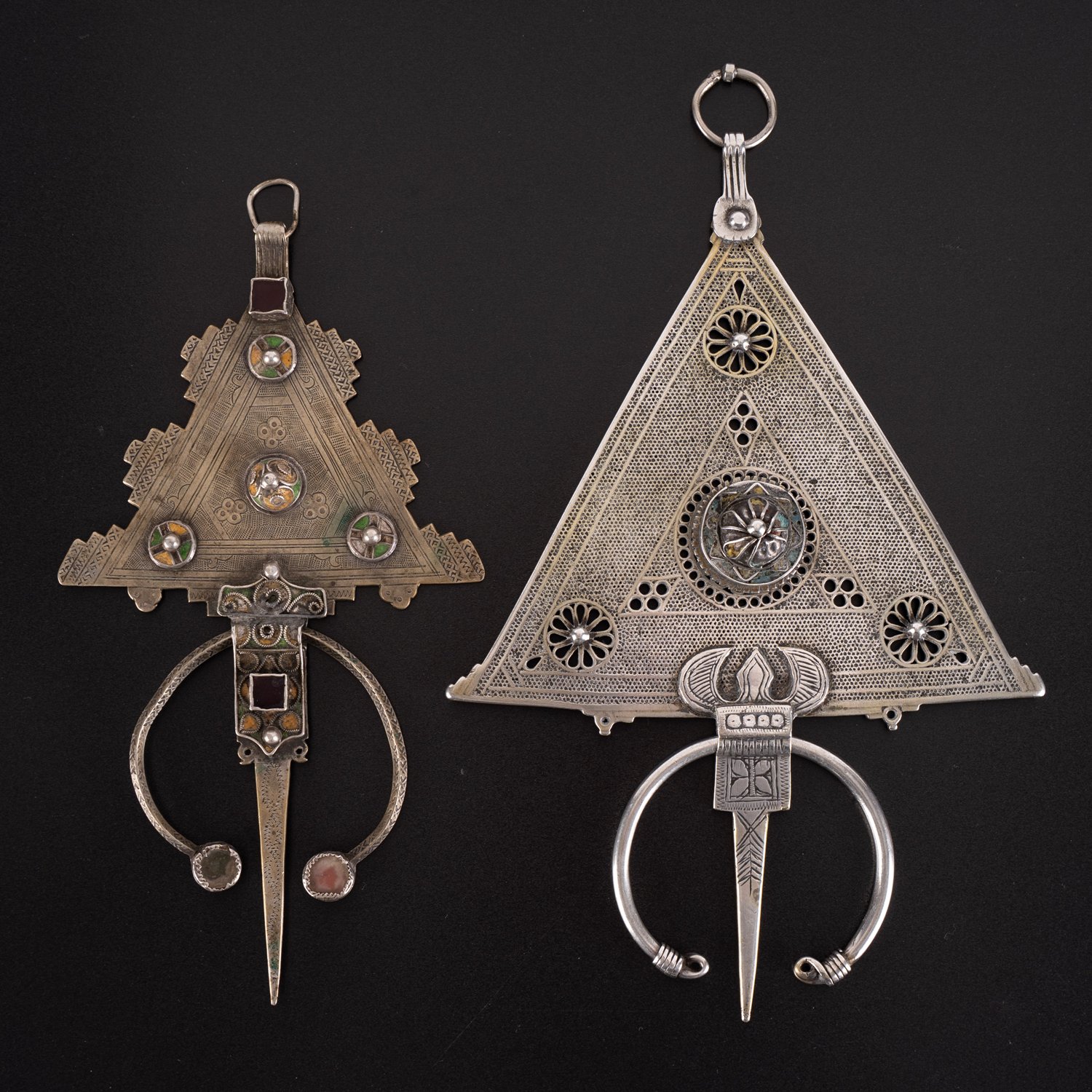 Zwei verschiedene Fibeln, mehrteilige Fertigung aus verschiedenen Silberlegierungen, Nordafrika, wohl 1. Hälfte 20. Jhd., Die Größere mit Resten von Emaille, die Kleinere partiell emailliert und mit Farbsteinbesatz. Verschiedene Alter, Größen, Legierungen und Erhalt. Länge ca. 23 bzw. ca. 27 cm, zusammen ca. 412 gr. brutto.