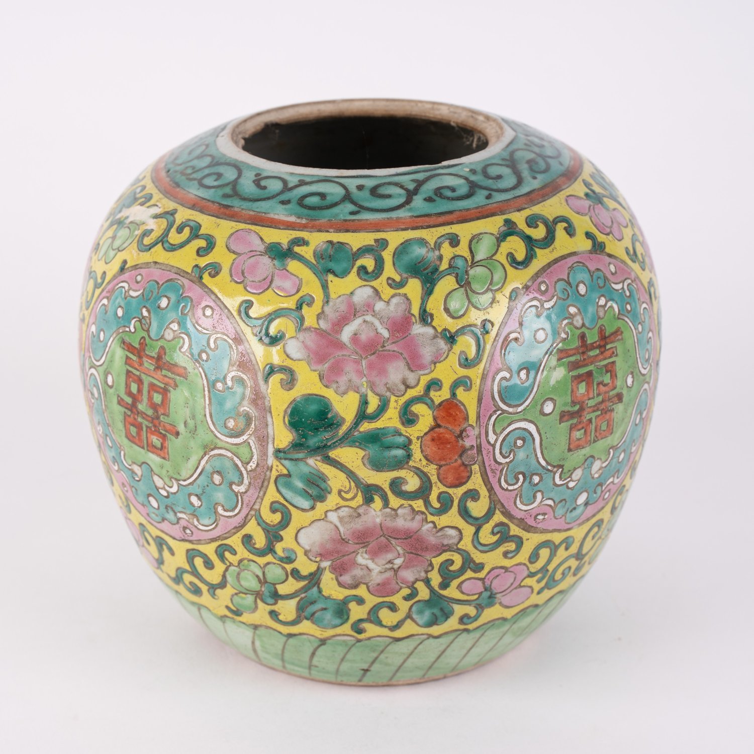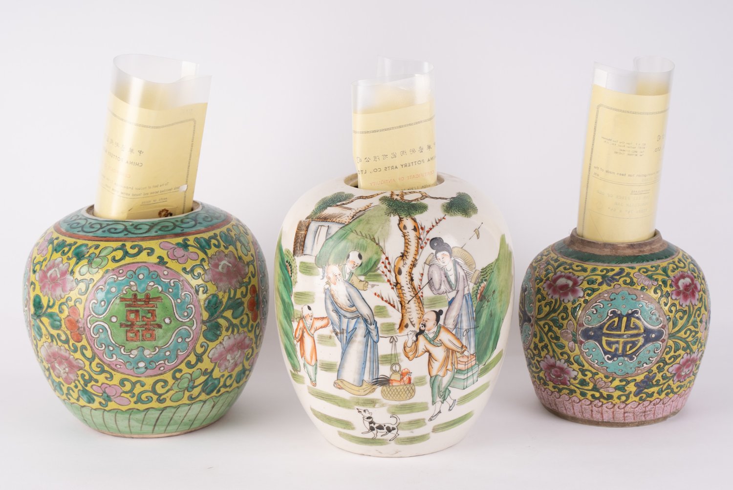 "3-teilige Sammlung verschiedener antiker Vorratsgefäße, sogenannte ""Ingwer-Jars"", China, 19. Jhd., alle ohne Deckel, 2x mit Emaillefarben staffiert. Verschiedene Alter, Größen und Erhalt. Höhe von ca. 16,5 bis ca. 23 cm. Alle mit Zertifikat der ""China Pottery Arts Co. Ltd."", Hongkong aus 1993."