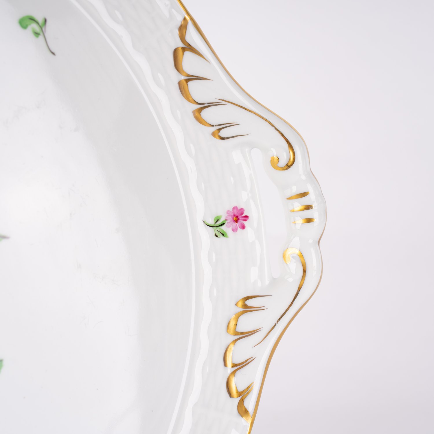 Runde Kuchenplatte / Tortenplatte, Herend, ungarisches Weißporzellan mit polychromer Blütenmalerei und Golddekor. Sehr schöner Erhalt, Durchmesser ca. 28 Länge ca. 32 cm.