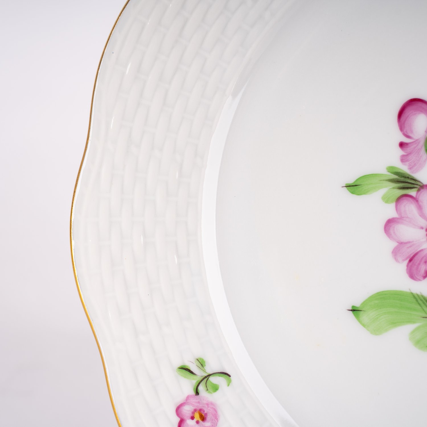 Folge von 6 Kuchentellern, Herend, ungarisches Weißporzellan mit polychromer Blütenmalerei und Golddekor, sehr schöner Erhalt, Durchmesser ca. 19 cm.