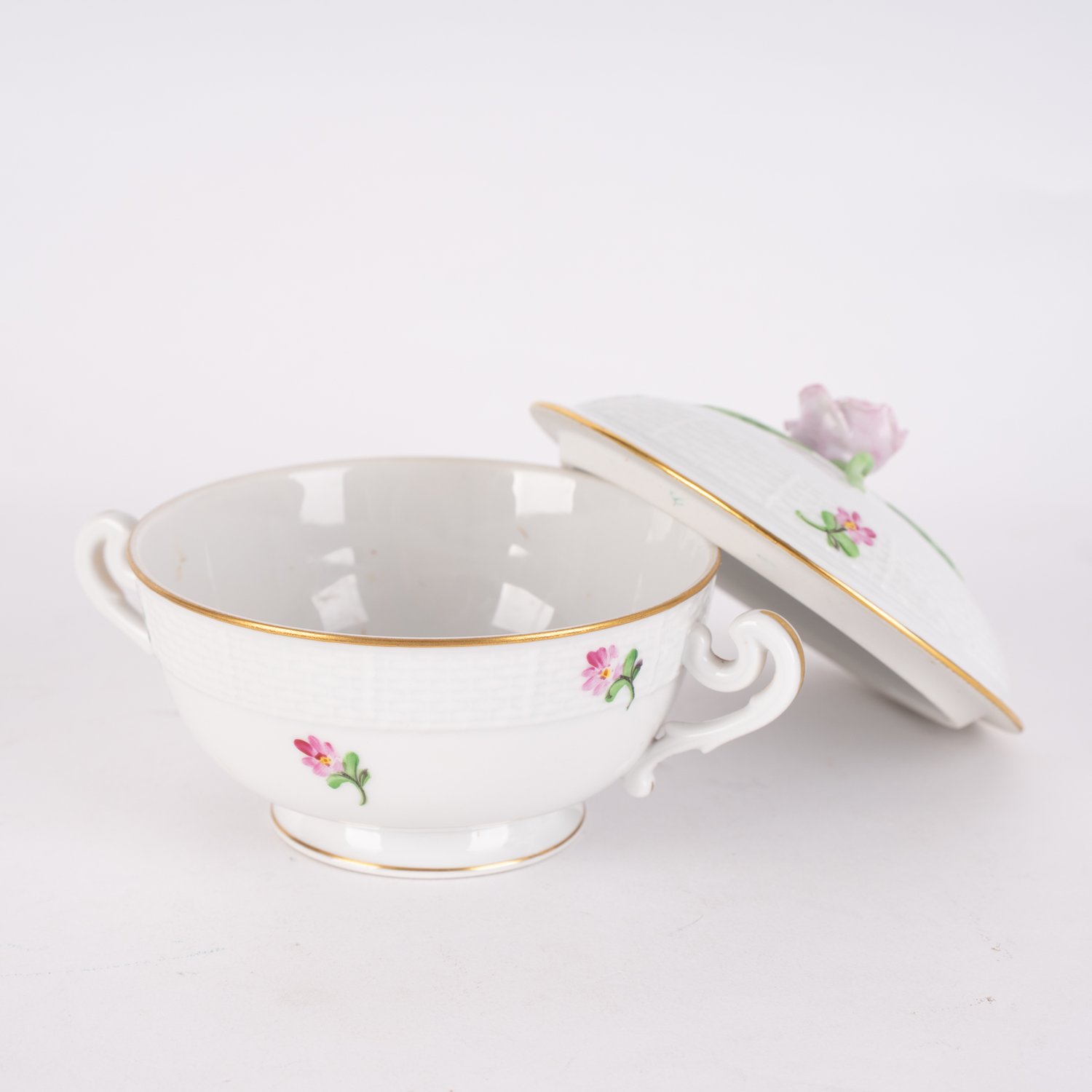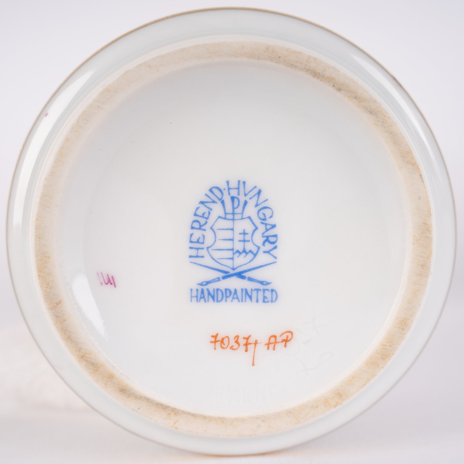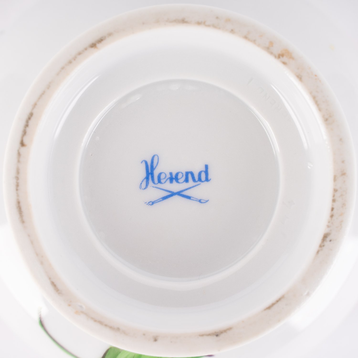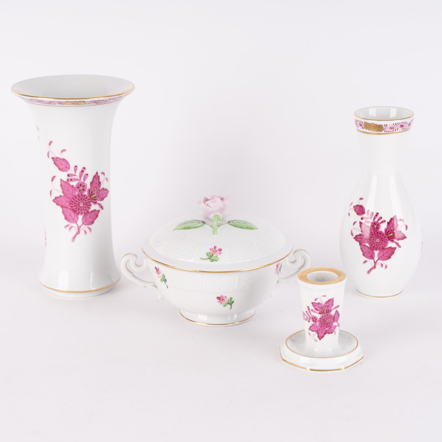 4-teiliges Konvolut verschiedener Herend - Porzellanteile, ungarisches Weißporzellan mit teils polychromer Malerei, bestehend aus 2 Vasen (Höhe ca. 15 bzw. ca. 17 cm), Tischkerzenleuchter (Höhe ca. 6 cm) und gedeckelter Suppentasse (Länge ca. 15 cm), verschiedene Alter, Größen, Dekore, Formen und Erhalt.