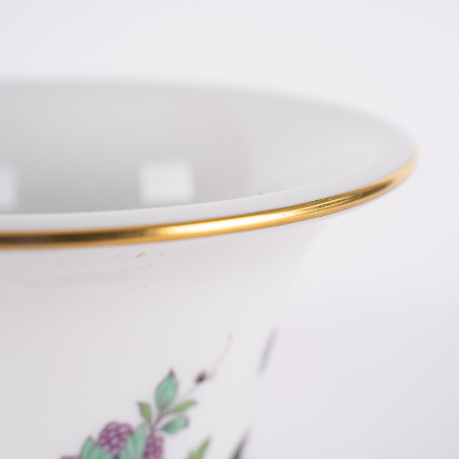 "Zylindrische Tischvase, Meissen, Schwertermarke, 1. Wahl, Modellno. 50034, sächsisches Weißporzellan mit polychromer ""asiatischer Malerei"" und Golddekor. Sehr schöner Erhalt. Höhe ca. 13,5 Durchmesser ca. 11,5 cm."