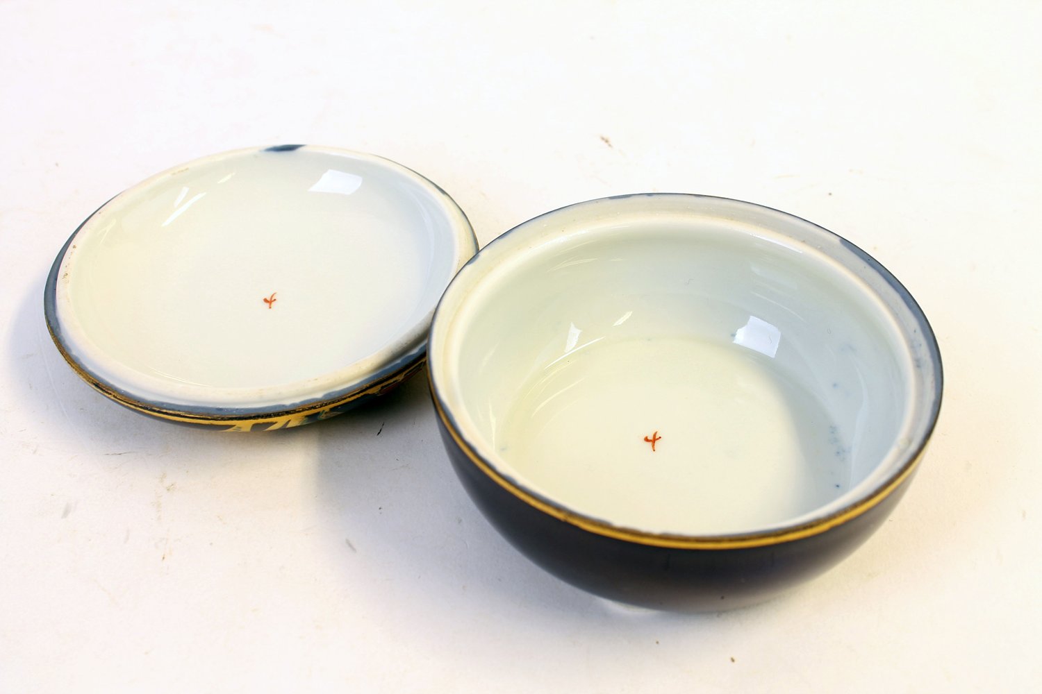 Kobaltblaue, flache, runde Deckeldose / Bonboniere, Heubach / Thüringen, kobaltblaues thüringisches Weißporzellan mit aufwändiger Gold- und polychromer Dekormalerei, Höhe ca. 6 Durchmesser ca. 11 cm.