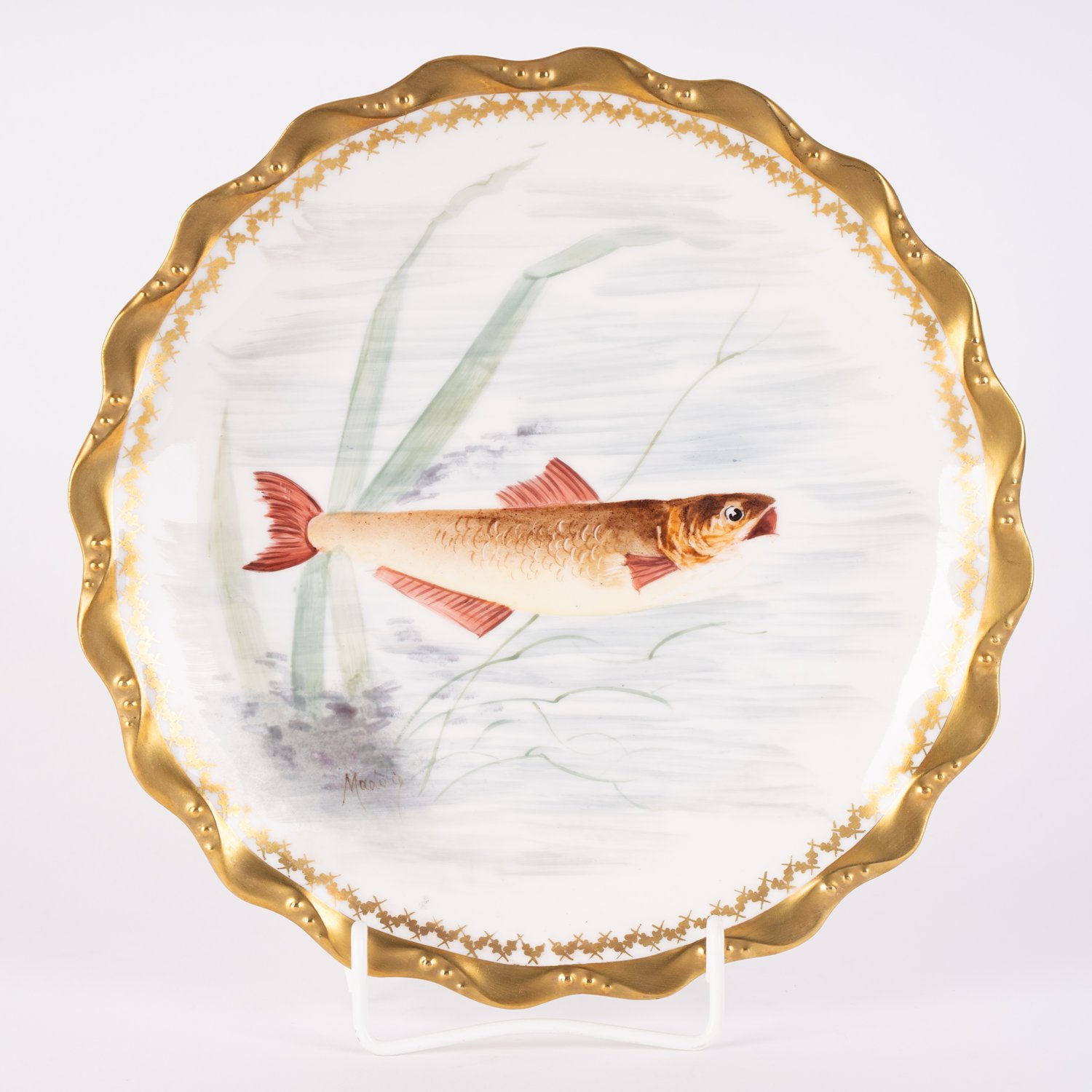 Folge von 3 LIMOGES Fischtellern. Verschiedene Sujets, schön erhaltene Vergoldung, Durchmesser je ca. 24 cm.