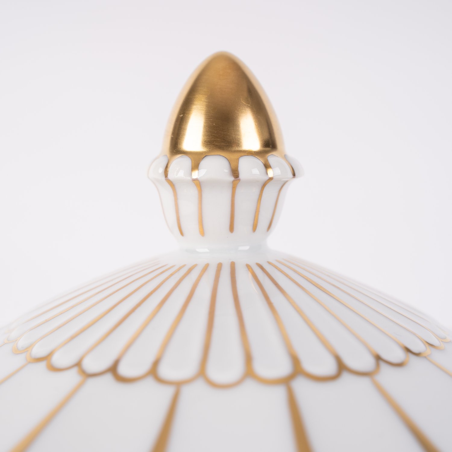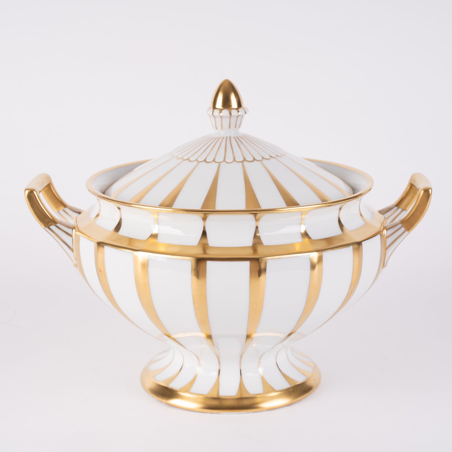 """Grecques Athena"", Terrine oder Gemüseschüssel mit Deckel, Fürstenberg Weißporzellan des 20. Jhd., mit reichem Golddekor. Höhe ca. 21 cm, Durchmesser ca. 26,5 cm (inklusive Henkel) ; sehr schöner Erhalt."