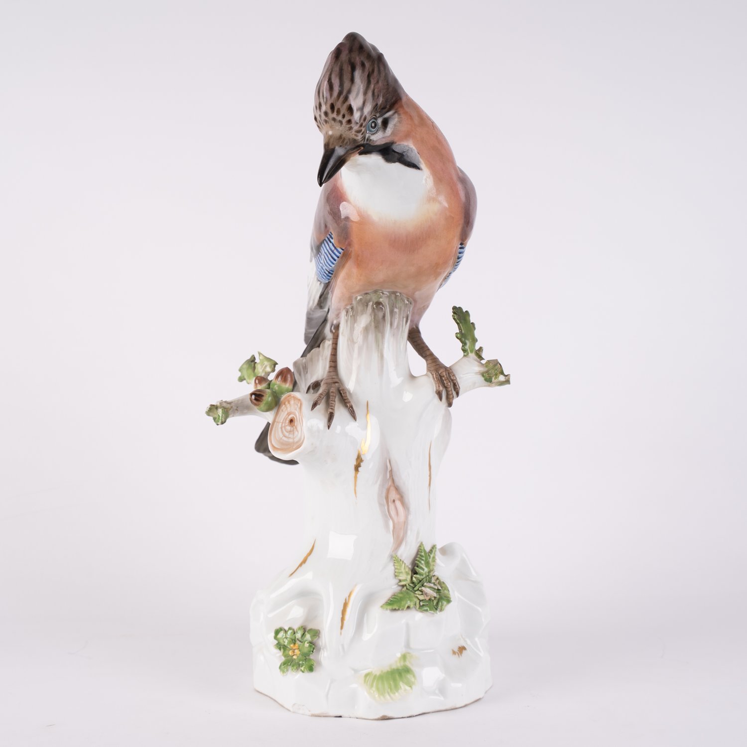"""Großer Eichelhäher"", Meißen Schwertermarke 1. Wahl, Höhe ca. 38,5 cm. Sächsisches Weißporzellan mit polychromer Staffage und dezentem Gold-Dekor. Auf felsigem, vom plastischen Blattwerk geschmückter Sockel in Form eines Eichenstammes sitzender Eichelhäher in naturalistisch wirkender Pose. Der Entwurf von August Ringler, 1863. Im Stamm Modell-Nr.: F104B sowie Schwertermarke. Insgesamt schöner unrestaurierter Fundzustand. Mehrere Blätter, eine Schwingfederspitze, sowie am Sockel bestoßen bzw. fehlend. Verhältnismäßig seltene Figur von imposanter Größe! Im Sockel Inneren feiner, brand-bedingter Formriss, dieser wohl von der Manufaktur verfüllt. Sonst schöner Erhalt!"