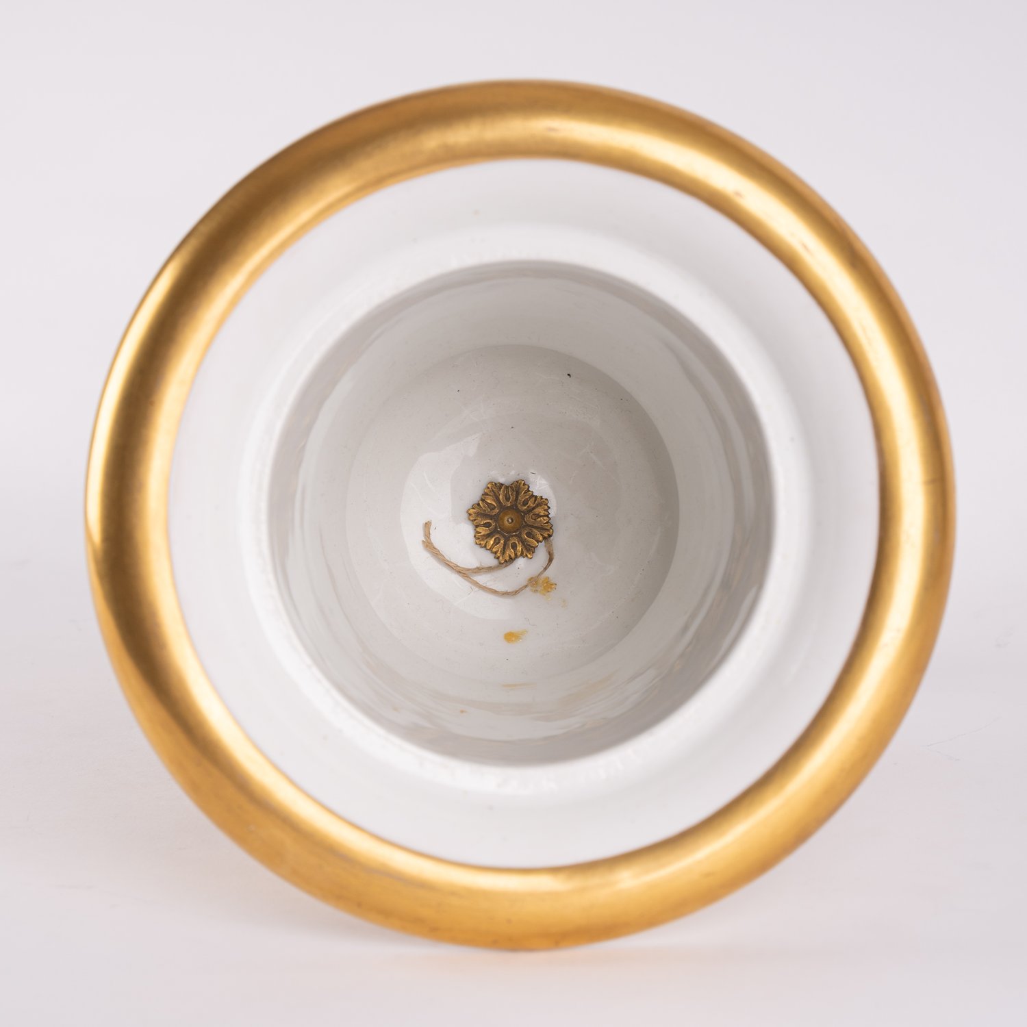 "Redensche Vase mit Berliner-Ansichten der KPM-Berlin, Berlin um 1823 - 1832, 1. Wahl, Verschraubung mit blütenförmiger Bronzerosette, Berliner Weißporzellan mit Chamoisfarbenem Fond, reicher Golddekor, Vorder- und Rückseite mit polychrom gemalten Ansichten ""Das Zeughaus und das Königliche Palais in Berlin"" und ""Das Königliche Schloss in Berlin"" - so jeweils unterhalb der Darstellung in Schwarz betitelt. Bei der Verschraubung sollte der Stoff erneuert werden, partiell winzige Fehlstellen in der Vergoldung (oberer Lippenrand), sonst einwandfreier Patina-Erhalt, unrestaurierter Fundzustand. Höhe ca. 31 Durchmesser ca. 22 cm."